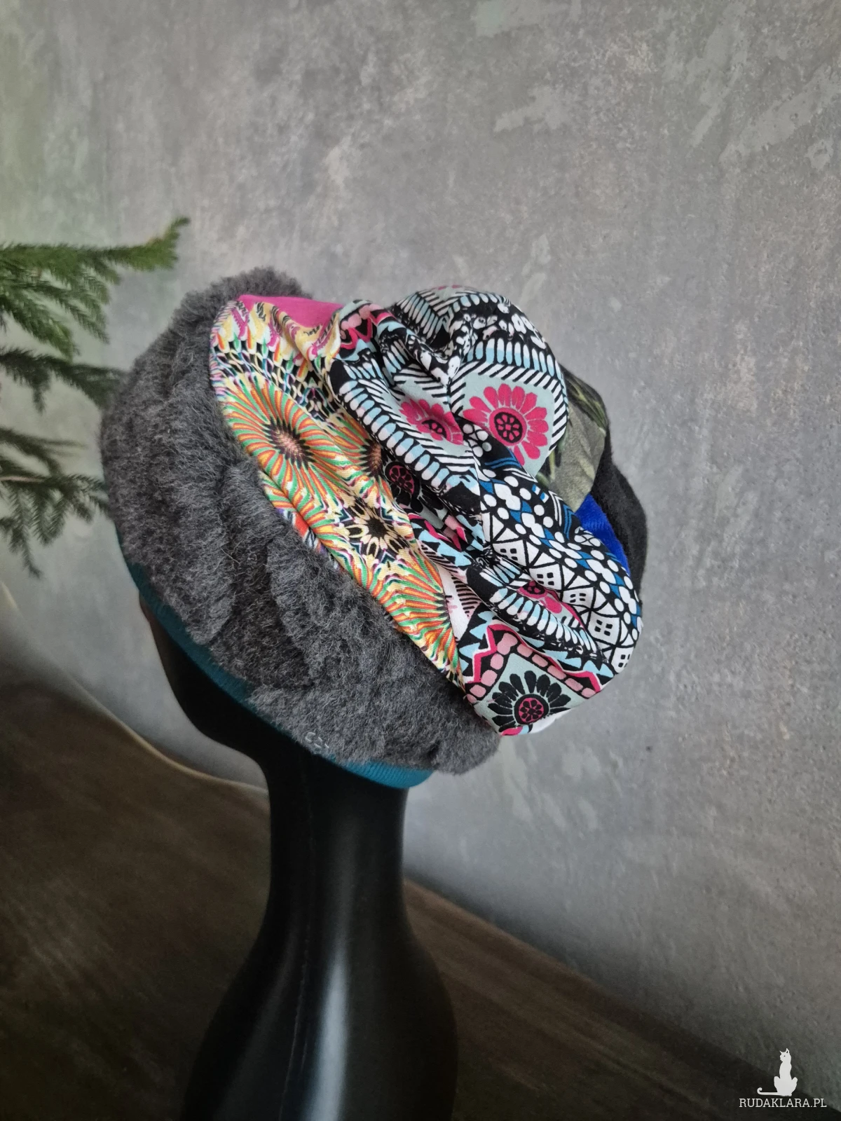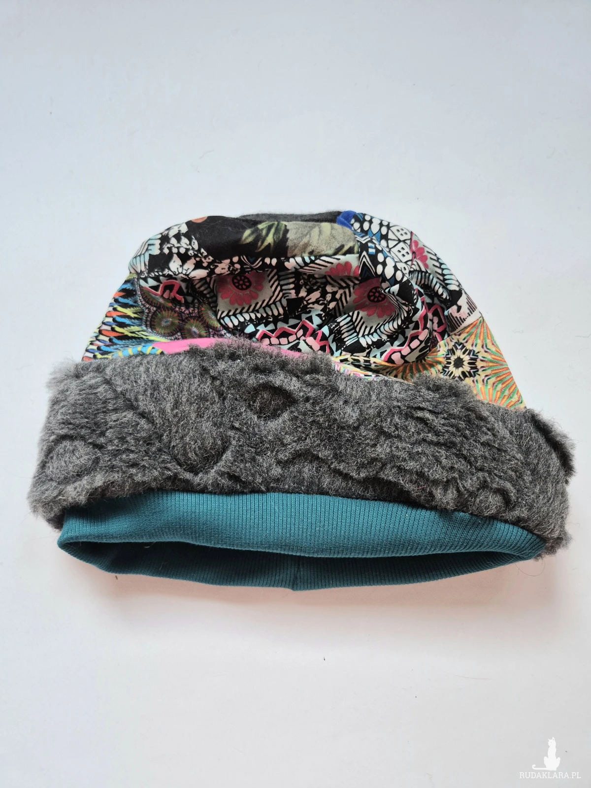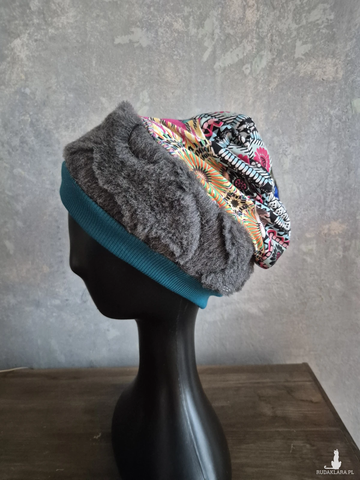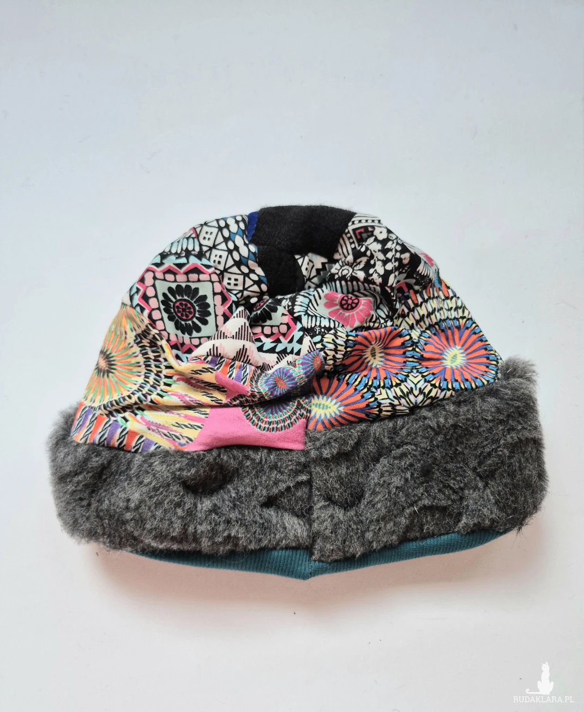 Czapka sztuczne futro połączone z materiałem trochę w marokańskim stylu krótka na podszewce wykończona ściągaczem dobrze trzyma się głowy trzeba lubić takie szalone czapki polecam Box D1