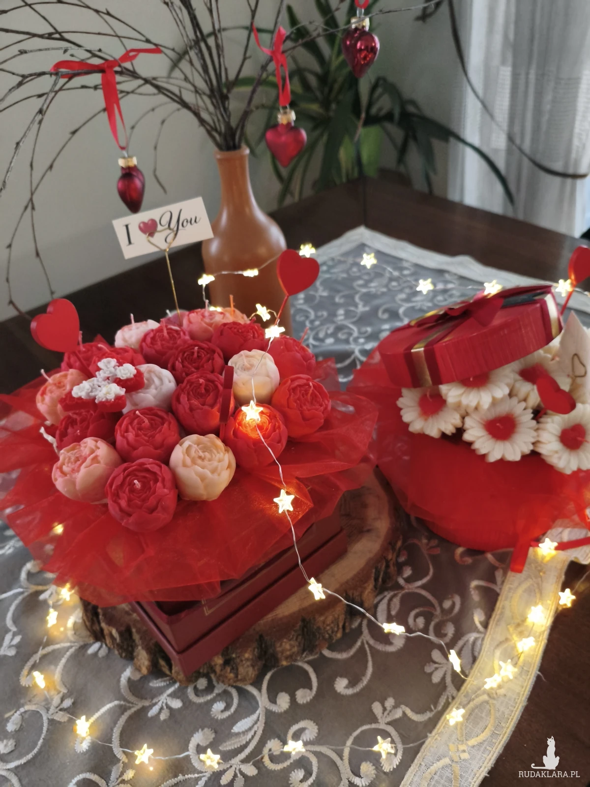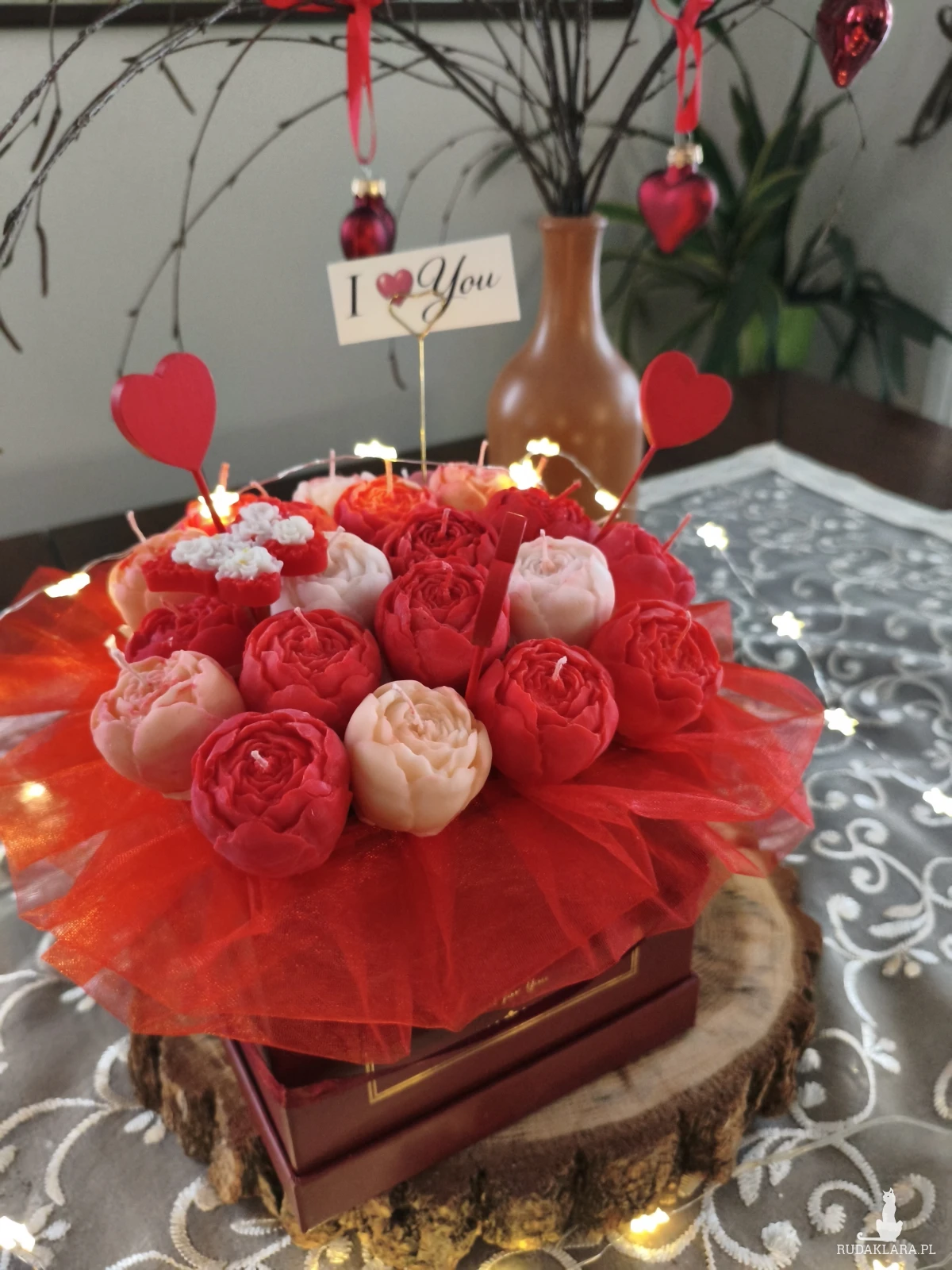 Flower box zawiera główki kwiatów które po wyciągnięciu z bukietu można zapalić. Flower box wysyłam zapakowany w celofan, wstążkę i bukiecik ze suszu oraz instrukcją palenia świec - gotowy do wręczenia jako prezent.
