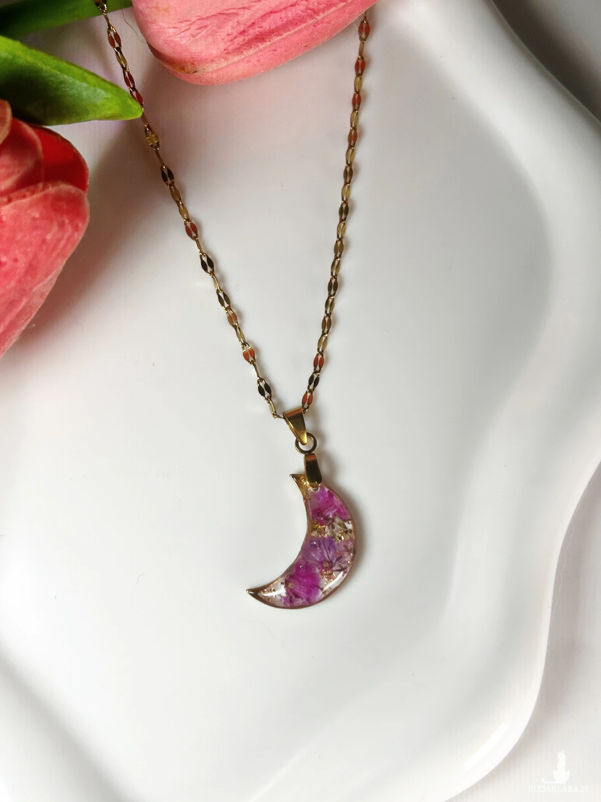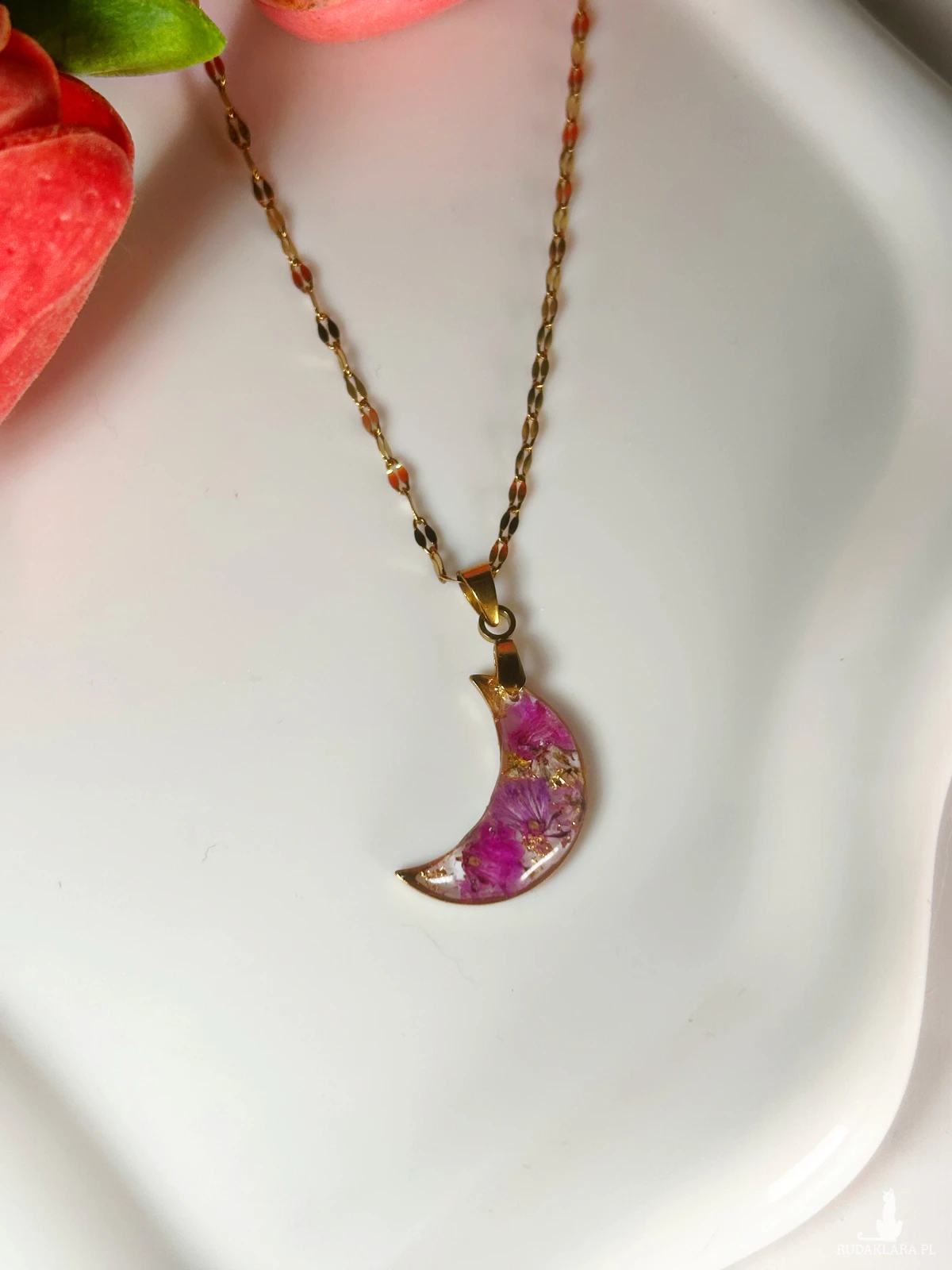 ✨ Ręcznie robiony naszyjnik z prawdziwymi kwiatami zatopionymi w lśniącej żywicy. Całość oprawiona w złoty księżyc zawieszonym na łańcuszku ✨
