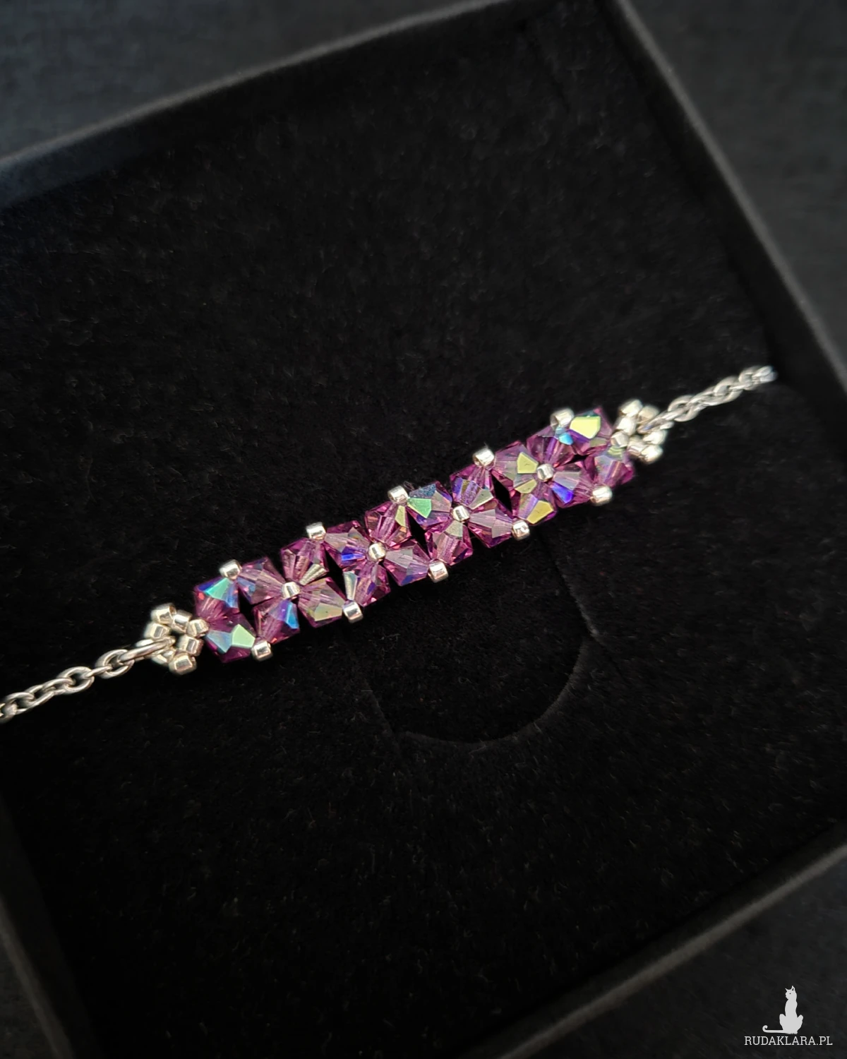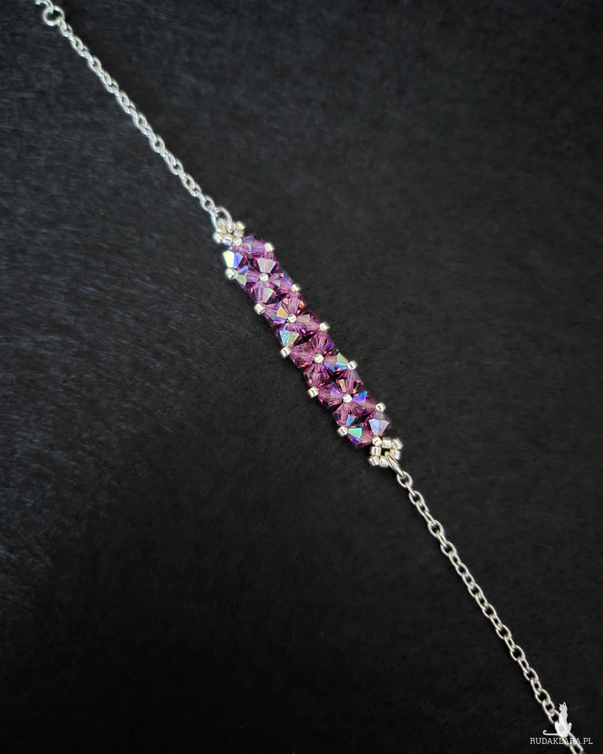 Bransoletka powstaje z kryształków Preciosa w kolorze Amethyst, które dzięki opalizującemu wykończeniu zachwycają wielobarwną grą światła, nadającą biżuterii dynamiczny, szlachetny charakter. Towarzyszą im drobne koraliki Miyuki Delica w srebrnym odcieniu, znane z wyjątkowej regularności i precyzji wykonania.