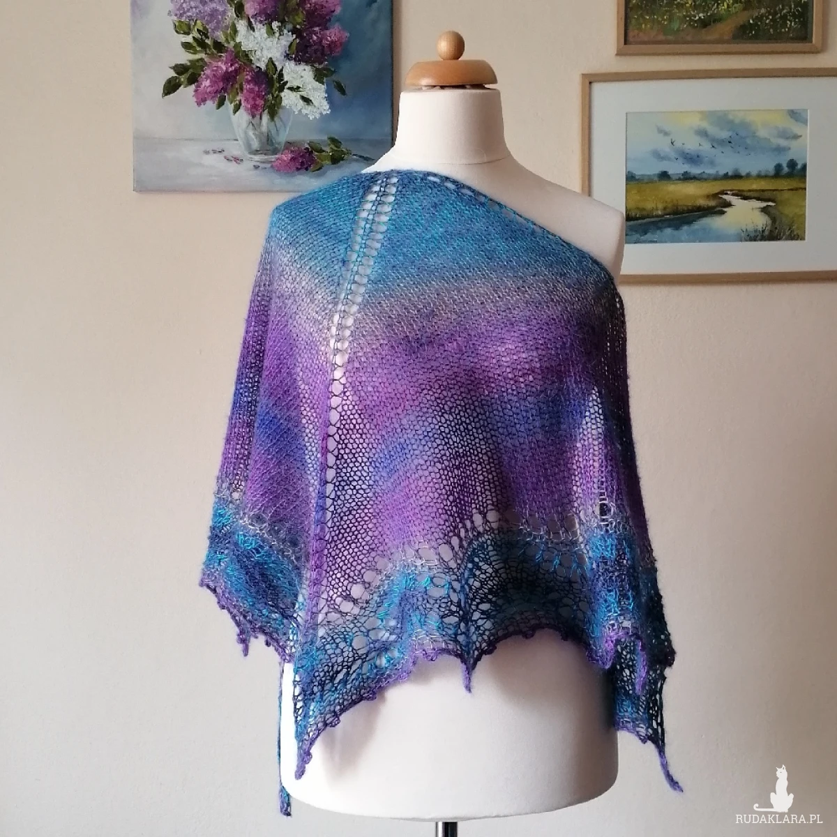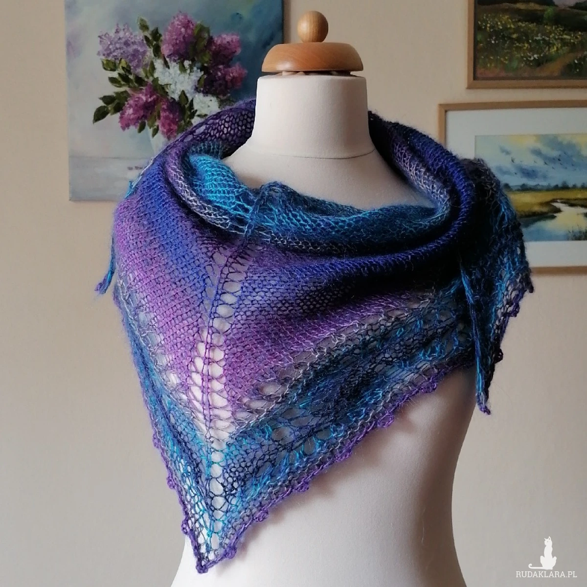 Lekka, miła, a przy tym ciepła chusta wykonana ręcznie na drutach podwójna nitką z delikatnych włóczek produkcji niemieckiej i australijskiej. Skład jednej: 70% moher, 30% jedwab, skład drugiej: 78% australijskiej wełenki i 22% poliamidu. Oryginalna, nasycona, a przy tym nie jaskrawa kolorystyka przyciąga uwagę. Chusta świetnie sprawdzi się o każdej porze roku, do różnych stylizacji. Wymiary chusty: 170 cm. bok najdłuższy, 72 cm wysokość trójkąta. Pranie ręczne.