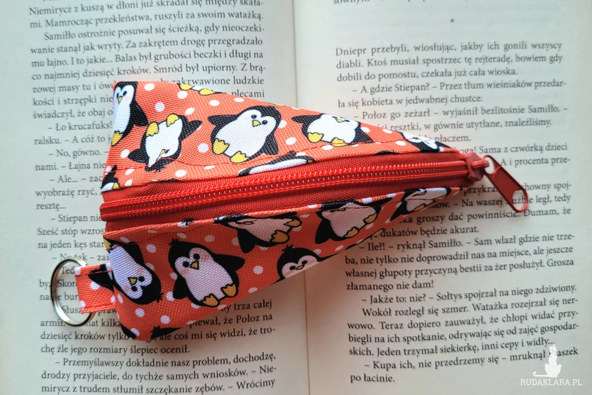 Praktyczne etui na klucze o oryginalnym kształcie wykonane w malutkiej polskiej pracowni. Praktyczny format 15x9 cm zmieści klucze oraz niewielki breloczek. Wykonane z tkaniny wodoodpornej z motywem wesołych pingwinków. Wewnątrz gruba podszewka pełniąca funkcję delikatnego usztywnienia. Kółeczko do przypięcia kluczy wewnątrz oraz na zewnątrz.