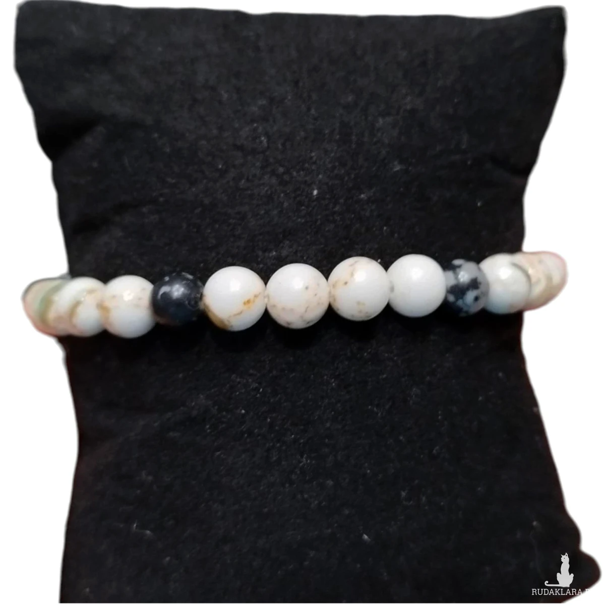 Bransoletka z naturalnych kamieni howlitu oraz obsydianu śnieżnego to elegancka i wyjątkowa biżuteria. Ciekawe kolory czeni z szarymi przetarciami oraz mlecznobiały z brązowo szarymi wstawkami dodają jej uroku.