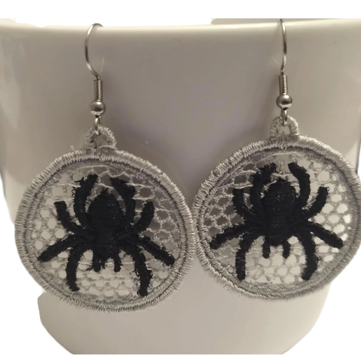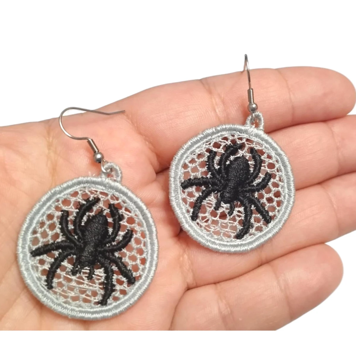 Haftowane szare kolczyki z pająkiem są delikatne i bardzo oryginalne. Z pewnością spodobają się kobietom ceniącym indywidualność oraz modne i nietuzinkowe stylizacje.