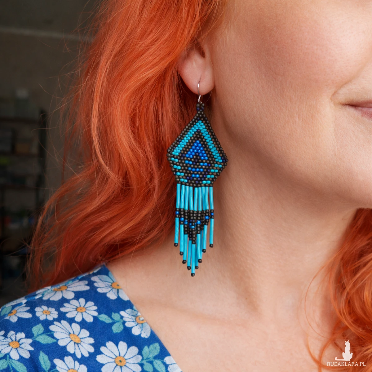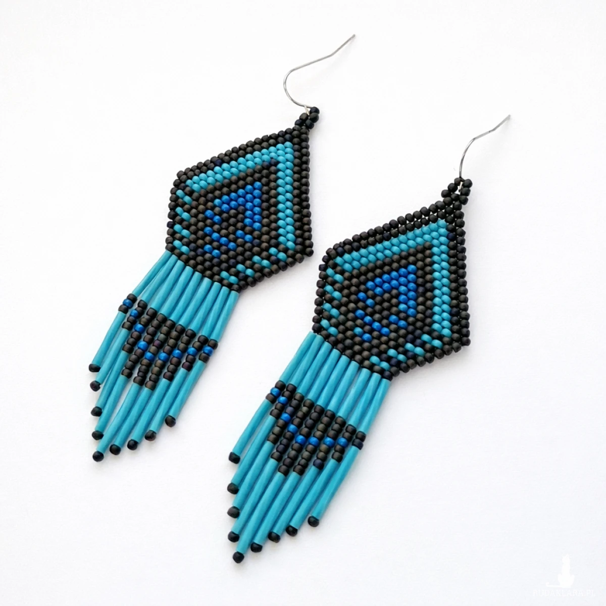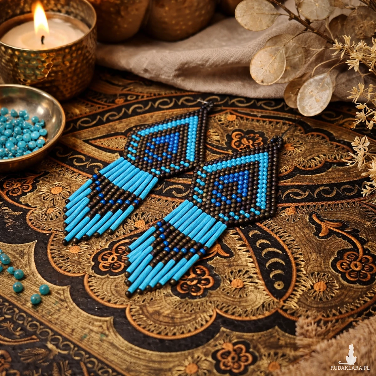 Efektowne kolczyki boho z koralików w odcieniach turkusu i brązu, ręcznie wykonane z dbałością o każdy detal. Geometryczny wzór oraz długie frędzle nadają im wyjątkowy etniczny charakter. Idealne do stylizacji boho, festiwalowych i codziennych.