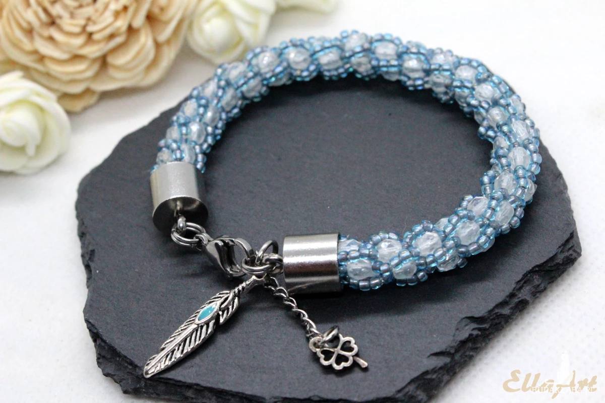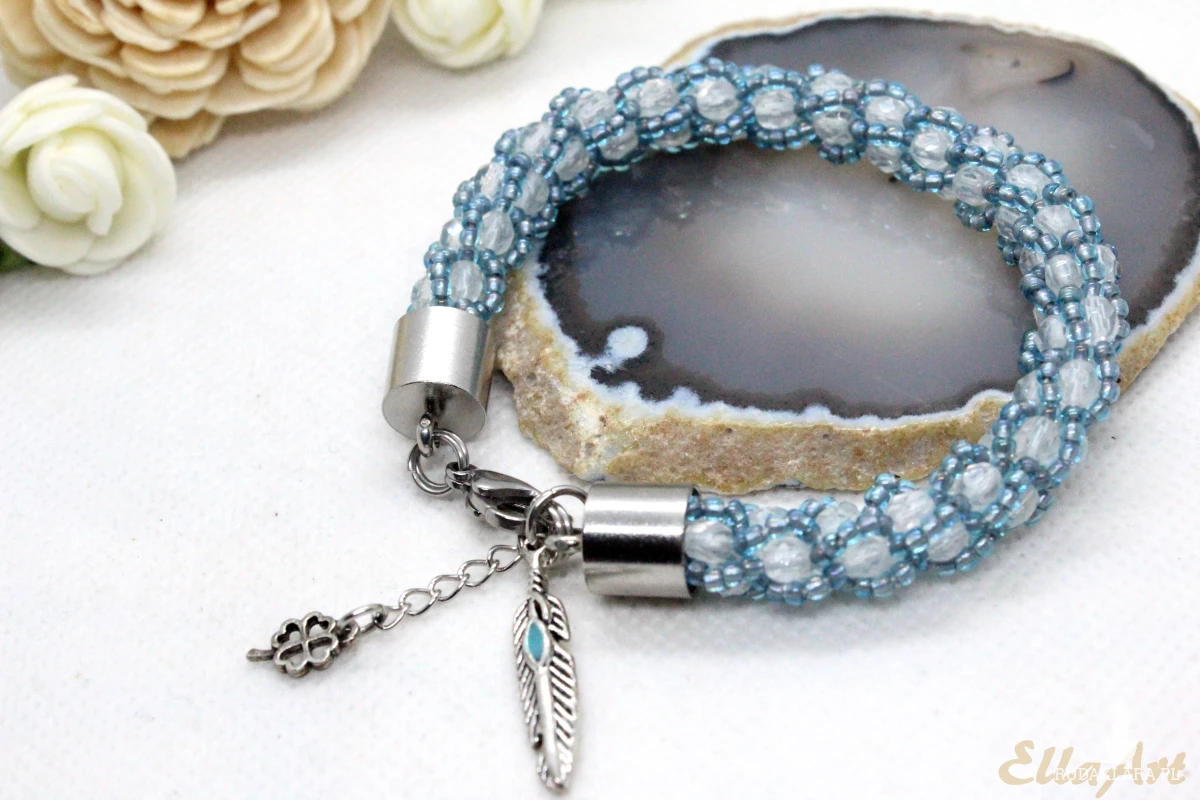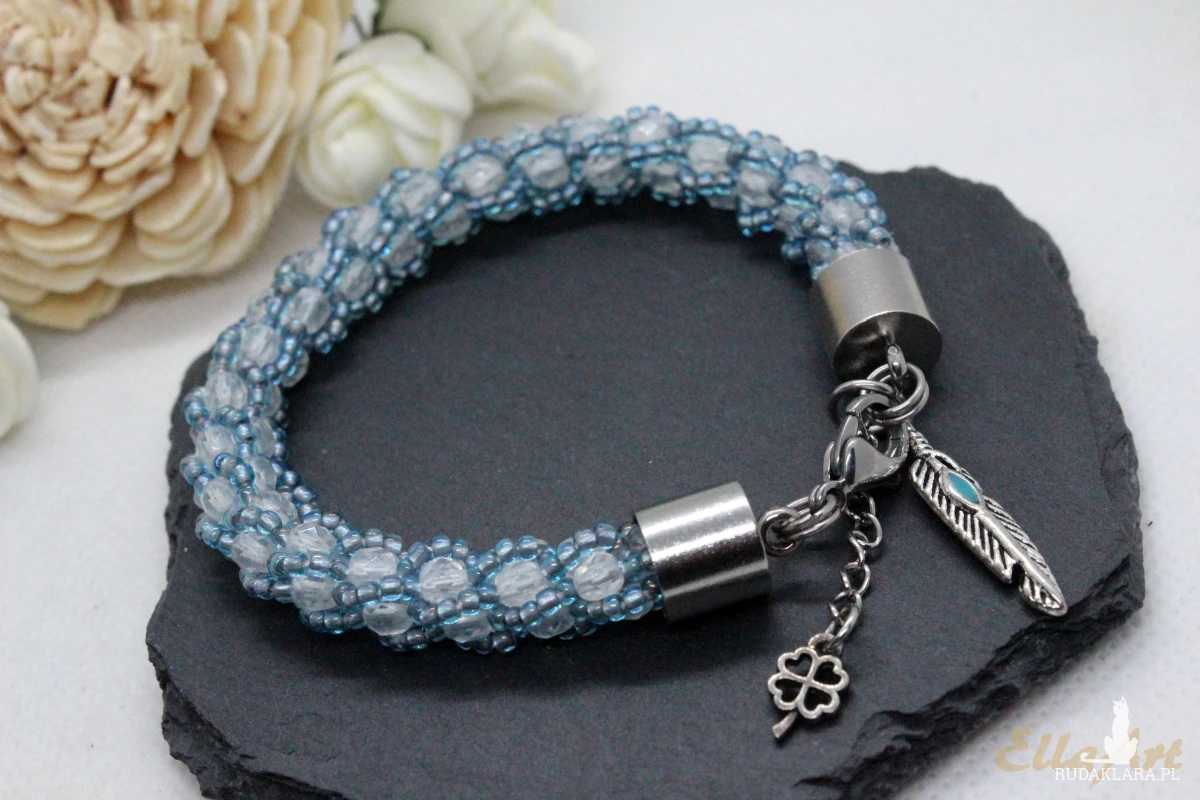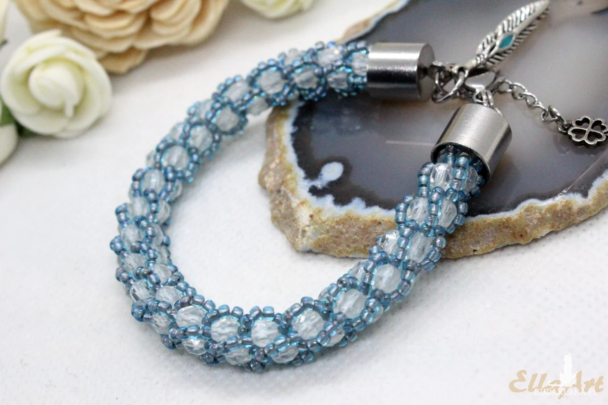 bransoletka z białych kryształków w niebieskim oplocie