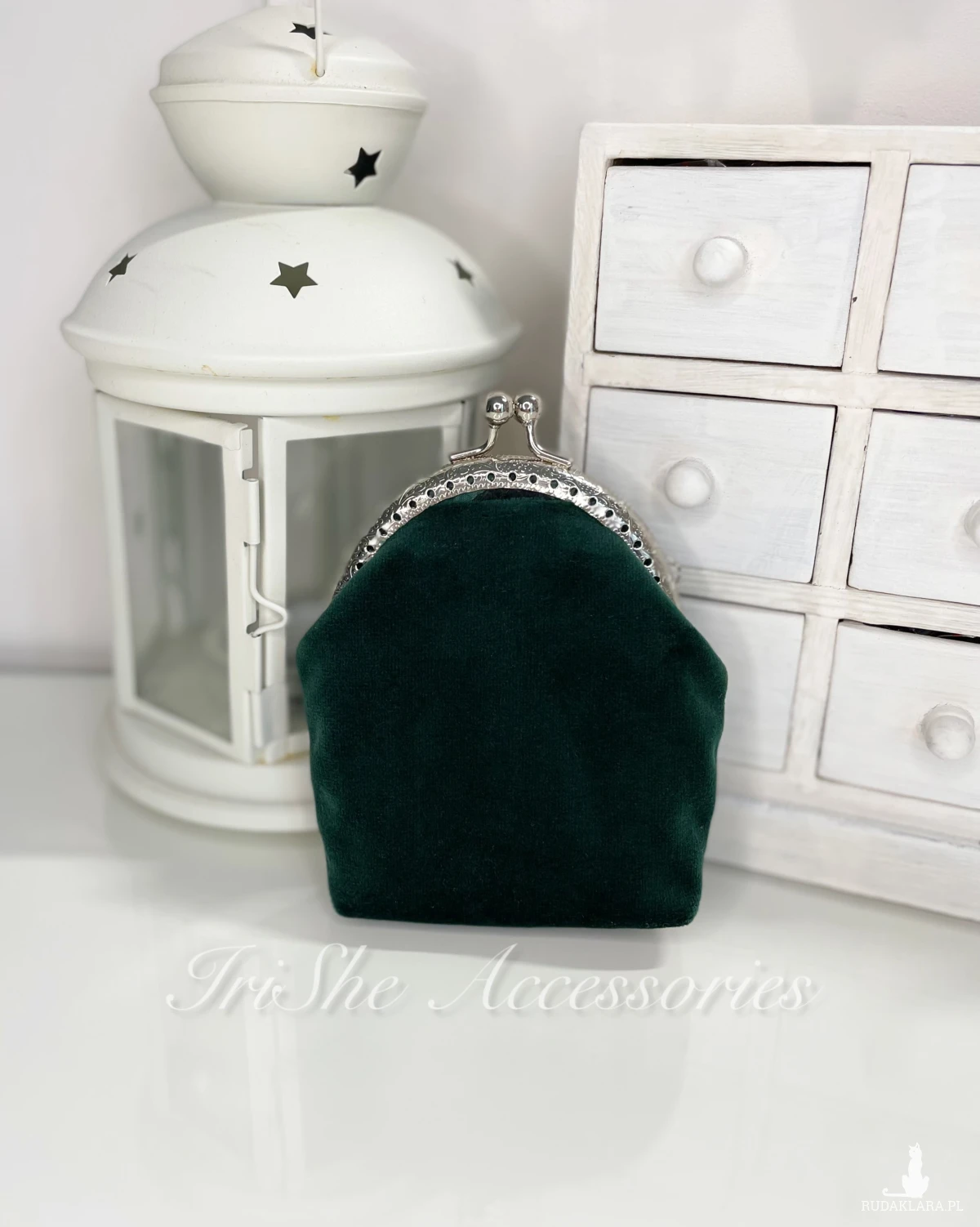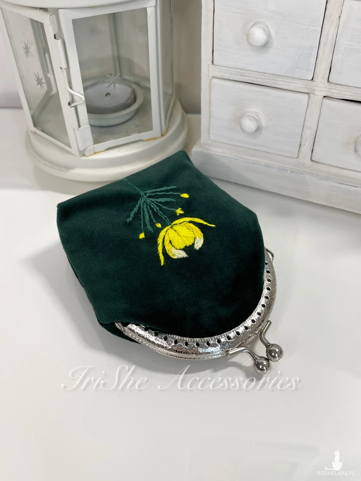 Welurowa portmonetka "Pełnik" w kolorze butelkowej zieleni uszyta i haftowana ręcznie. Portmonetka jest lekka, miękka i przyjemna w dotyku.