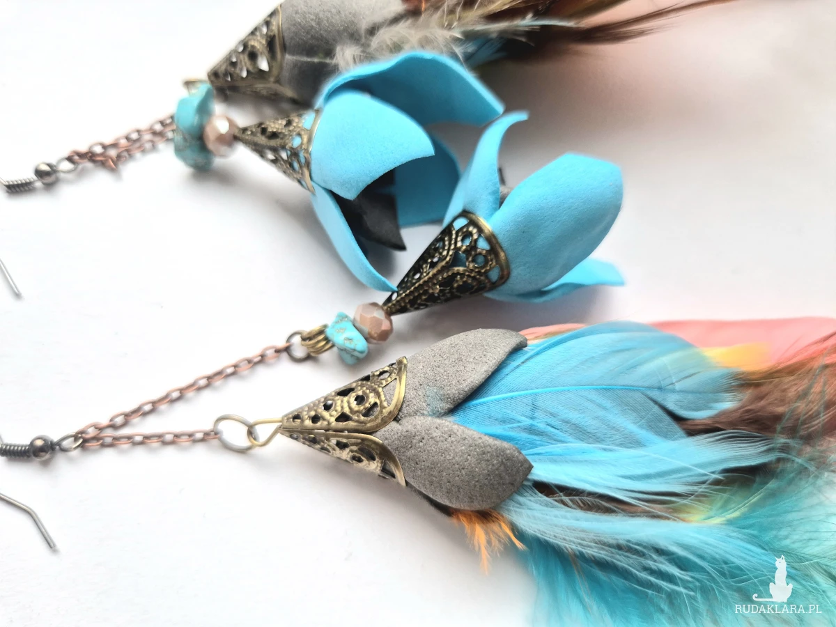 Kolczyki kwiaty i pióra lekkie długie wykonane w pojedynczym egzemplarzu rękodzieło polecam