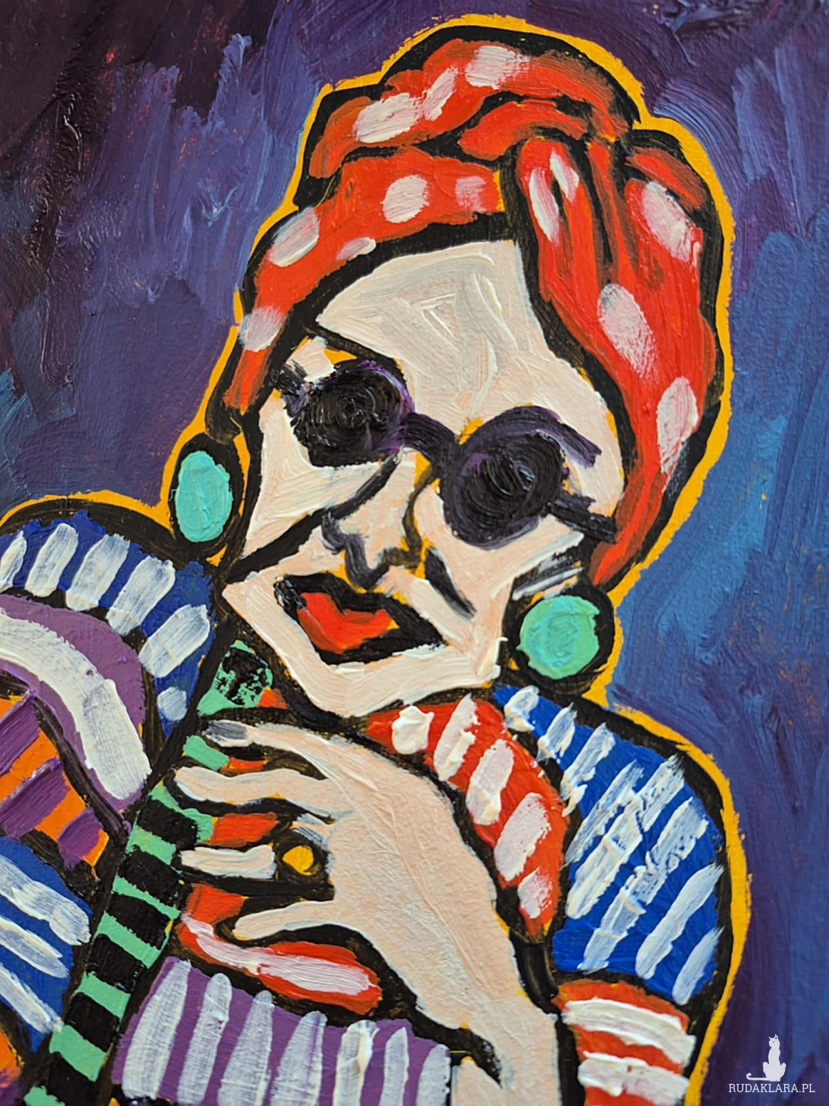 Centralną postacią jest kobieta o spokojnej, zamyślonej twarzy. Jej rysy są uproszczone, niemal maskowe — oczy ciemne, głębokie, zamknięte w sobie, usta czerwone, lekko wygięte w półuśmiechu. Głowę okala czerwona chusta w białe kropki, która nadaje jej charakteru i przywodzi na myśl ludową opowieść lub domowe ciepło. Duże, turkusowe kolczyki kontrastują z resztą kompozycji, przyciągając wzrok jak drobne akcenty światła.