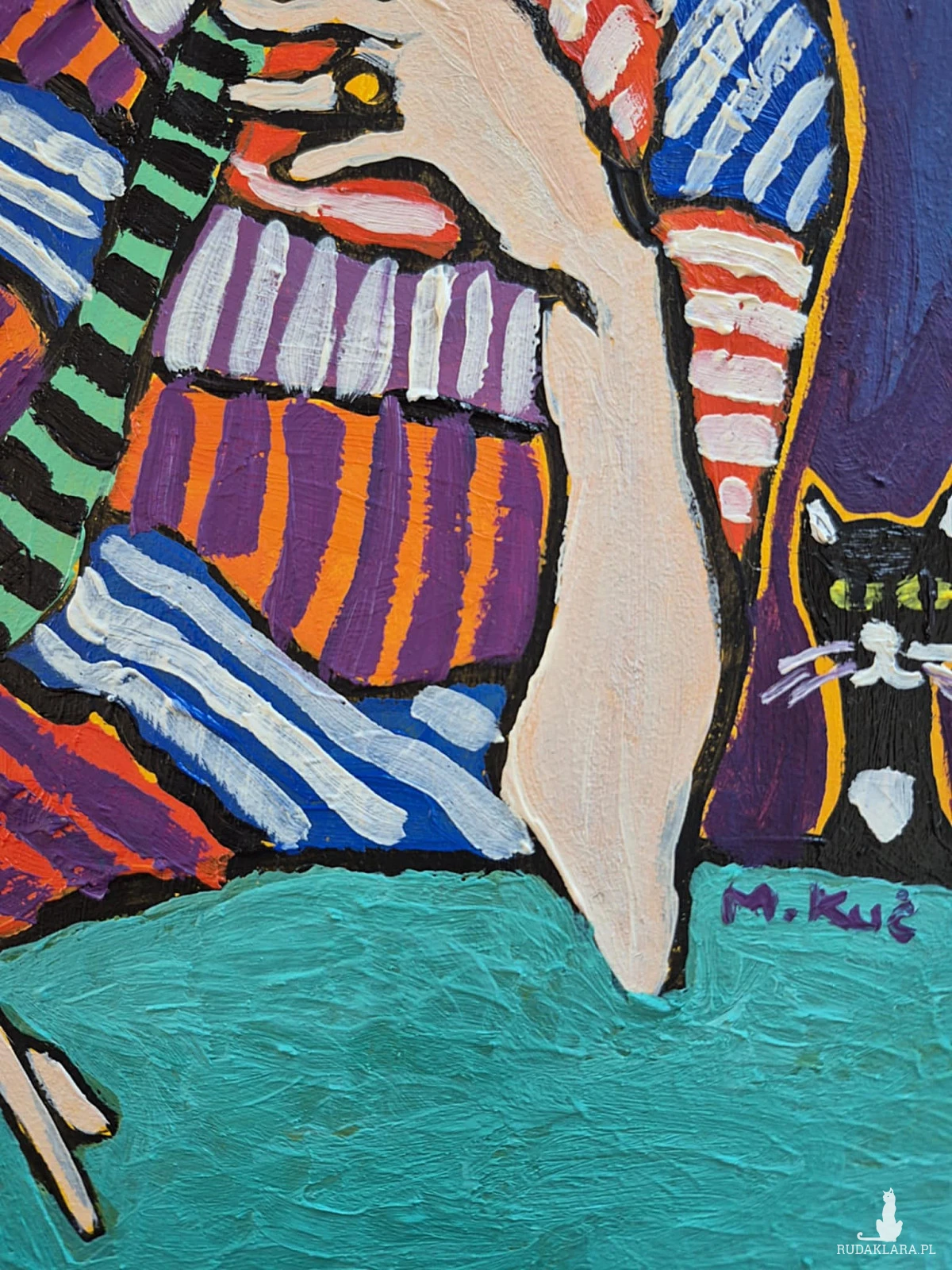 Postać ubrana jest w barwną, pasiastą suknię — rytmiczne pasy czerwieni, fioletu, błękitu, zieleni i bieli pulsują na płótnie, tworząc wrażenie ruchu i miękkości. Faktura farby jest wyraźna, gest pędzla odważny i szczery, co nadaje całości surową autentyczność. Kobieta opiera się o turkusową powierzchnię, jej dłoń wydaje się ciężka od myśli, jakby podtrzymywała nie tylko ciało, ale i nastrój chwili.