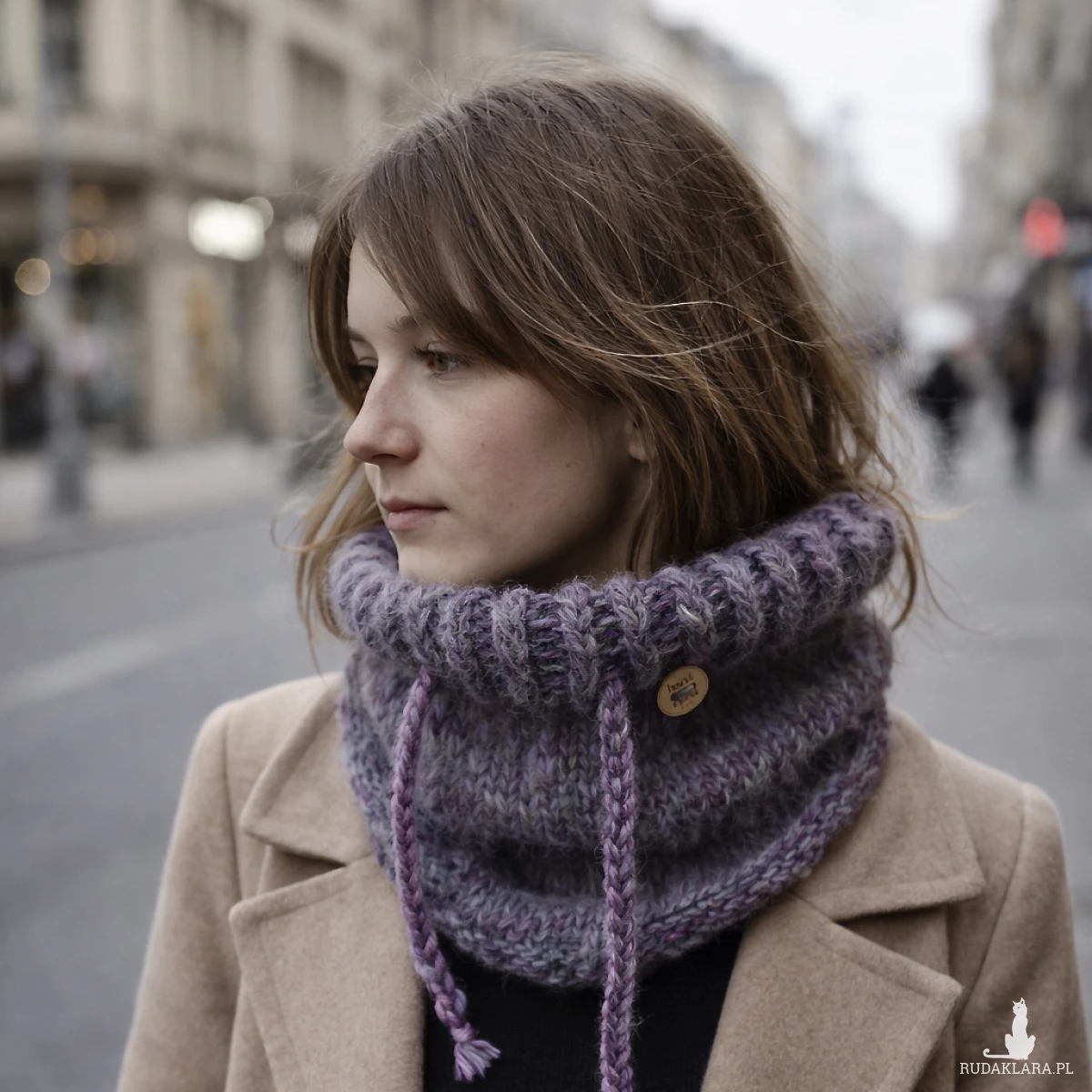 Otulacz ma wymiary 26 × 26 cm, co pozwala nosić go swobodnie lub lekko układać przy szyi. Górna krawędź została wykończona ściągaczem, który nadaje całości charakteru, poprawia dopasowanie i delikatnie chroni przed chłodem.