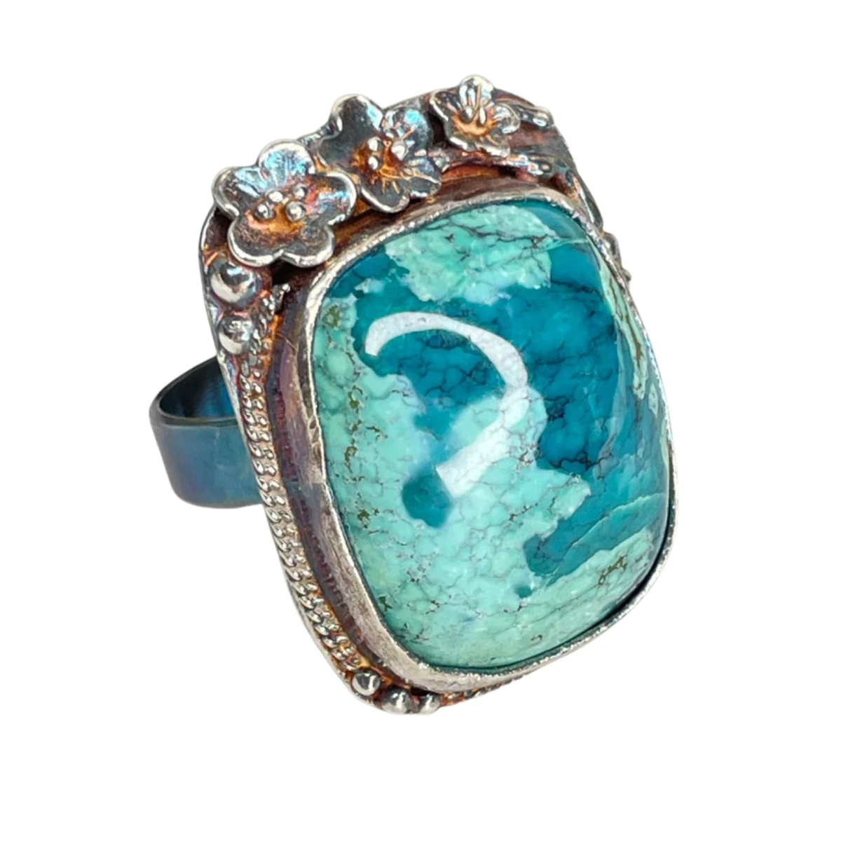 Srebrny pierścień z kwadratowym turkusem to wyrafinowane połączenie wyrazistej formy i subtelnej dekoracyjności. Centralnie osadzony kamień o geometrycznym kształcie przyciąga uwagę intensywną barwą, a jego oprawę otaczają oksydowane, florystyczne detale, które dodają całości głębi i artystycznego charakteru. Kontrast między chłodnym srebrem, przyciemnionymi kwiatami i gładką powierzchnią kamienia tworzy kompozycję inspirowaną estetyką vintage, z delikatną nutą romantyzmu. To pierścień dla osób poszukujących biżuterii z charakterem — eleganckiej, nieoczywistej i ponadczasowej. Ważne informacje: Materiał: srebro próby 925, turkus Wielkość kamienia: 13 mm Wielkość korony: 22×20 mm Waga pierścionka: 14,14 g Waga srebra: 8,51 g Obrączka rozmiar: 18 Biżuteria zostanie elegancko zapakowana. Kolory na zdjęciach mogą delikatnie różnić się od rzeczywistych.