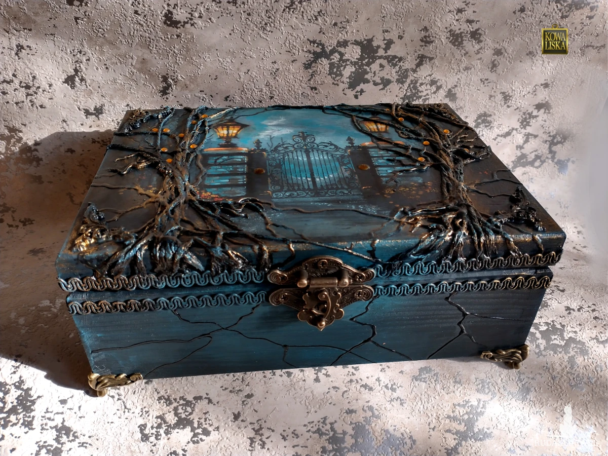 Namalowany na wieczku mroczny obrazek uzupełniony i zdobiony ręcznie, sprawdzoną autorską metodą "co się nawinie, a oko zatwierdzi" - dlatego każda skrzyneczka jest absolutnie wyjątkowa i jedyna w swoim rodzaju.
