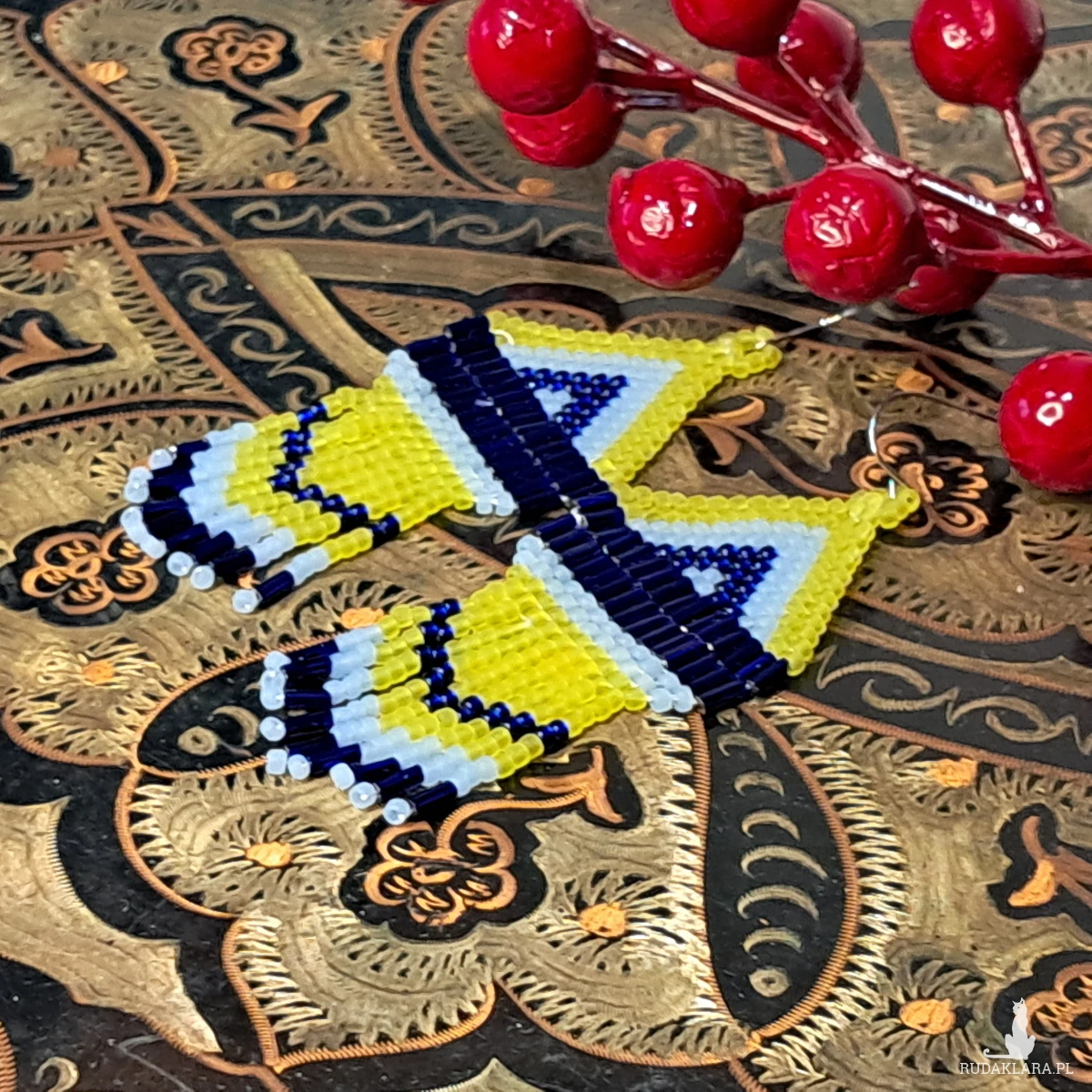 Ręcznie wykonane kolczyki z drobnych koralików w świeżej, energetycznej kolorystyce. Połączenie żółtego, jasnego fioletu i chabrowego granatu tworzy nowoczesny, a jednocześnie etniczny wzór inspirowany stylem boho i folk.Geometryczna forma oraz delikatne