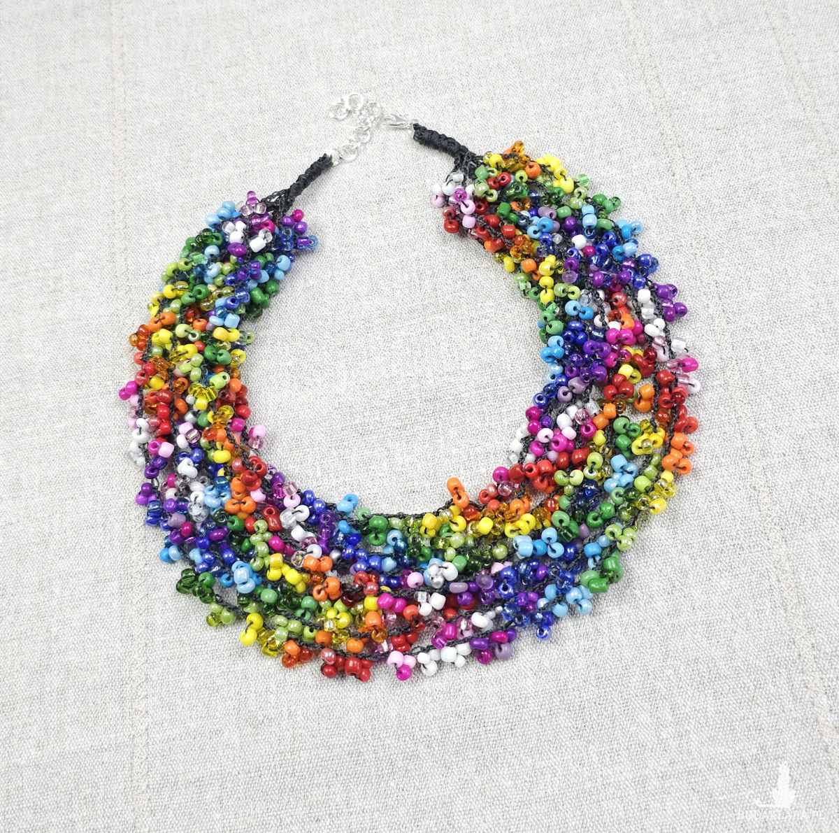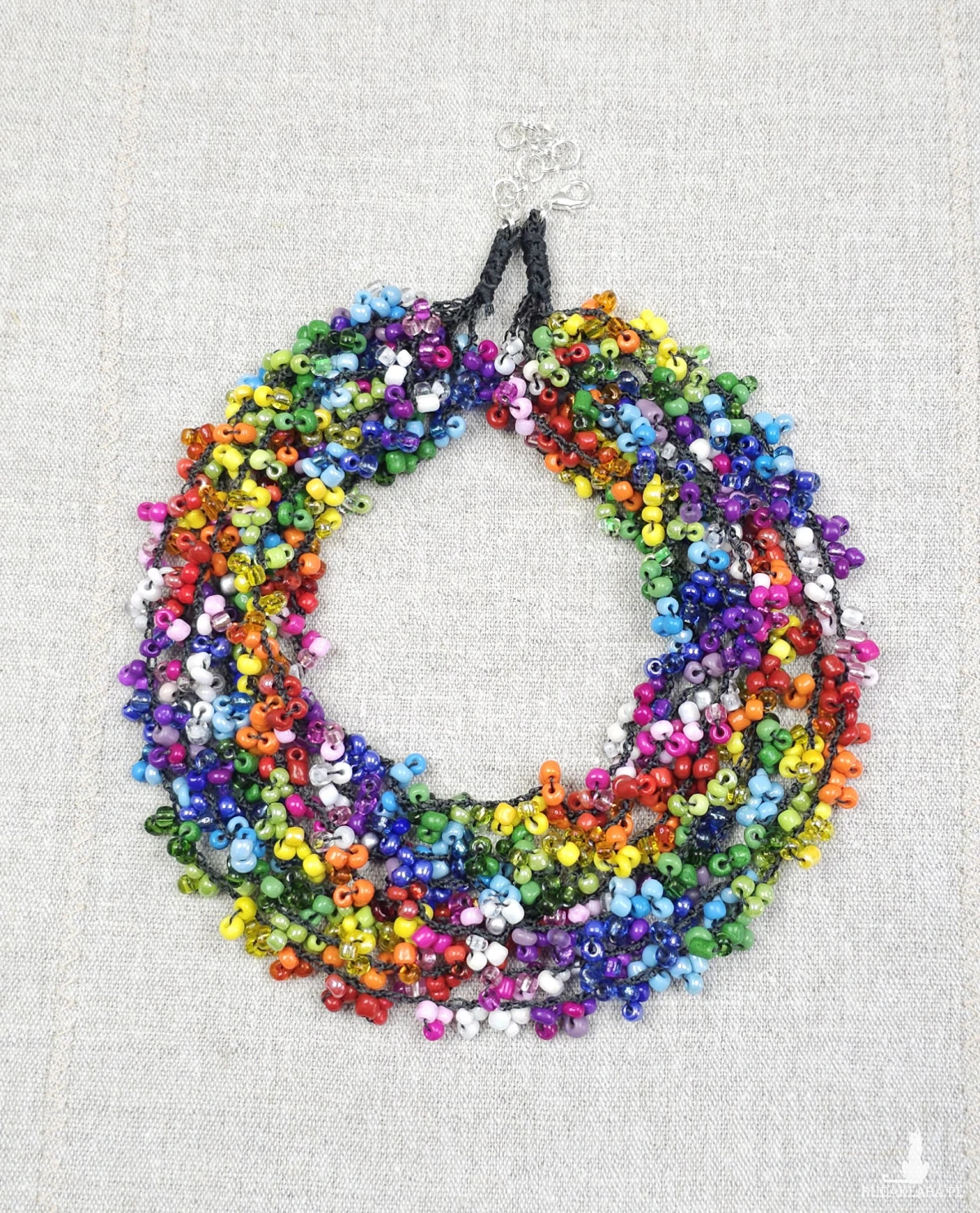 Wykonany z setek drobnych, szklanych koralików w niemal każdym kolorze – od soczystej czerwieni, przez słoneczny żółty, aż po głęboki błękit i fiolet.