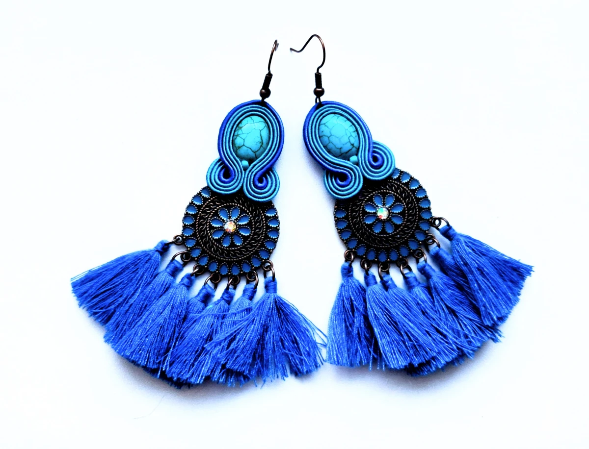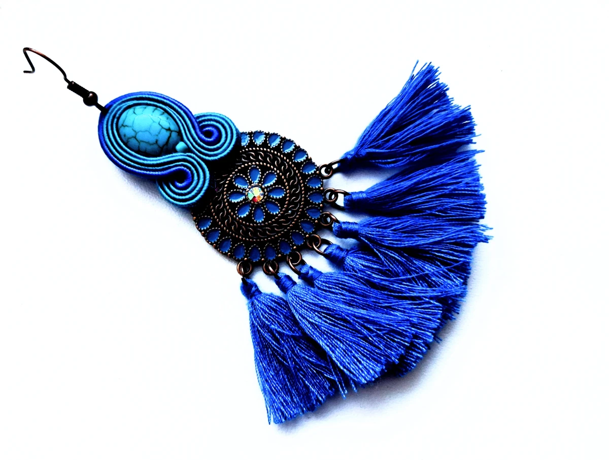 Materiał: turkusowy howlit, metal, bawełniane chwosty, sutasz.