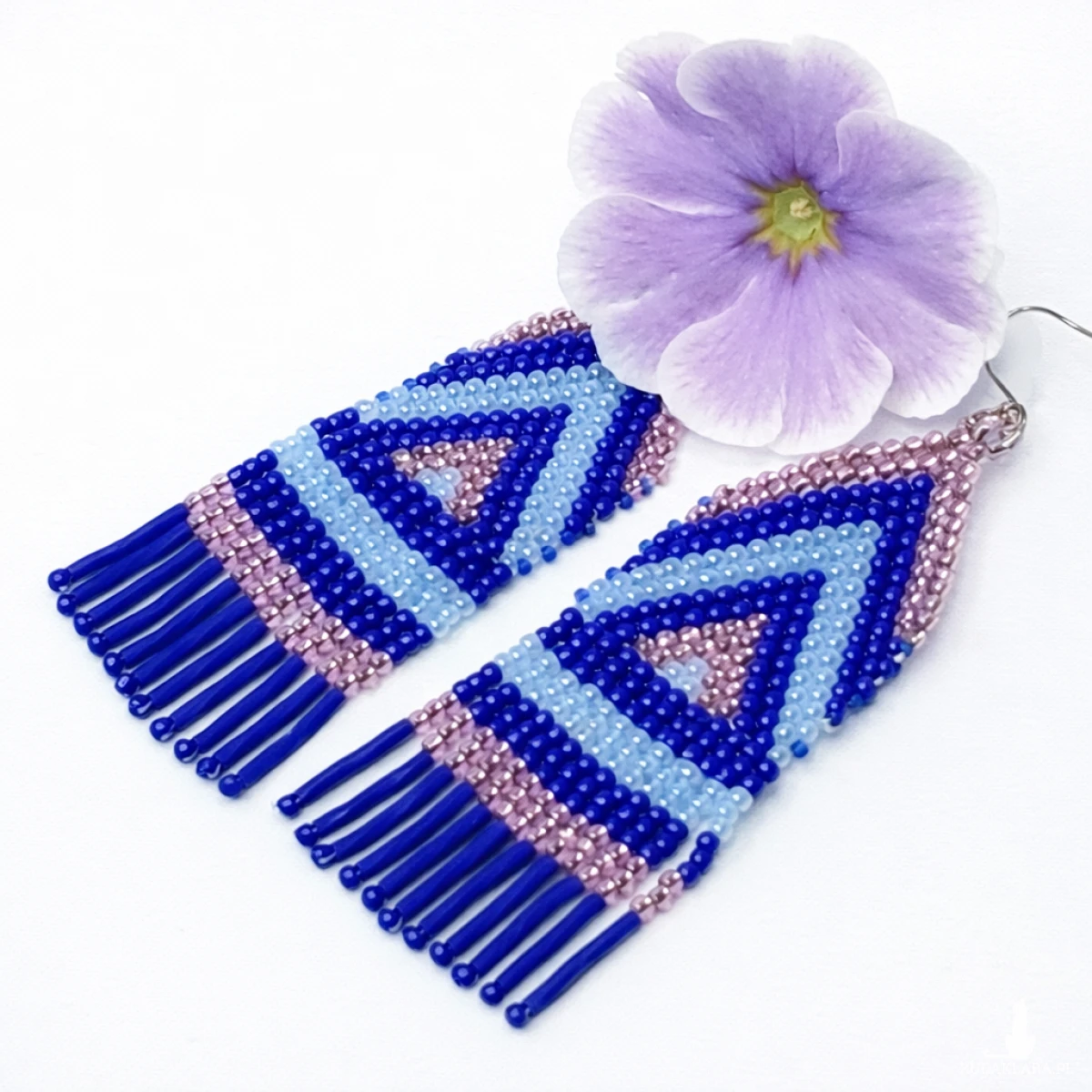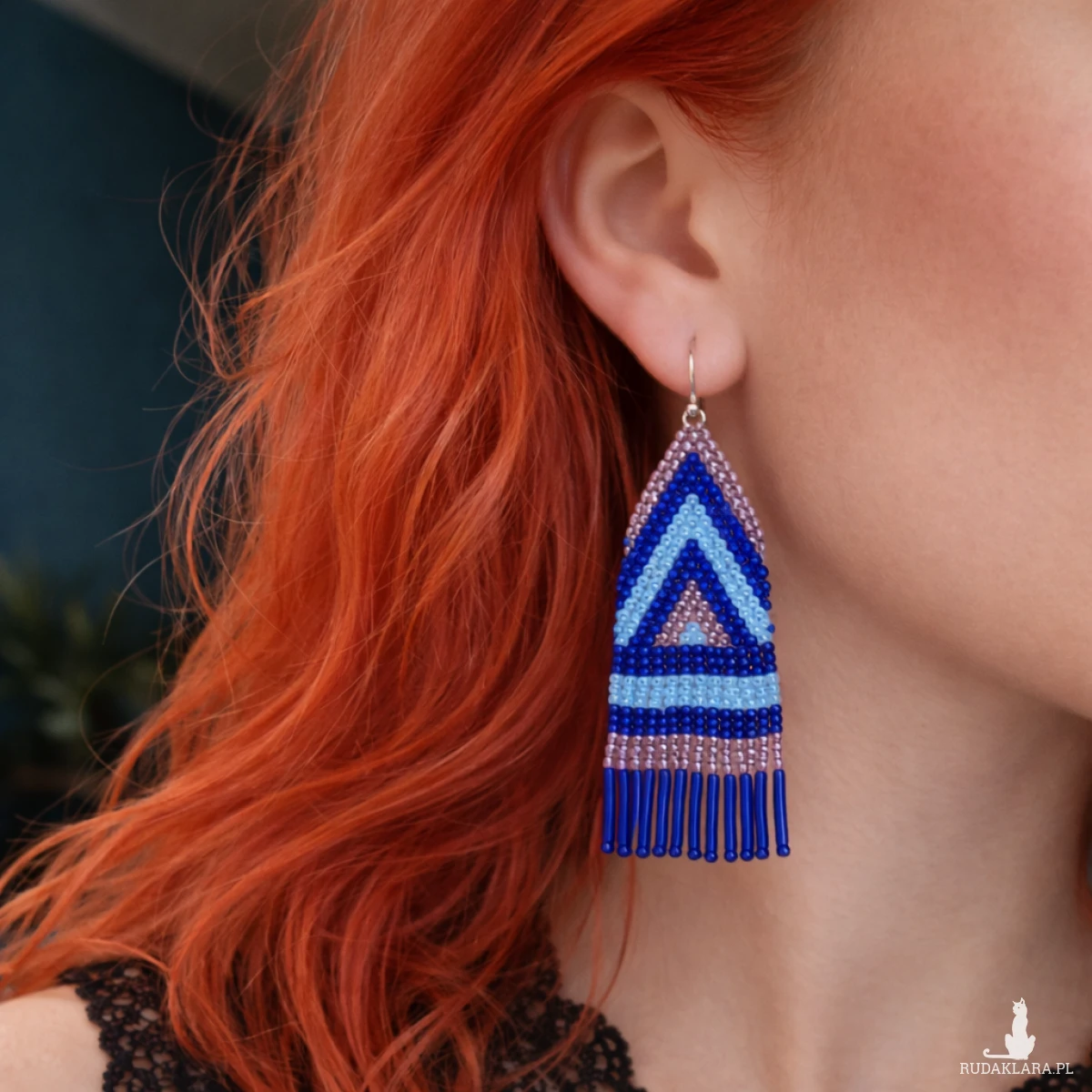 Kolczyki Inez to ręcznie wykonana biżuteria z drobnych koralików, która łączy intensywny fiolet z subtelnym różowym akcentem. Geometryczny wzór inspirowany stylem etnicznym oraz delikatne frędzle tworzą harmonijną i przyciągającą uwagę kompozycję.
