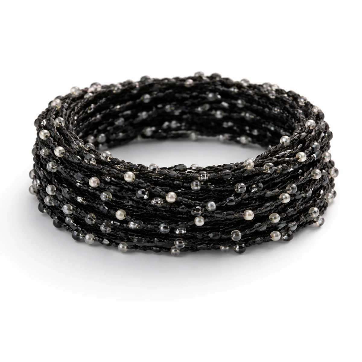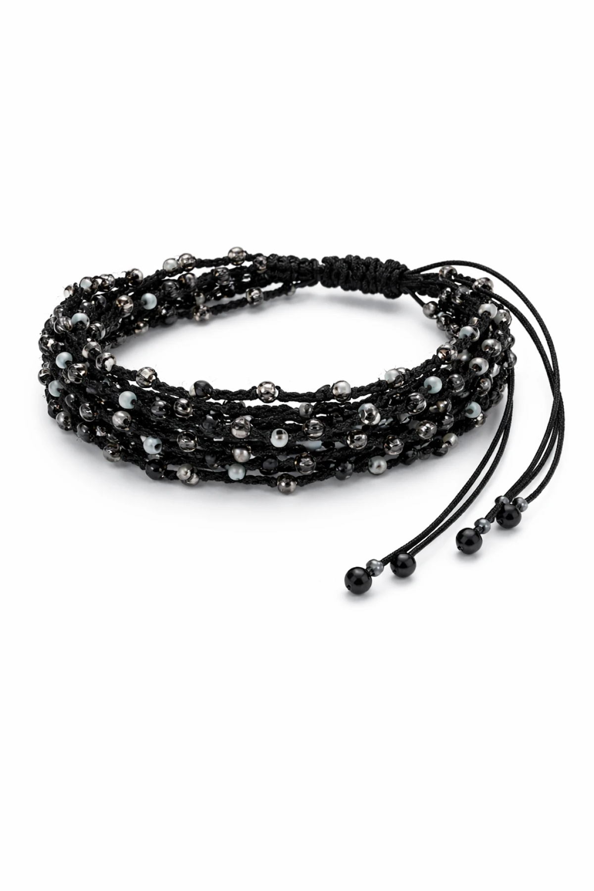 Bransoletka na czarnej nici koraliki drobne w szarym i czarnym kolorze. Bardzo lekka, dwukrotnie owijana, objętość uniwersalna.
