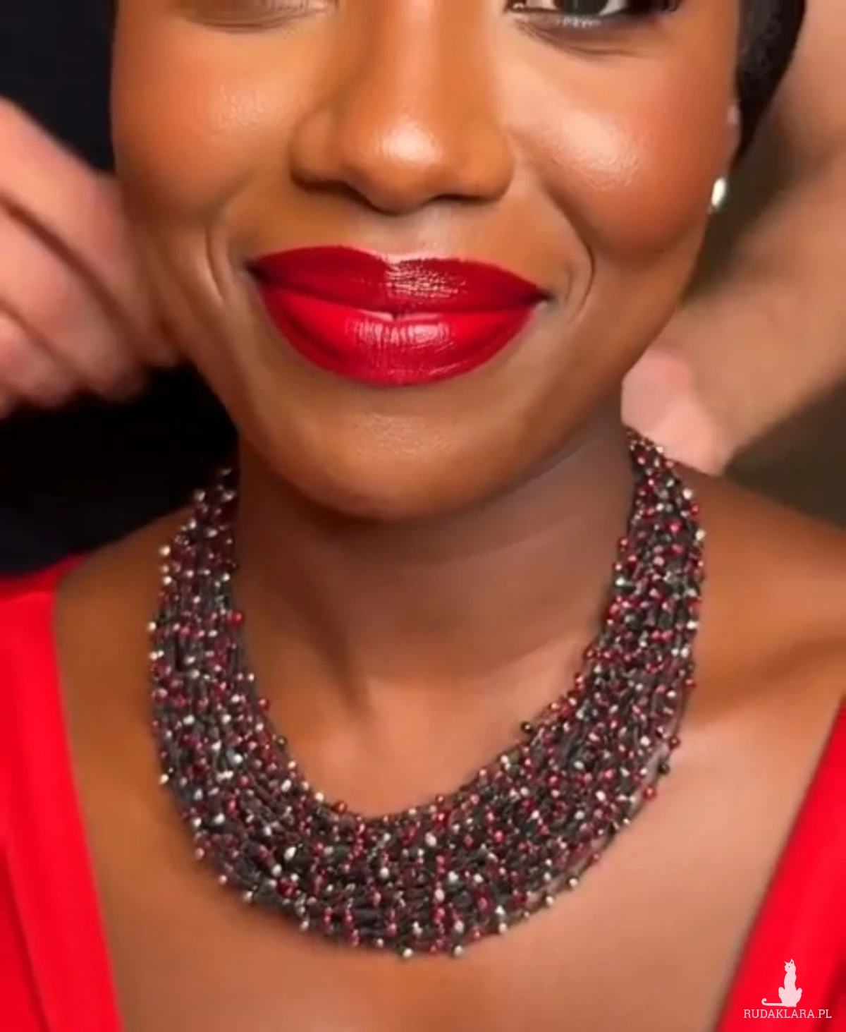 bardzo drobne czerwone, szare, czarne na czarnej nici. Naszyjnik bardzo