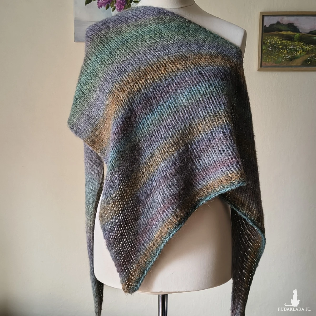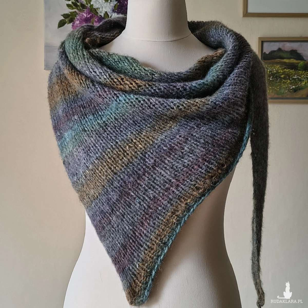 Przytulna, niesamowicie miękka, ciepła, delikatna dla skóry i uroczo puchata chusta, wykonana ręcznie na drutach z doskonałej włoskiej włóczki o składzie: baby alpaka, merino extafine i minimalna ilość włókien sztucznych. Jest to typ chusty, której nie chce się zdejmować z szyi. Kolorystyka - magiczna: dymne zielenie, szarości, fiolety, oliwka... Twarzowa, niebanalna, świetnie komponująca się z charakterem chusty i typem włóczki. Wymiary: 217 cm. bok najdłuższy, 78 cm. wysokość trójkąta. Pranie wyłącznie ręczne.