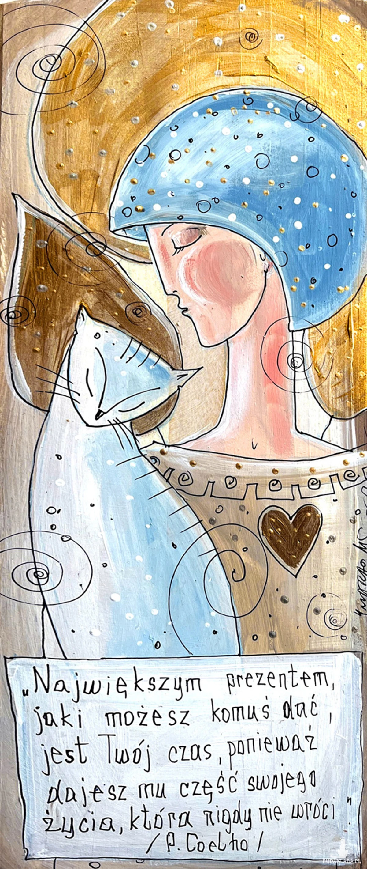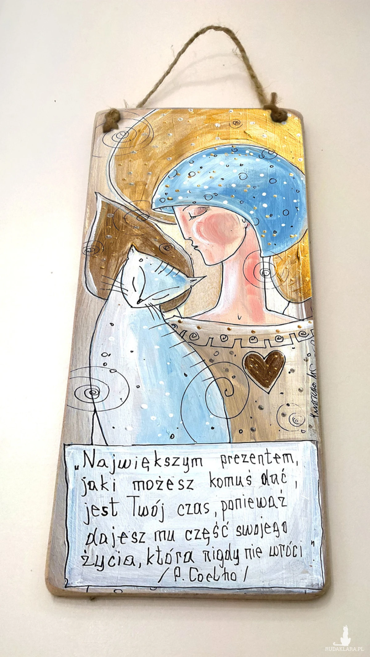 Reprodukcja autorskiej pracy, umieszczona na płycie MDF o grubości 6 mm, z zawieszką w postaci ekologicznego sznurka.