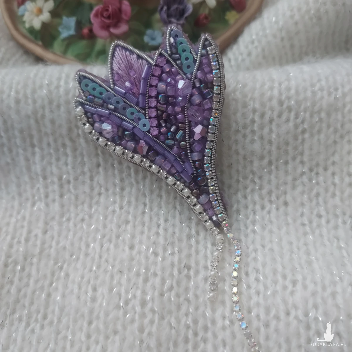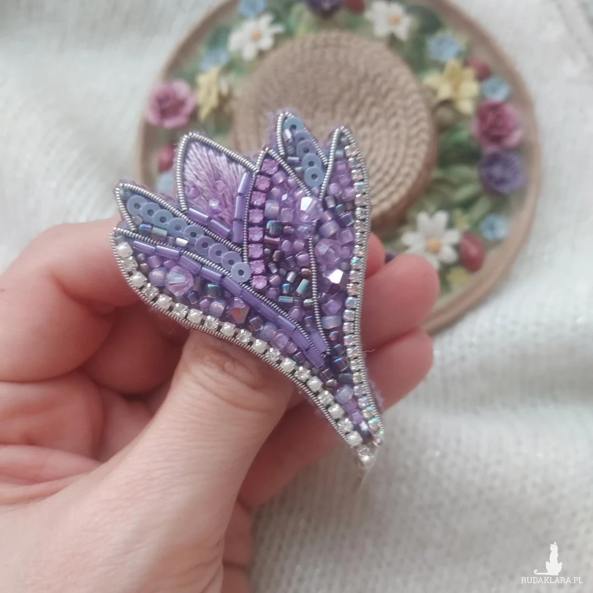 Odkryj wyjątkową, kwiatową broszkę krokusa, która powstała haftem koralikowym oraz płaskim.