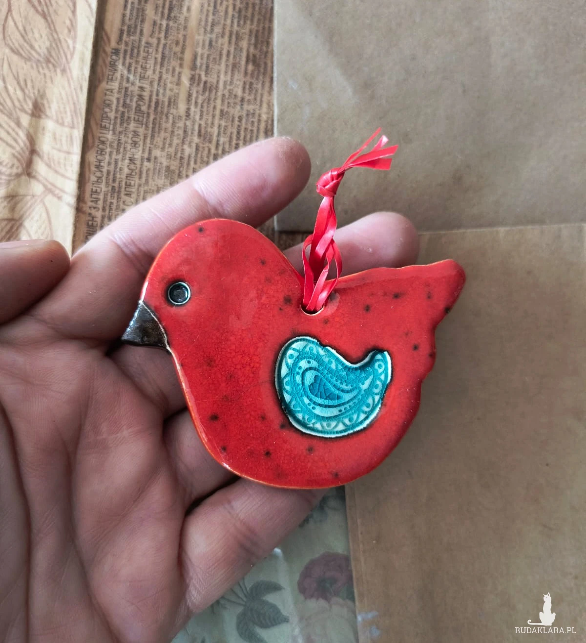 Ptaszet do powieszenia na rarfii. Wykonany z gliny szamotowej, wypalony na biskwit, a następnie szkliwiony w temperaturze 1260 stopni C, o wymiarach ok 4,5 cm x 7 cm. Idealnie sprawdzi się jako prezent okolicznościowy lub ozdoba domu.