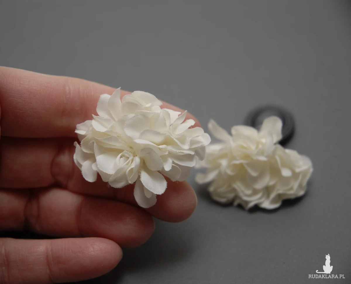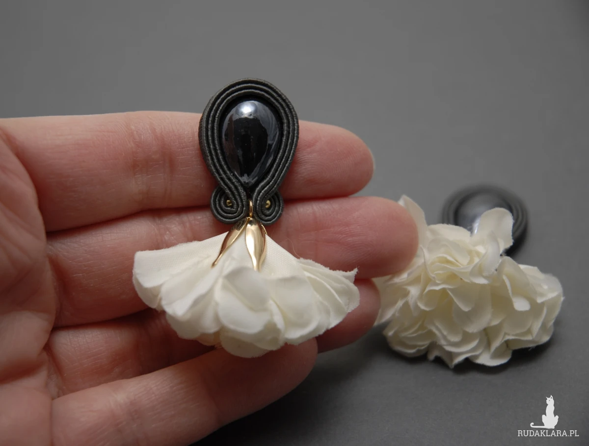 oferuję kolczyki lub klipsy zrobione techniką sutasz, ozdobione fasetowanymi szklanymi kaboszonami i kwiatkami z materiału
