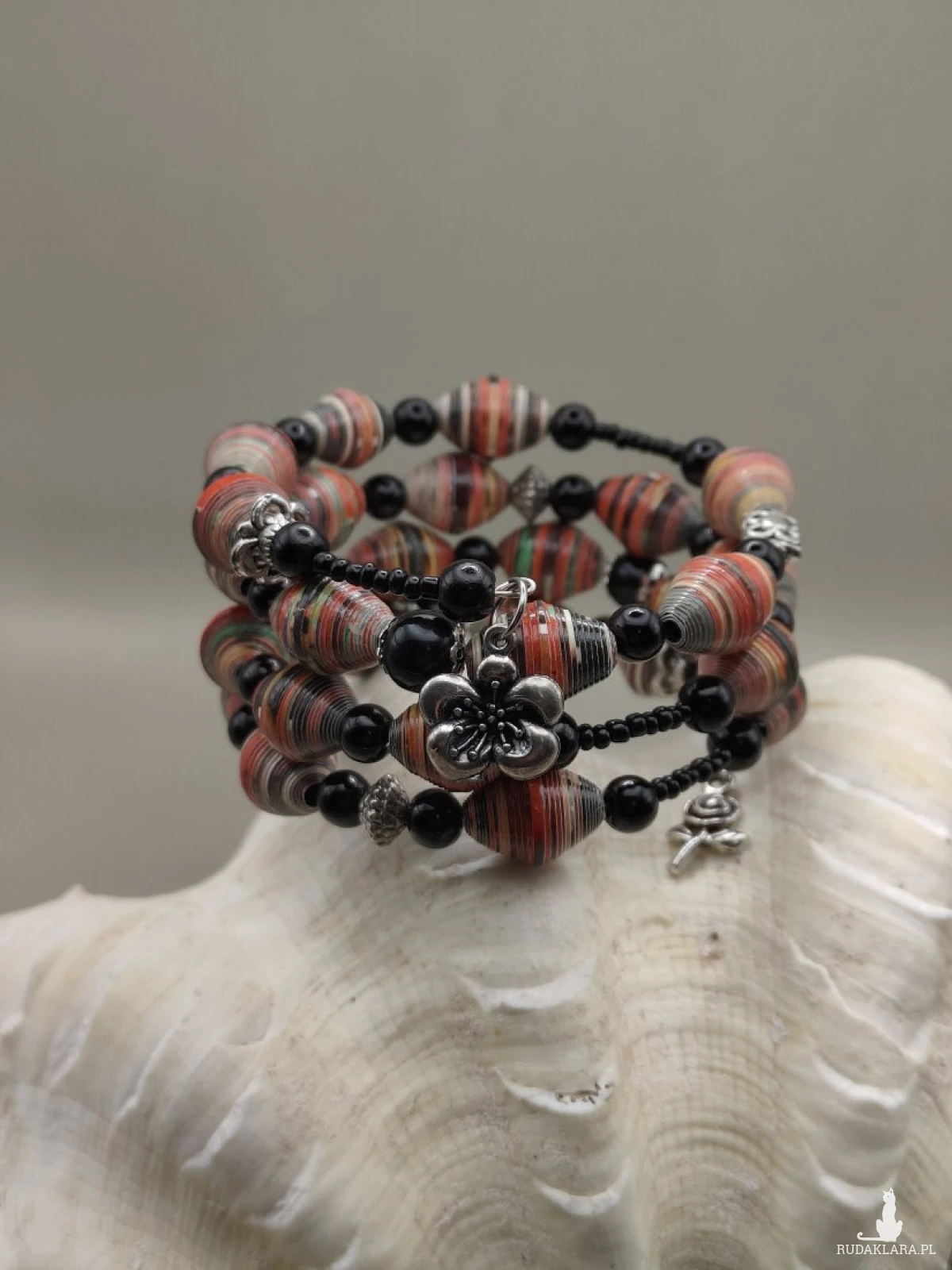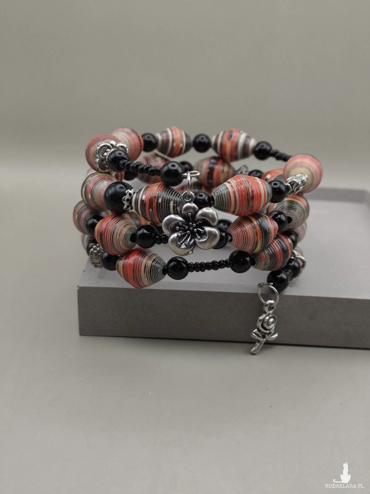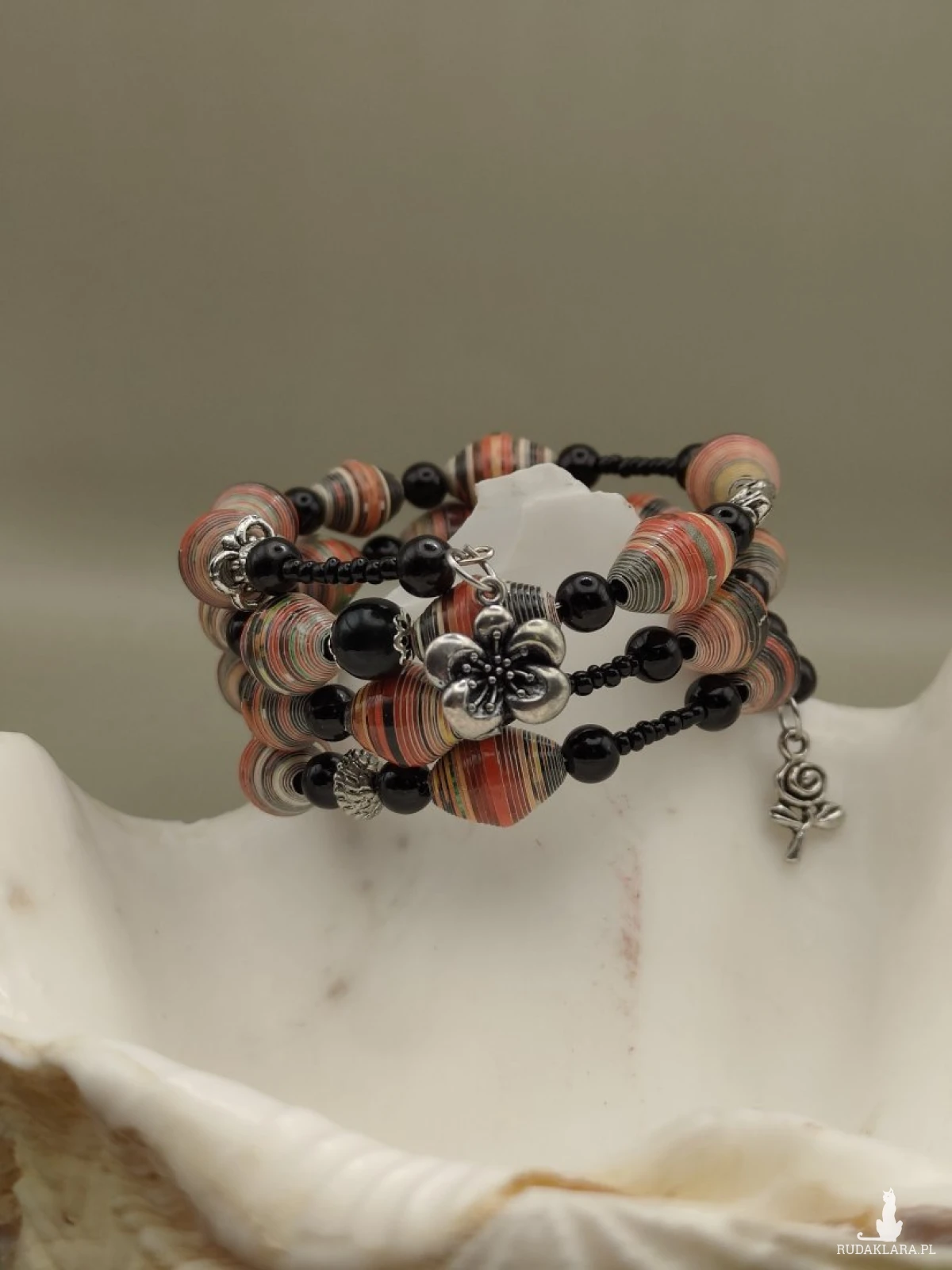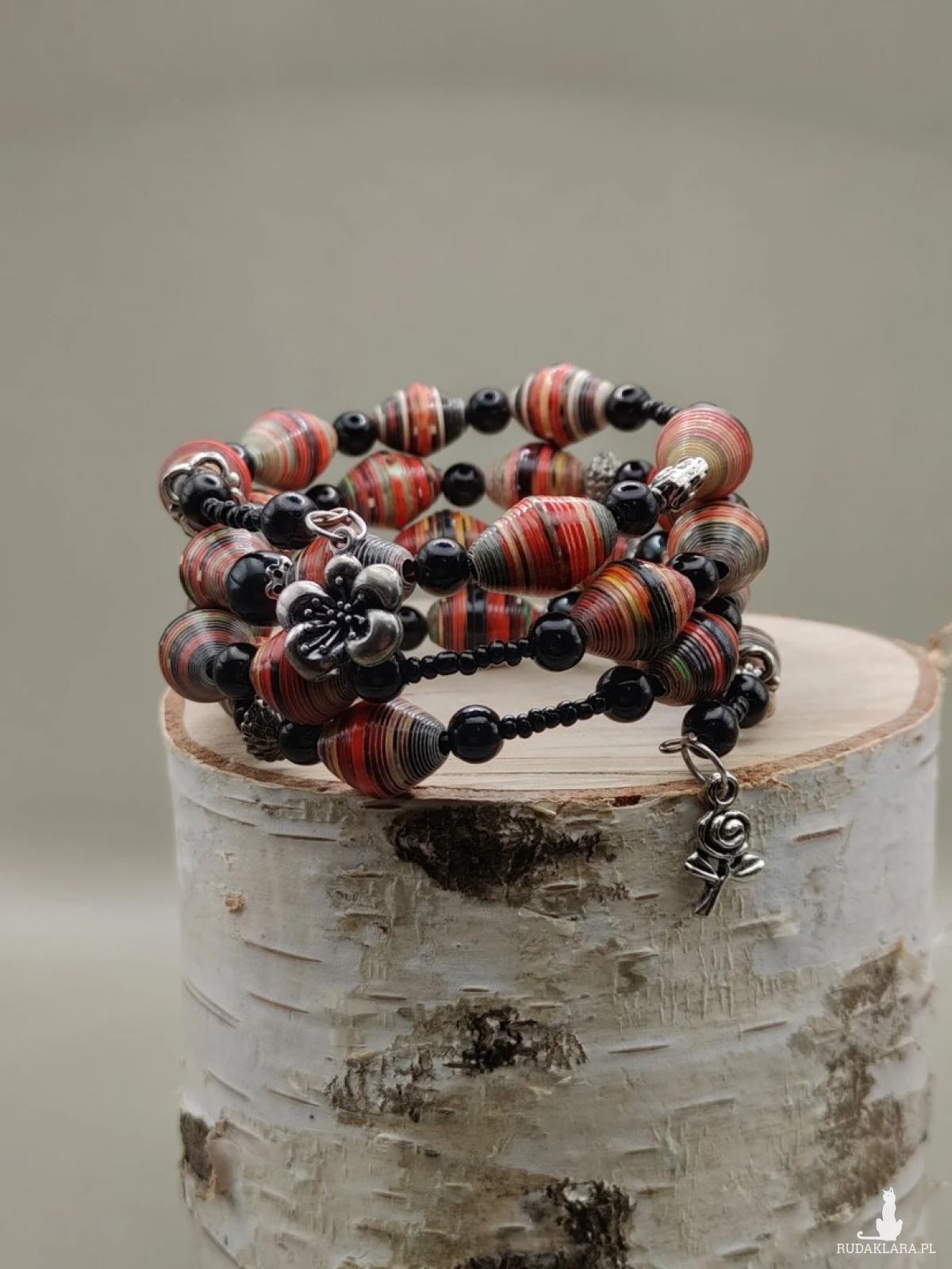 Wyrazista, ręcznie wykonana bransoletka, która przyciąga spojrzenia od pierwszej chwili. Intensywne odcienie czerwieni, czerni i ciepłych beży tworzą dynamiczną, a jednocześnie harmonijną kompozycję. Wielowarstwowa forma pięknie oplata nadgarstek, nadając stylizacji charakteru i artystycznego pazura. Srebrne zawieszki – kwiat i róża – dodają całości subtelnej symboliki natury i kobiecej siły. To biżuteria dla osób, które lubią wyróżniać się detalami i cenią unikatowe dodatki handmade.