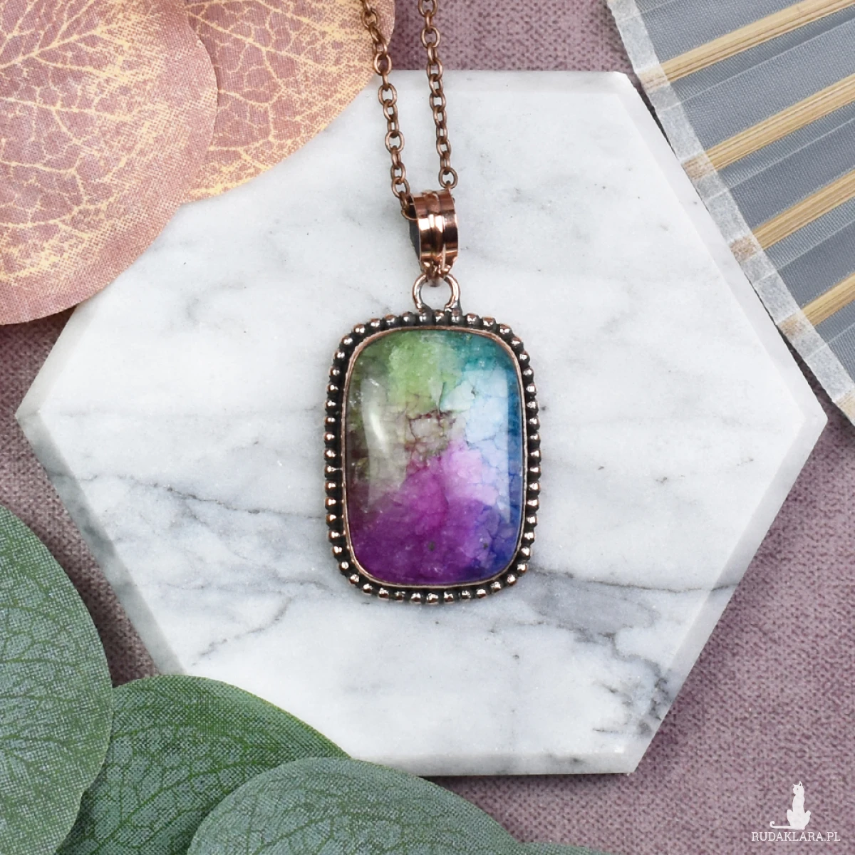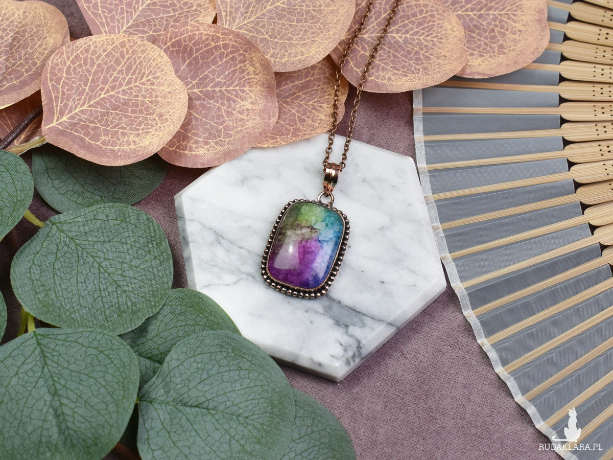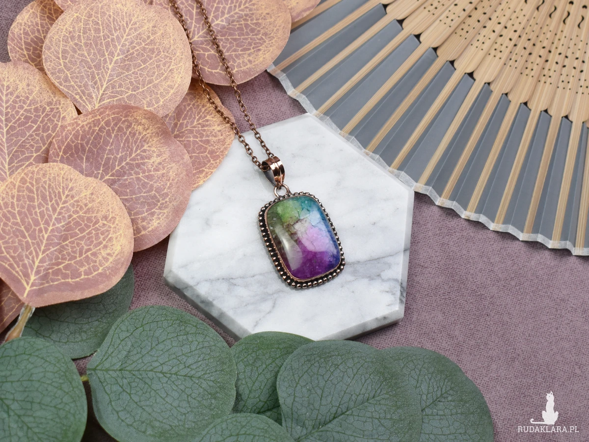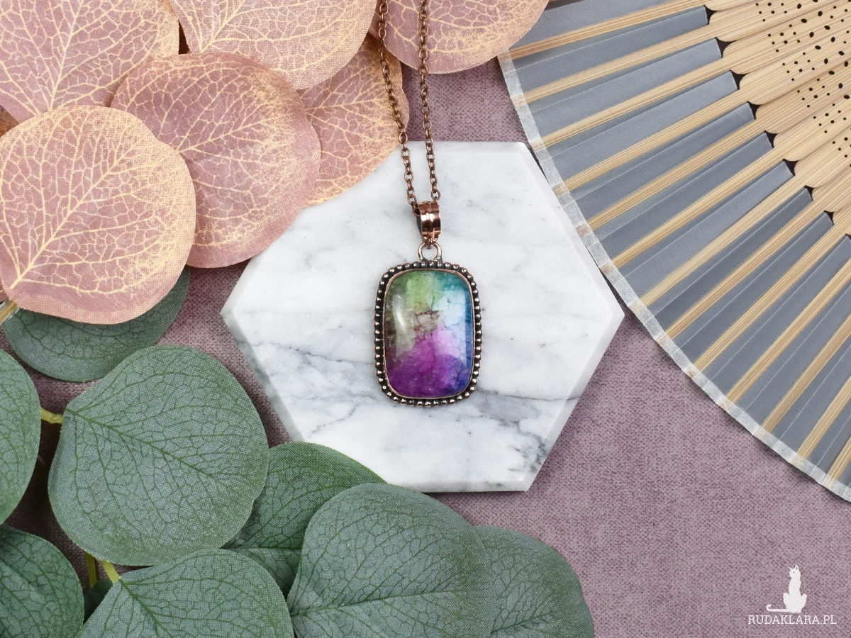 Ten elegancki wisiorek z miedzią zachwyca swoim prostym, lecz wyjątkowym designem, a jego centralnym elementem jest tęczowy agat słoneczny. Kamień ten nie tylko przyciąga wzrok swoimi subtelnymi odcieniami, ale również posiada unikalne właściwości. Agat słoneczny jest znany z tego, że pomaga w budowaniu wewnętrznej siły, równowagi i spokoju. Nosząc ten wisiorek, możesz cieszyć się nie tylko jego estetyką, ale także korzystać z pozytywnego wpływu kamienia na Twoje samopoczucie i harmonię życiową.
