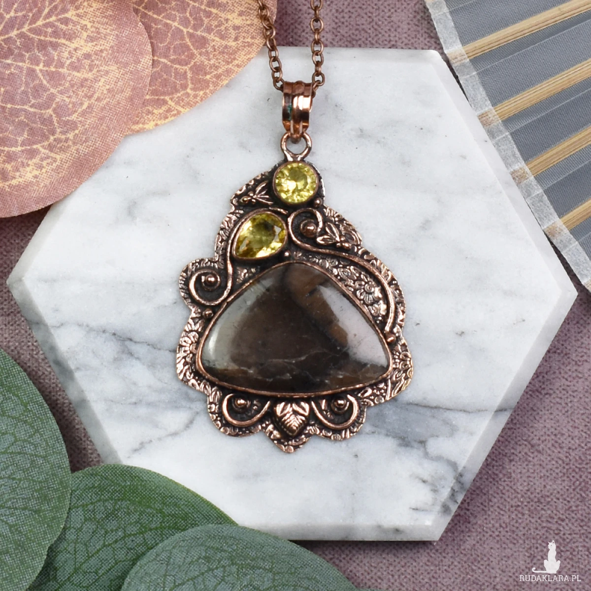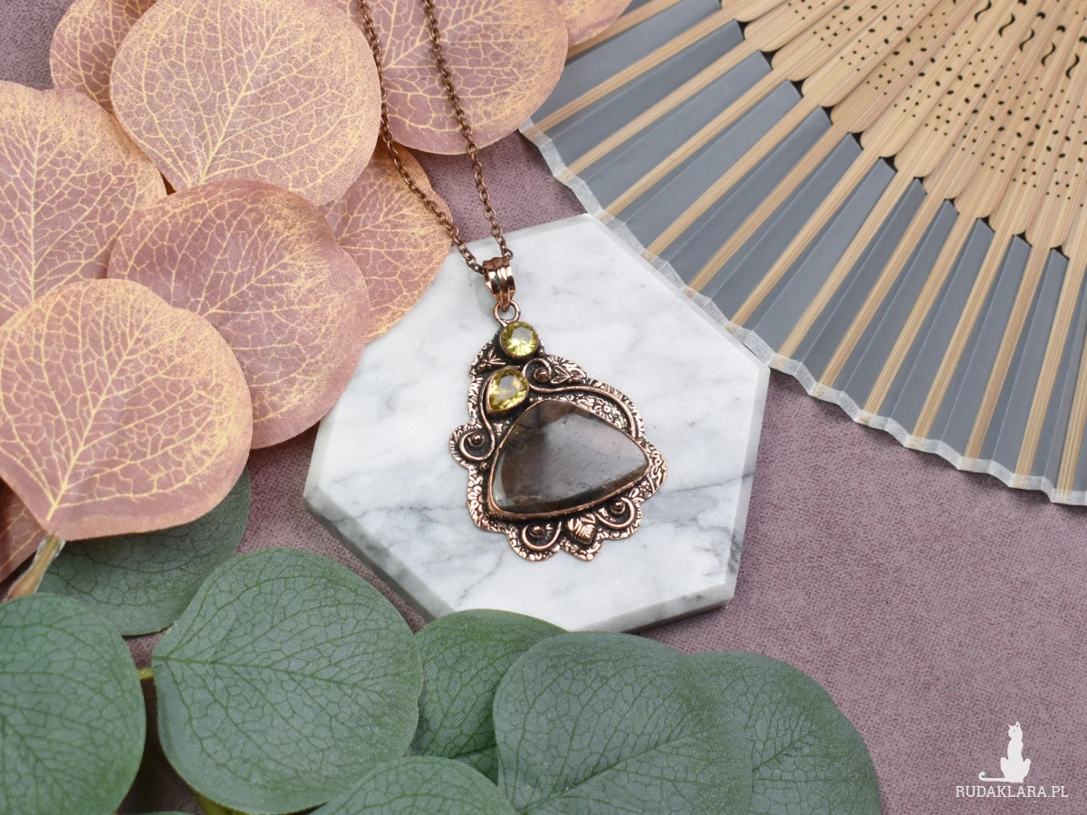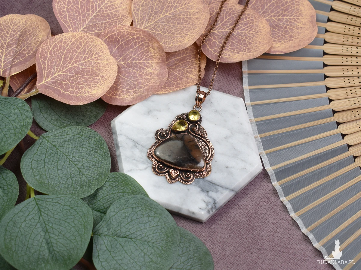 Elegancki wisiorek z miedzi, jaspisem i cytrynem to niezwykła biżuteria, która łączy w sobie estetykę i pozytywną energię. Jaspis, znany ze swoich właściwości stabilizujących, dodaje wisiorkowi ziemiennego piękna, podczas gdy cytryn wzbogaca go o promienne światło i radość. Nosząc ten wyjątkowy wisiorek, nie tylko podkreślisz swoją indywidualność, ale także zyskasz wsparcie kamieni, które tradycyjnie przypisuje się zwiększeniu siły witalnej, spokoju i optymizmu.