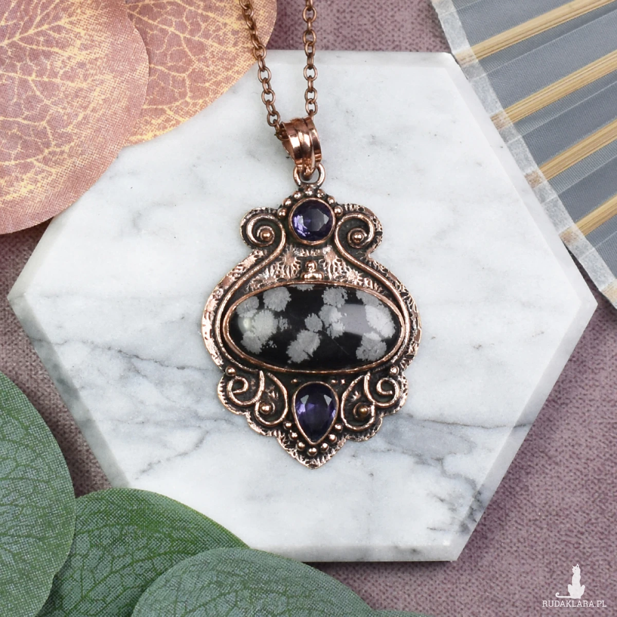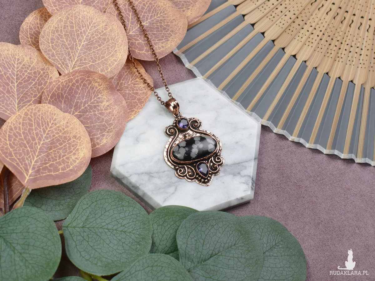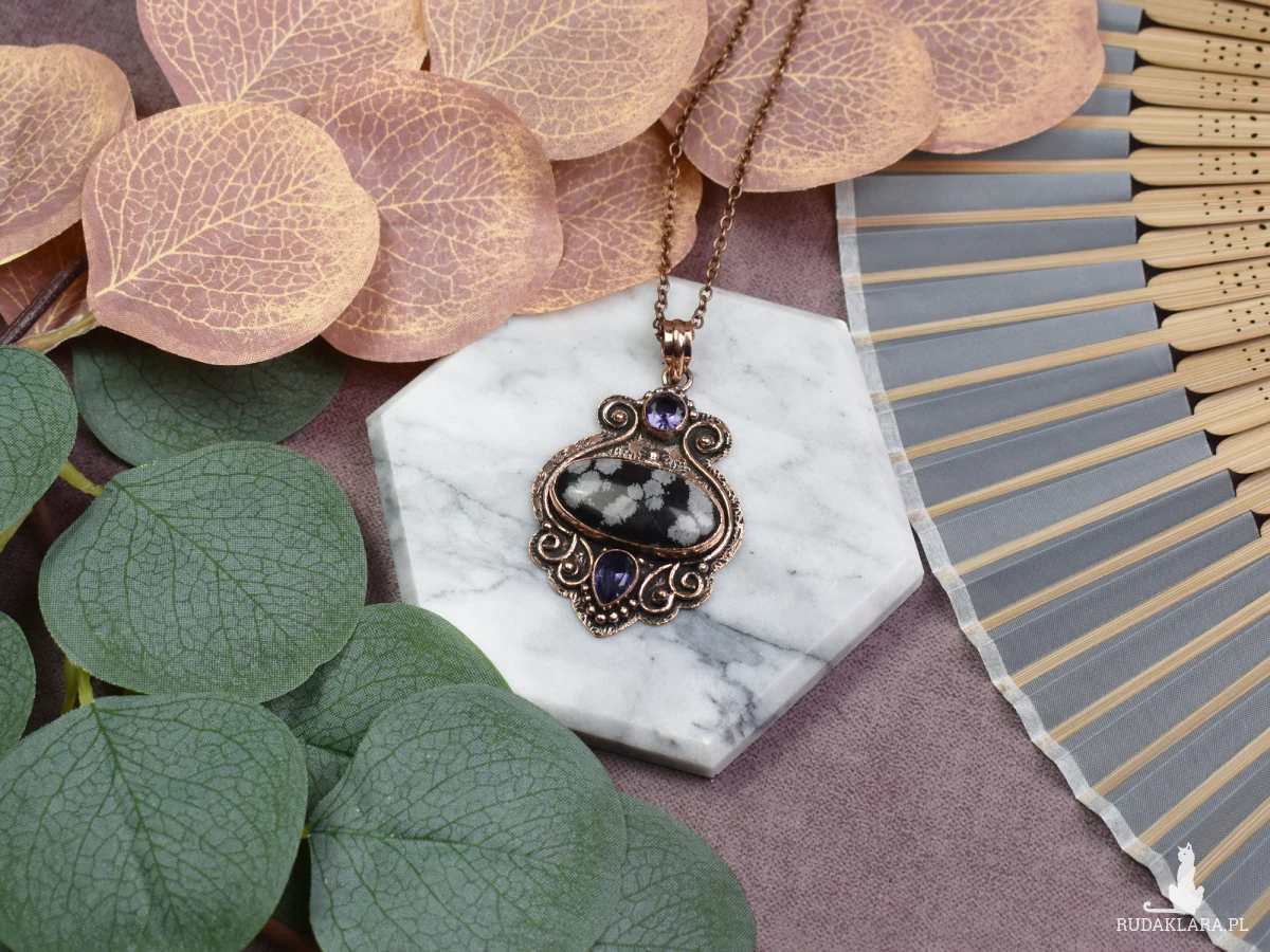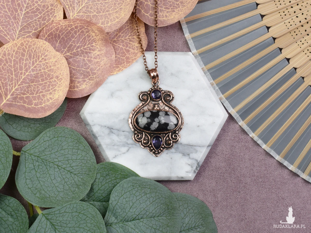 Elegancki wisiorek z miedzi, obsydianem śnieżnym i ametystem to subtelna biżuteria, która emanuje mistycznym urokiem. Obsydian śnieżny przynosi ochronę, a jego chłodna, czarna powierzchnia kontrastuje z fioletowym ametystem, który sprzyja spokoju umysłu. Ta unikatowa kombinacja kamieni nie tylko ozdabia, ale również niesie ze sobą energetyczne dobrodziejstwa, tworząc niezwykły amulet harmonii i równowagi.