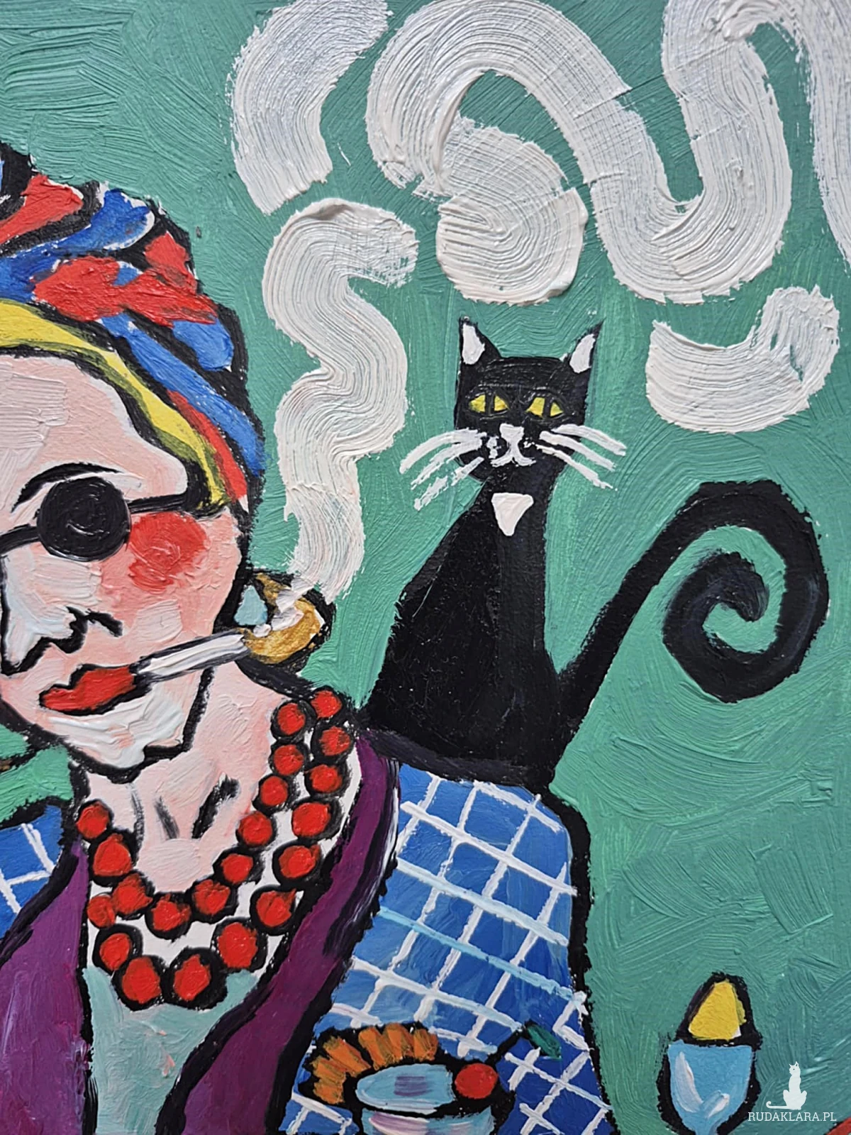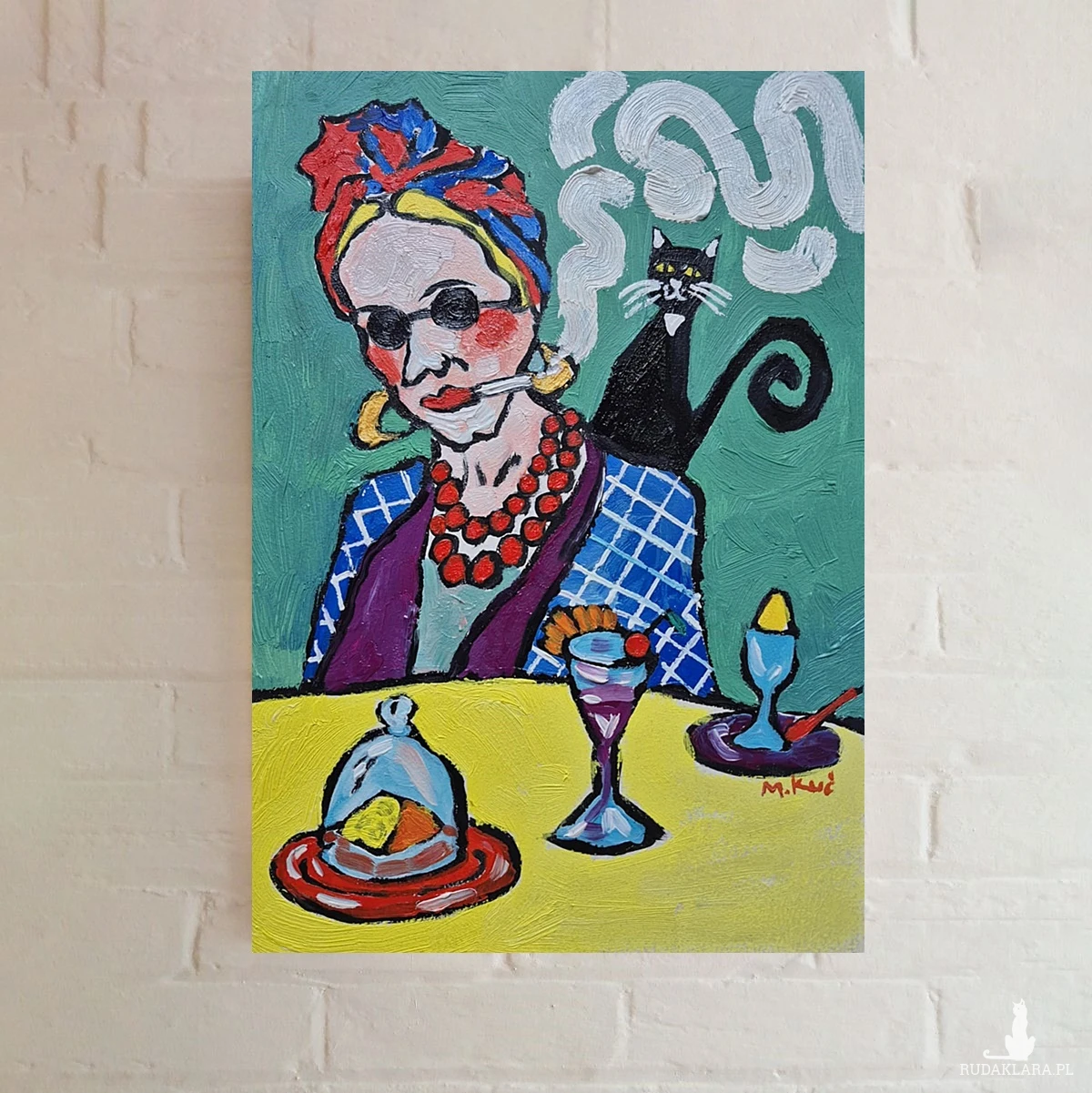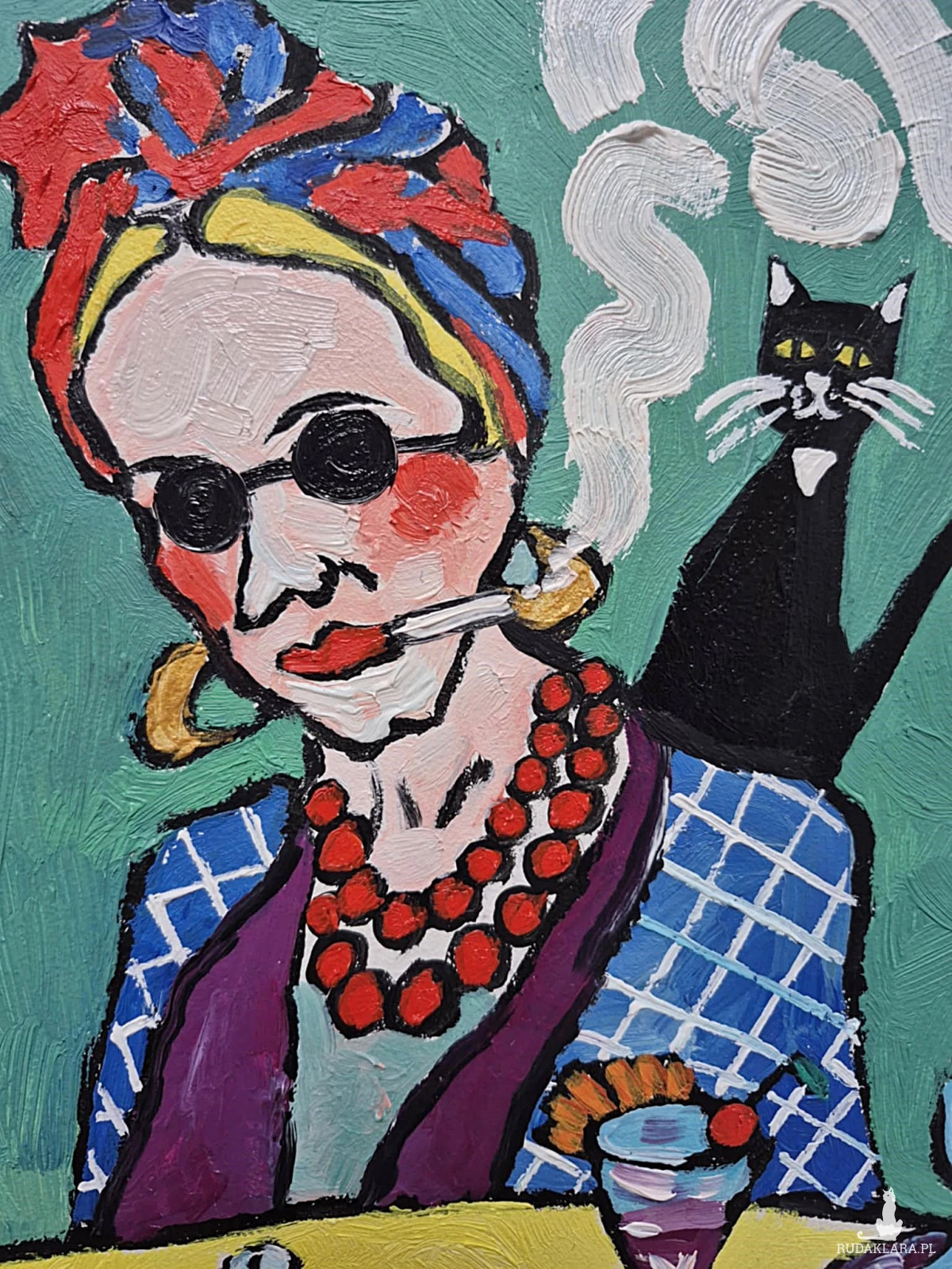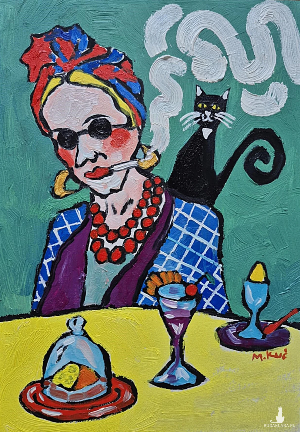Na zielonym tle siedzi kobieta – nie portret, raczej charakter. Ma twarz zbudowaną z odważnych plam koloru, jakby emocje były ważniejsze niż anatomia. Okrągłe okulary chowają spojrzenie, ale nie tajemnicę. Usta trzymają papierosa – gest nonszalancki, trochę buntowniczy, trochę zmęczony światem. Dym układa się w miękkie, wirujące znaki, niemal jak myśli, które nie chcą zostać nazwane.