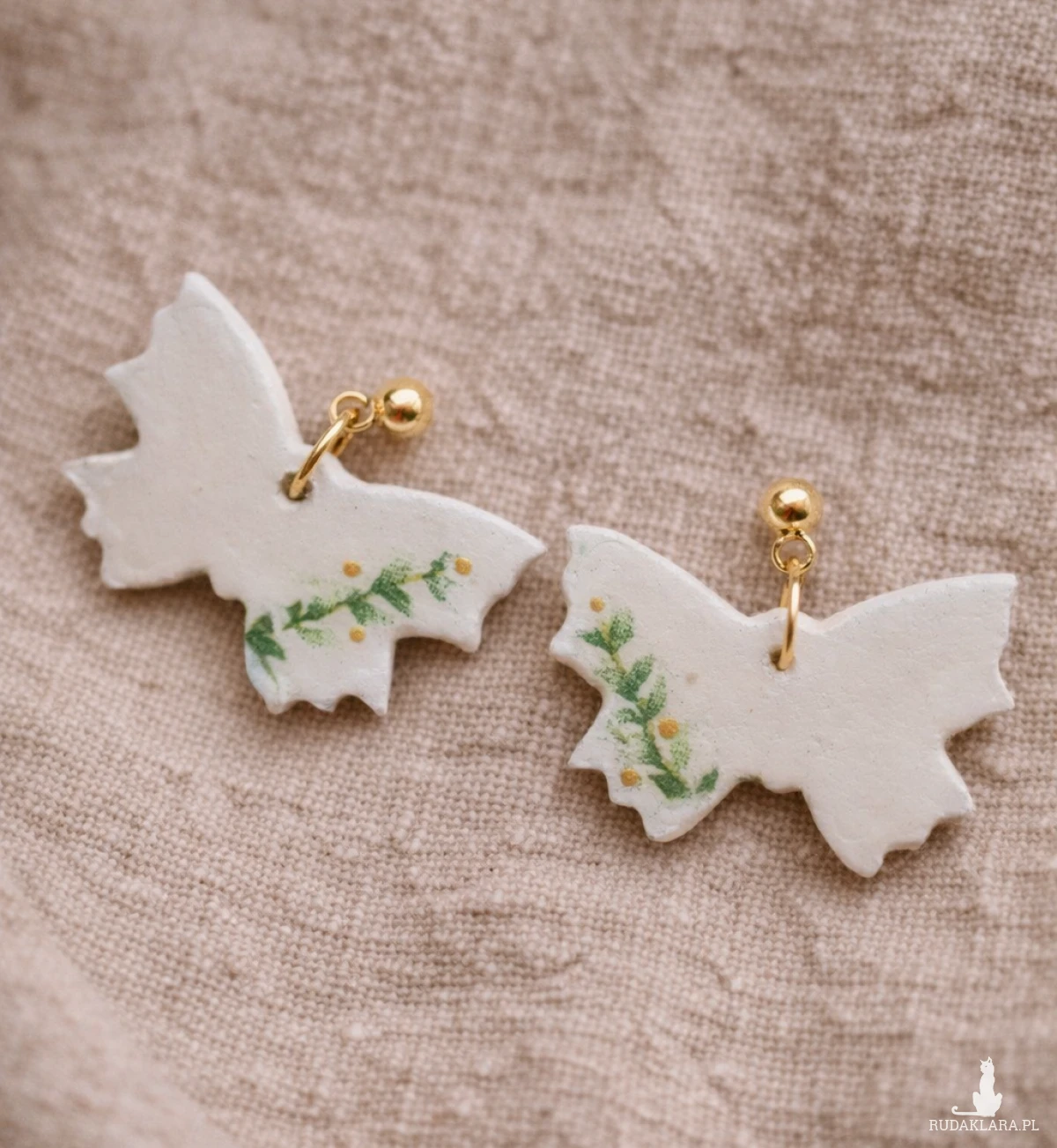 Kolczyki w kształcie motyli zostały ręcznie ulepione z gliny samoutwardzalnej. Wzór tylko z jednej strony kolczyków. Ozdoba zabezpieczona lakierem z połyskiem.Wymiary: ok. 3 cm/ 3 cm . Wkrętki ze stali chirurgicznej.