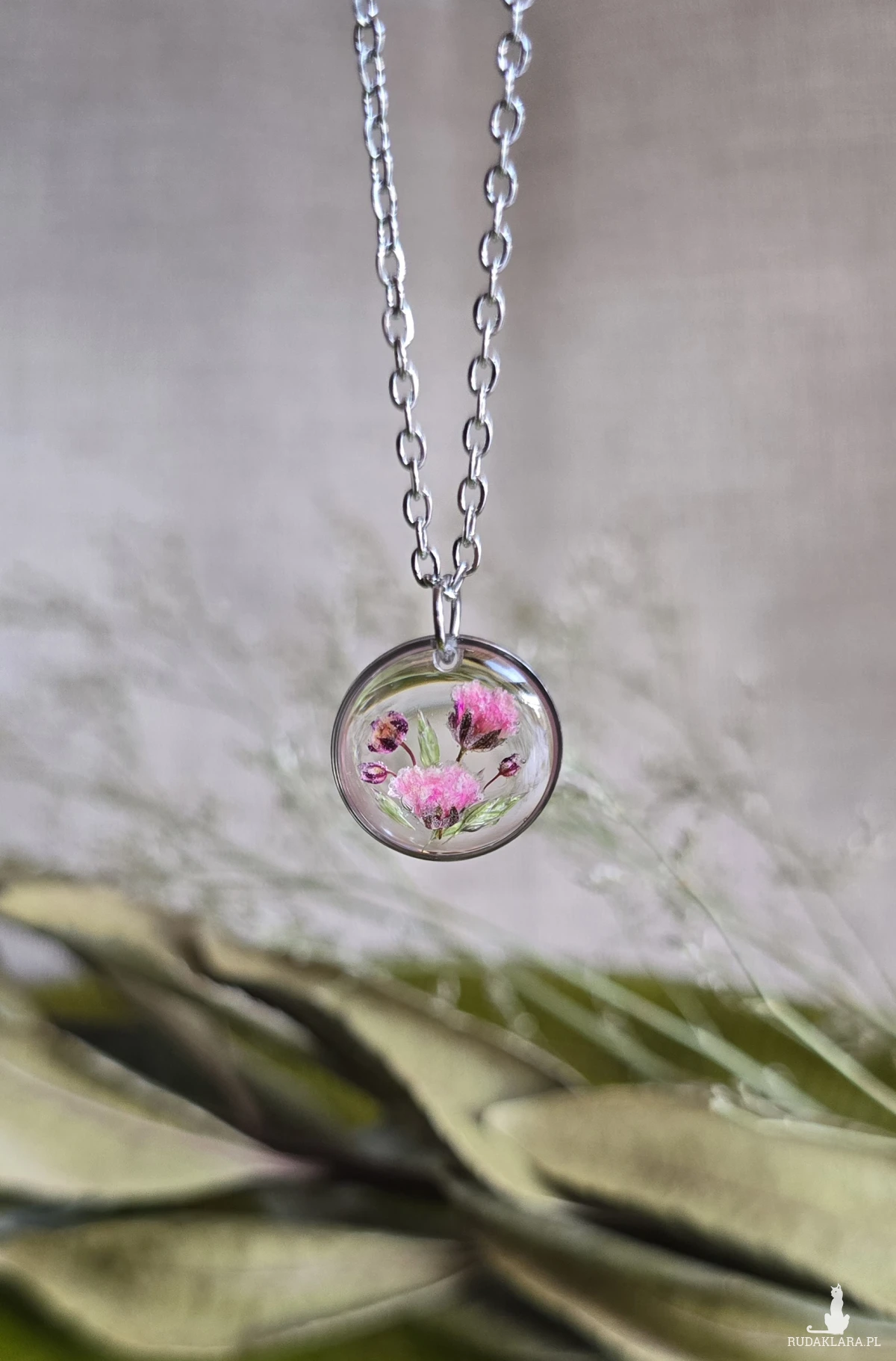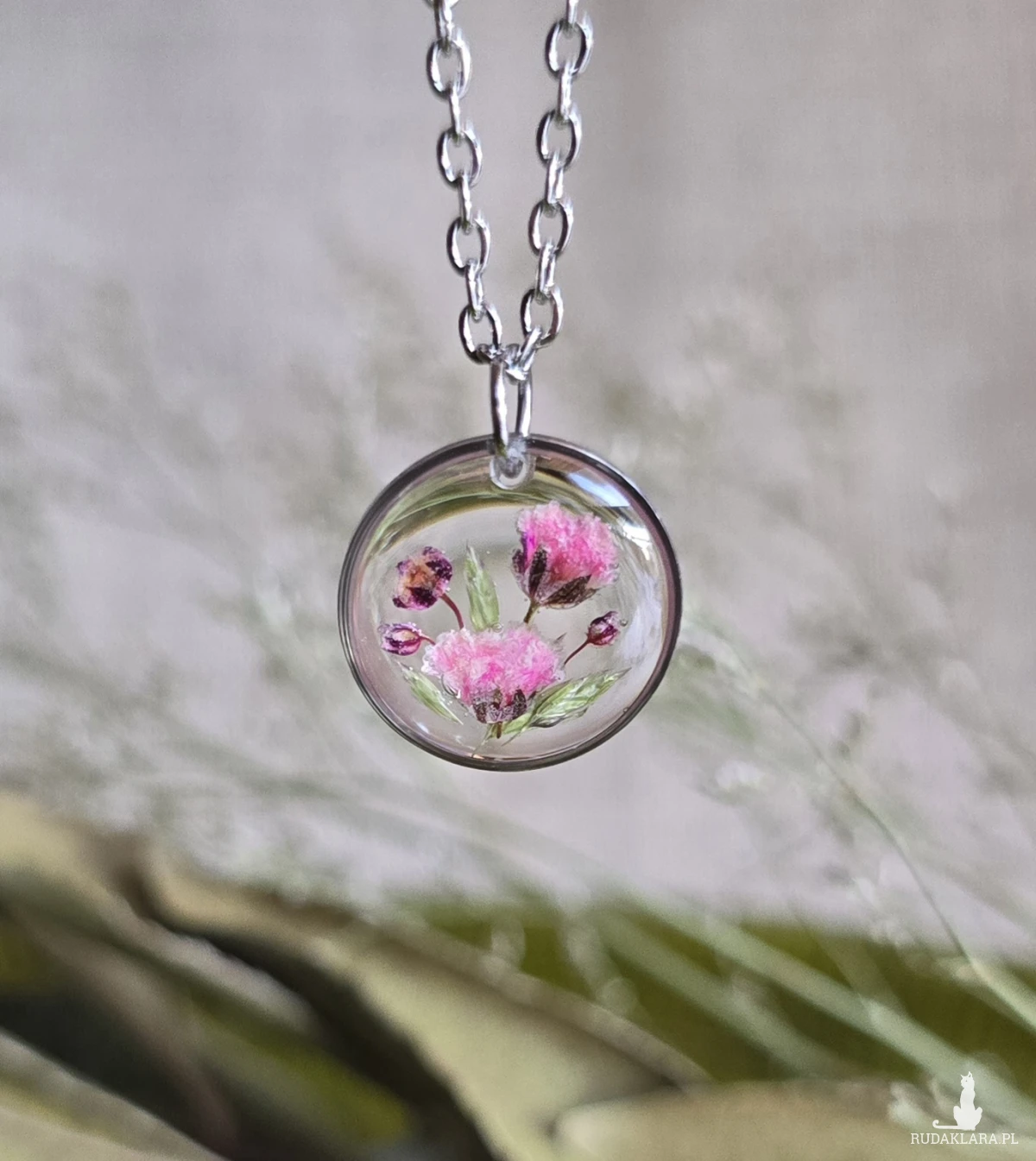 Oferuję Państwu unikalną biżuterię. Zawieszka jest wykonana z suszonych kwiatów i żywicy epoksydowej. Biżuteria jest wspaniałym i oryginalnym prezentem na lata.