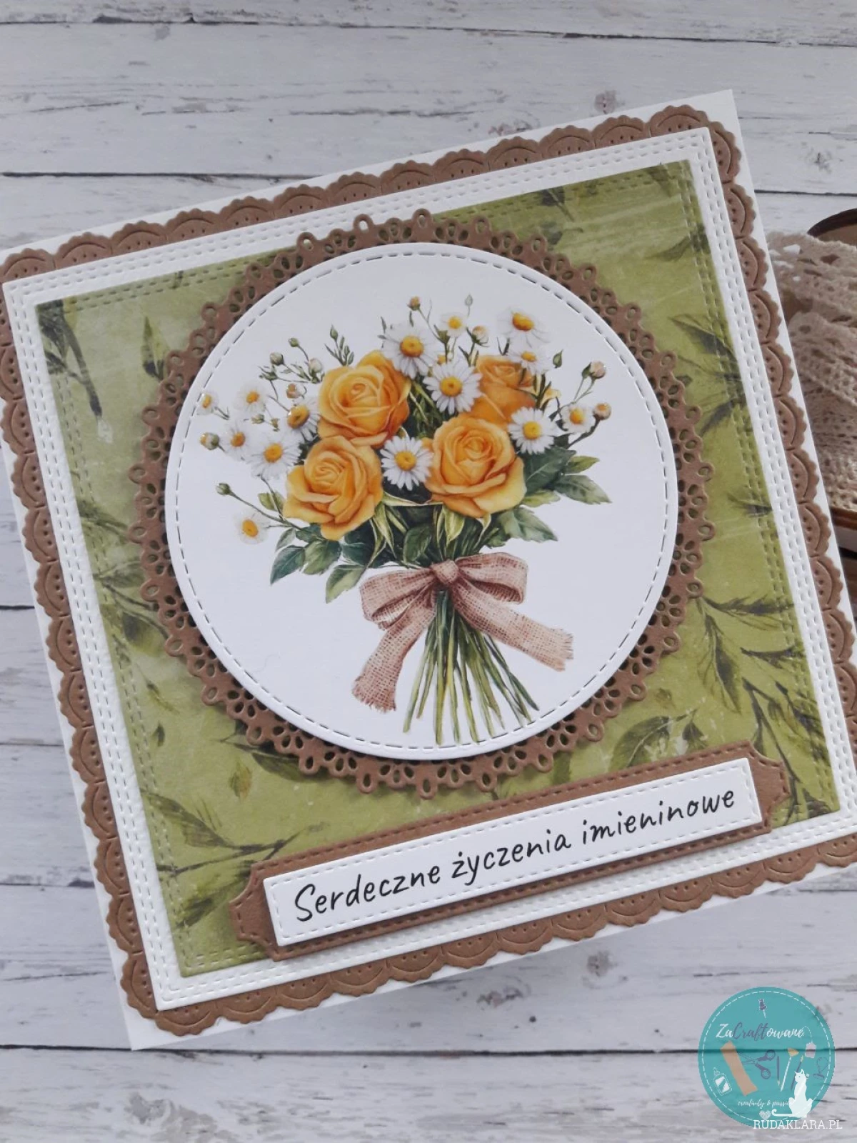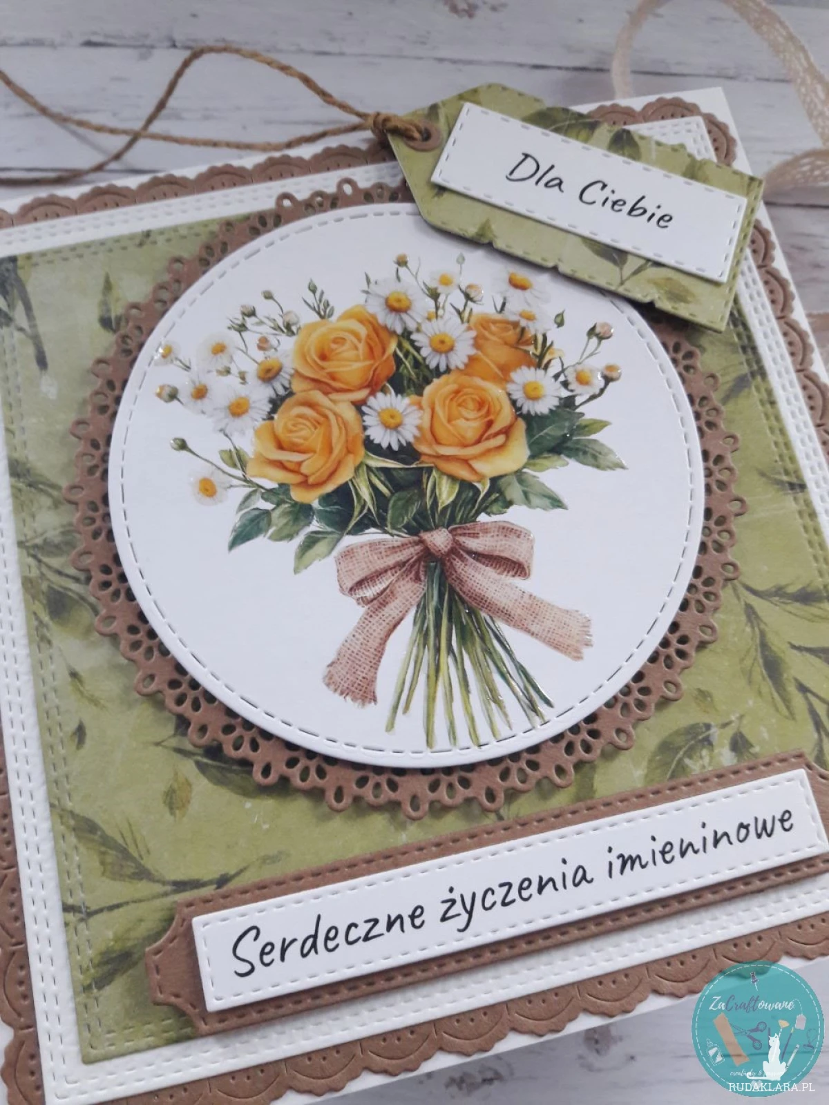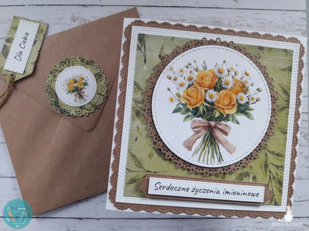 Ręcznie robiona kartka imieninowa z bukietem żółtych róż i stokrotek wykonana metodą scrapbookingu z wykorzystaniem profesjonalnych materiałów i z dbałością o każdy szczegół.