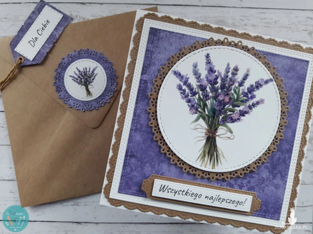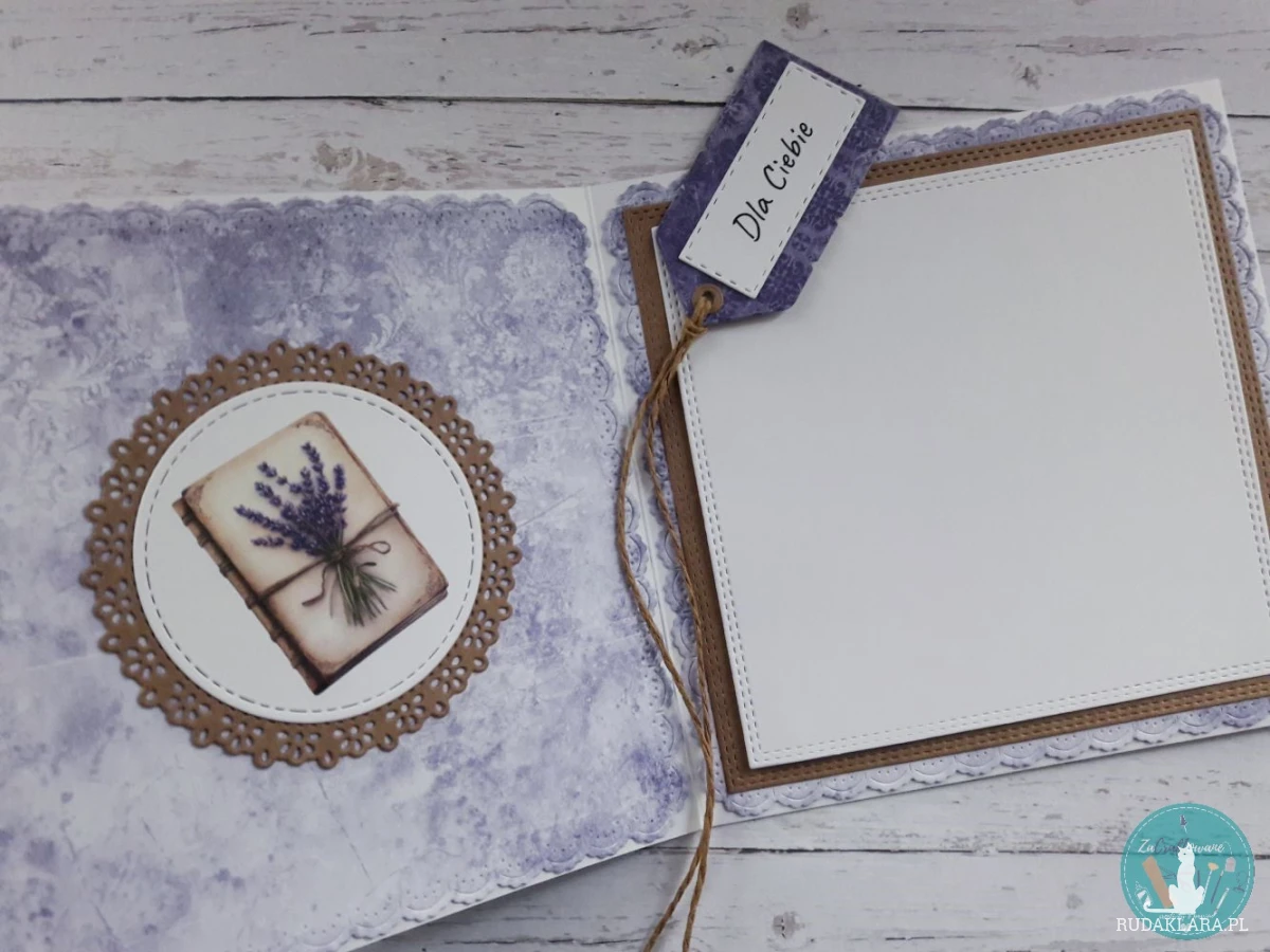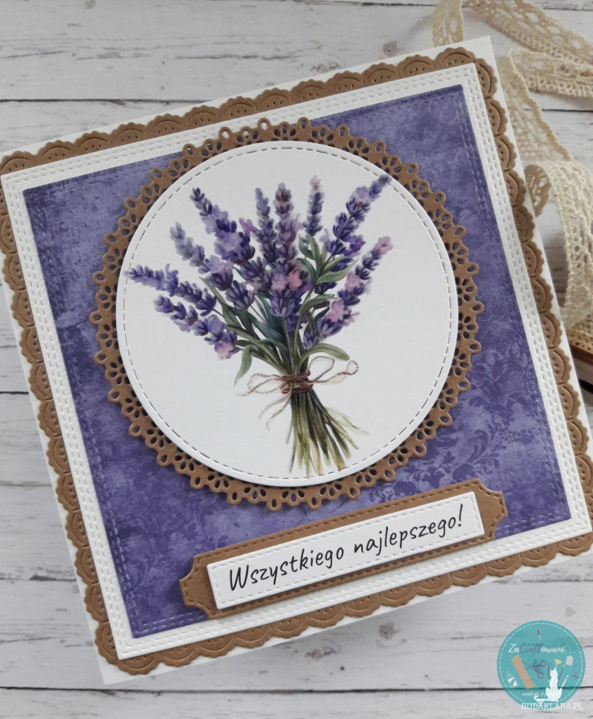 Ręcznie robiona kartka urodzinowa z bukietem lawendy wykonana metodą scrapbookingu z wykorzystaniem profesjonalnych materiałów i z dbałością o każdy szczegół.