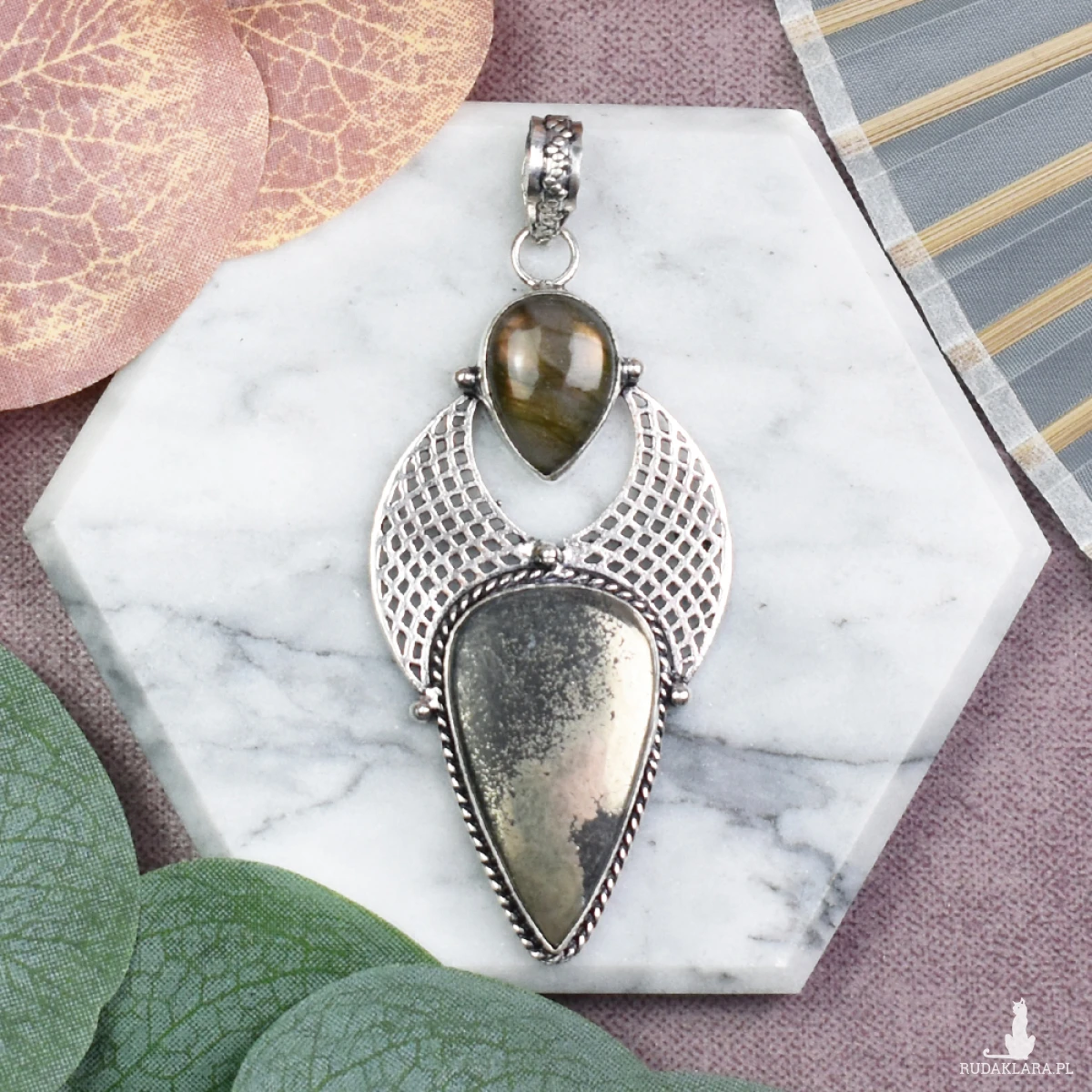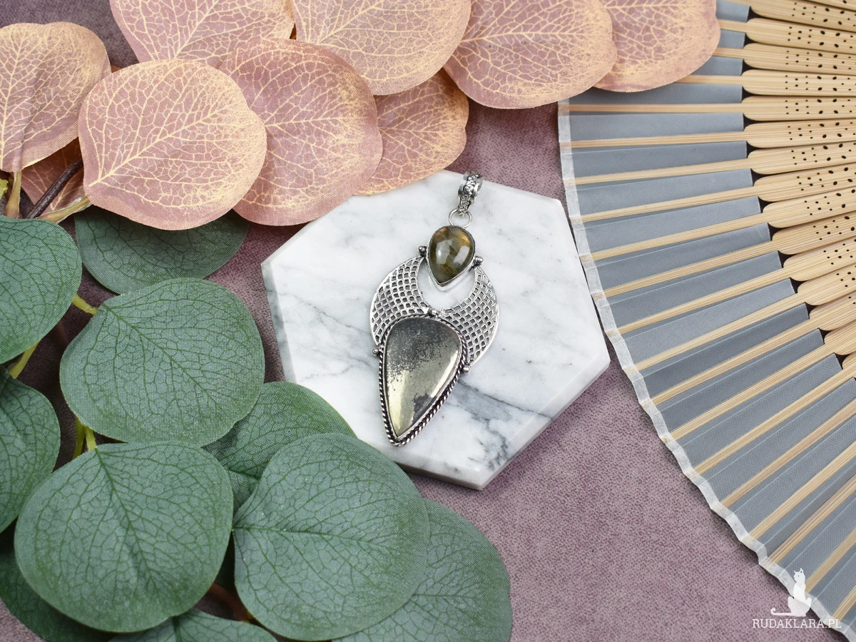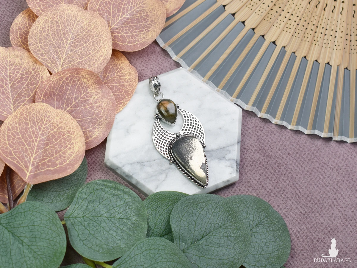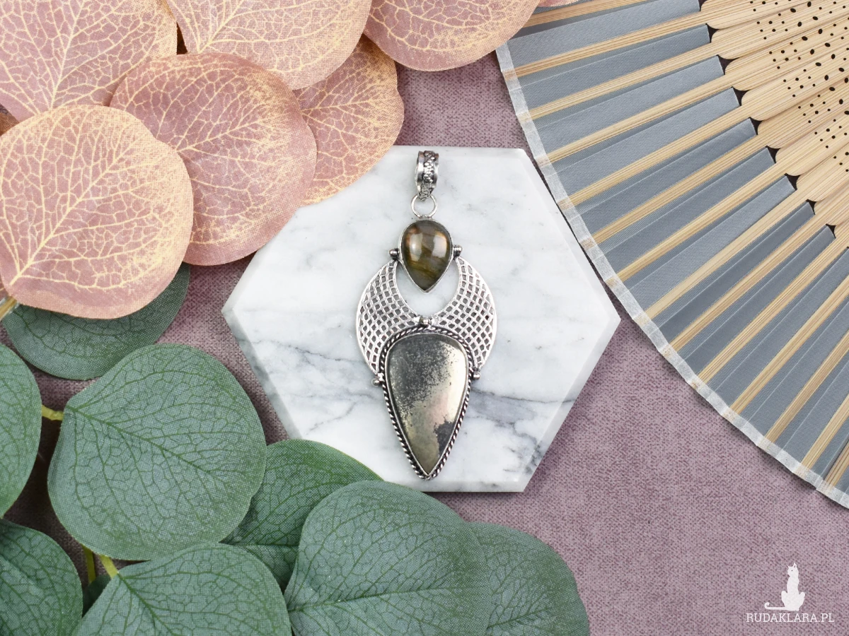 Elegancki wisiorek z miedzi, delikatnie pokryty srebrem, to niepowtarzalna ozdoba, której centralnym punktem są kamienie - pirot i labradoryt. Piryt dodaje mu subtelnego blasku, symbolizując nie tylko piękno, lecz także ochronę i pewność siebie. Labradoryt natomiast emanuje tajemniczym światłem, uznawanym za kamień intuicji, wspierający kreatywność i równowagę emocjonalną. To nie tylko biżuteria, lecz również talizman, łączący estetykę z pozytywnymi energiami kamieni naturalnych.