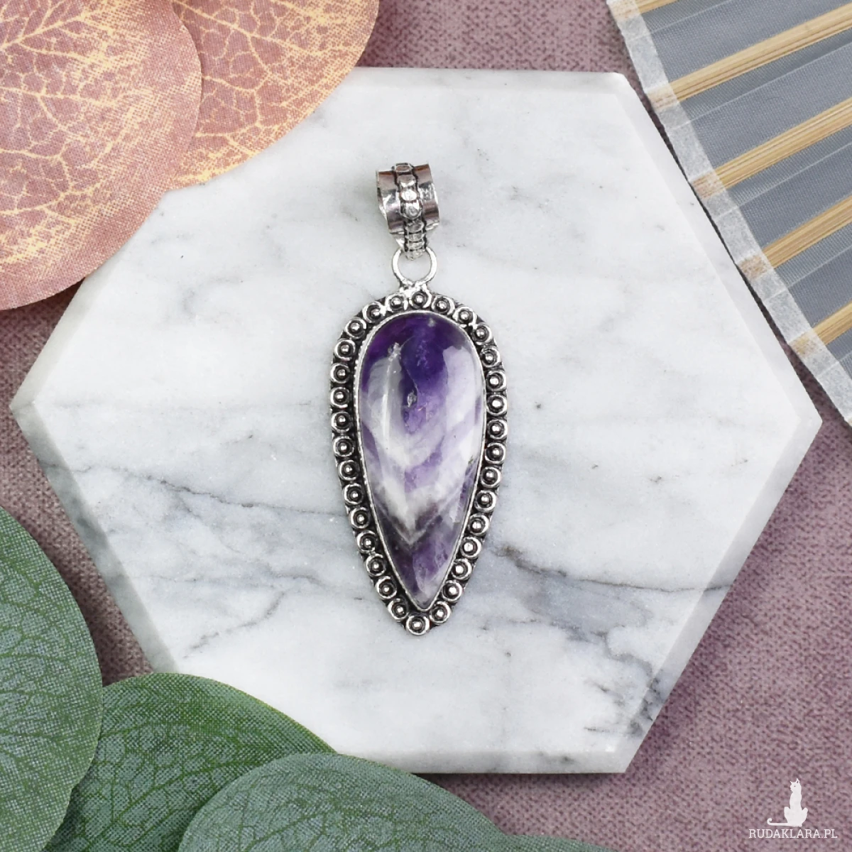 Wisiorek łączy w sobie elegancję srebra z głębokim kolorem ametystu, tworząc uniwersalny dodatek pasujący do różnych stylizacji.