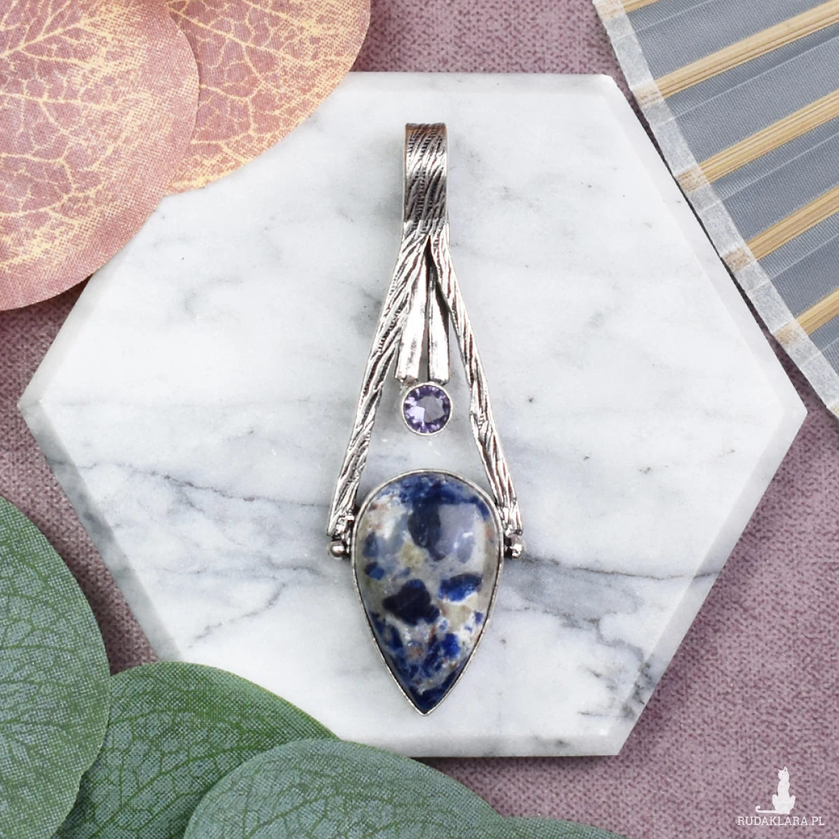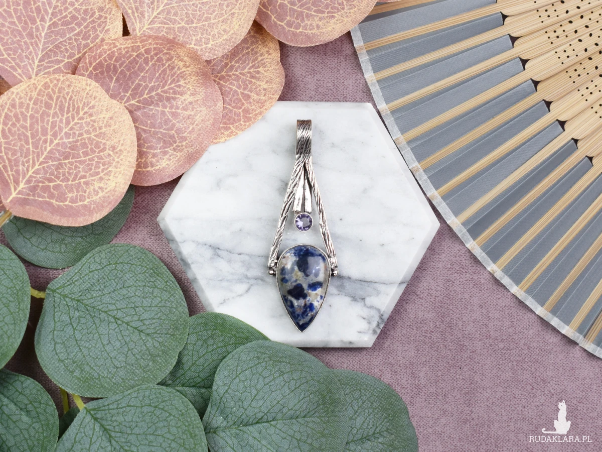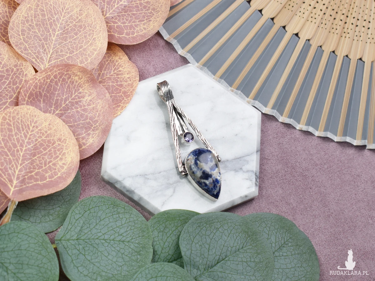 Ręcznie wykonany wisior z miedzi, pokryty srebrem próby 925, zdobiony sodalitem i małym ametystem. Sodalit jest kamieniem, który wspiera logiczne myślenie, wewnętrzny spokój oraz komunikację. Uważa się, że pomaga w wyrażaniu własnych myśli i emocji, sprzyjając jednocześnie rozwojowi duchowemu. Mały ametyst, znany z właściwości uspokajających, wzmacnia te cechy, dodając ochrony i równowagi emocjonalnej. Połączenie tych dwóch kamieni czyni wisior idealnym do noszenia na co dzień, jako wsparcie dla klarowności umysłu i duchowej harmonii.