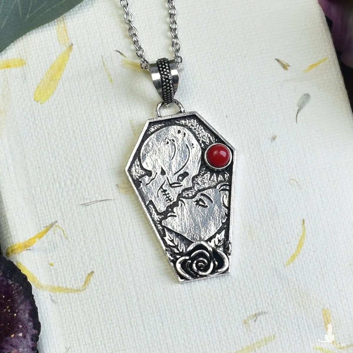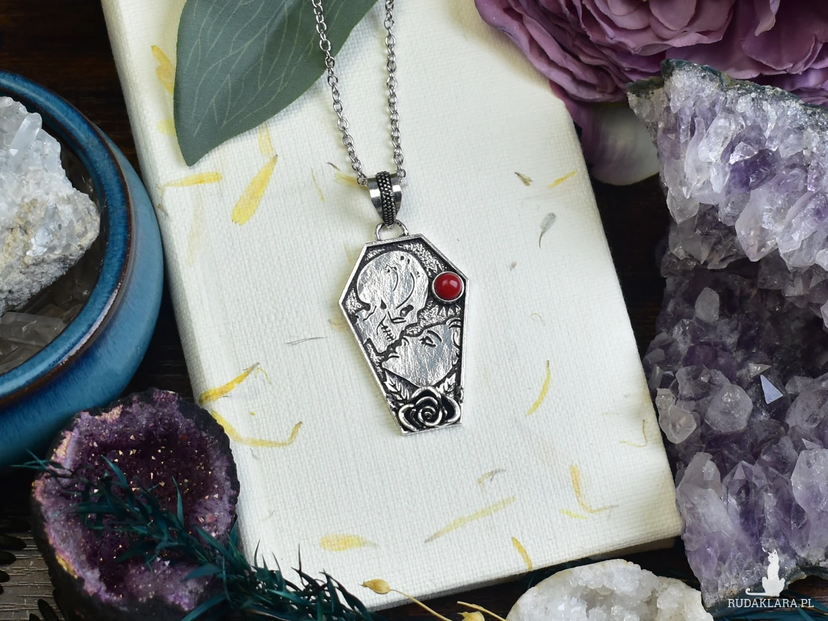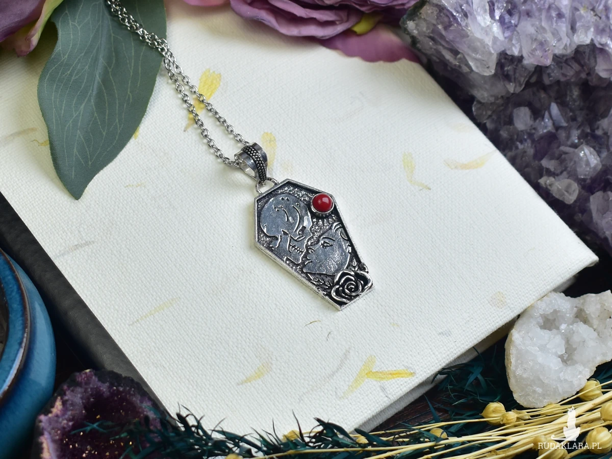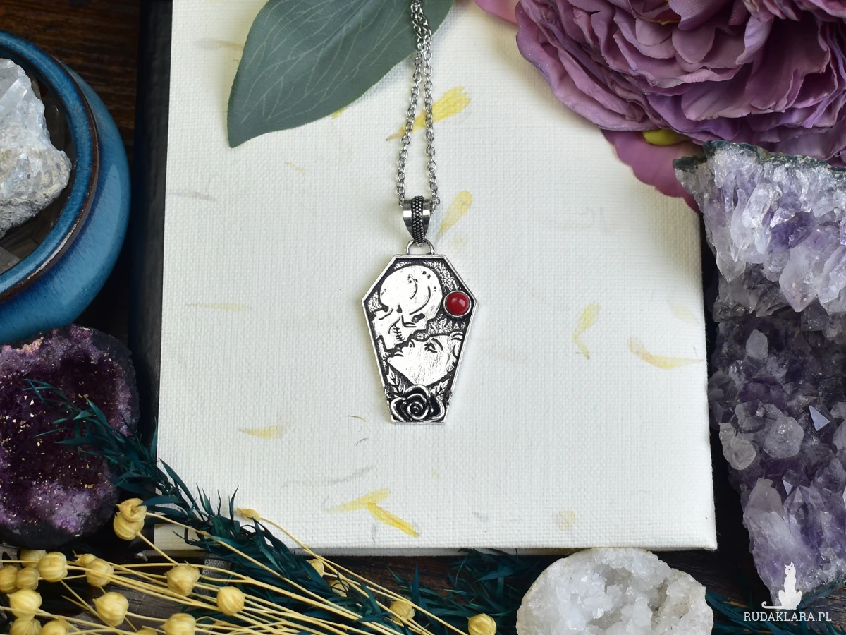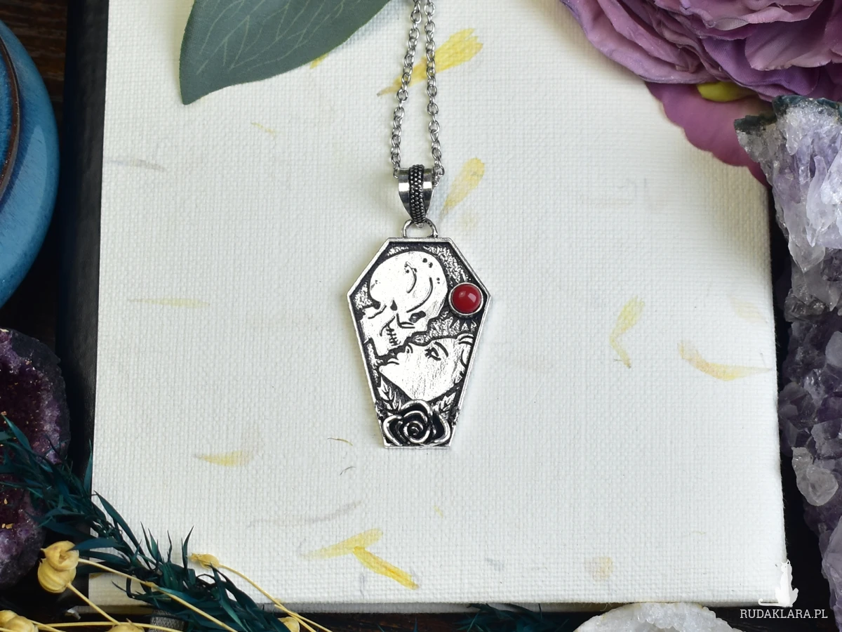 Wisiorek wykonany ze srebra próby 925 metodą Art Clay, w kształcie trumny, z malutkim koralem. Wisiorek przedstawia scenkę miłosną, z wizerunkiem kobiety i trupa, nawiązującą do motywu „till death do us part”. Detale w tym unikalnym projekcie oddają intensywność i trwałość uczucia, nawet w obliczu śmierci. Koral, umieszczony w centralnym punkcie, dodaje subtelnego koloru i symbolizuje miłość oraz życie. Ten wisiorek to wyraz silnej więzi i oddania, idealny dla osób, które cenią sobie głębokie, nieprzemijające uczucia.