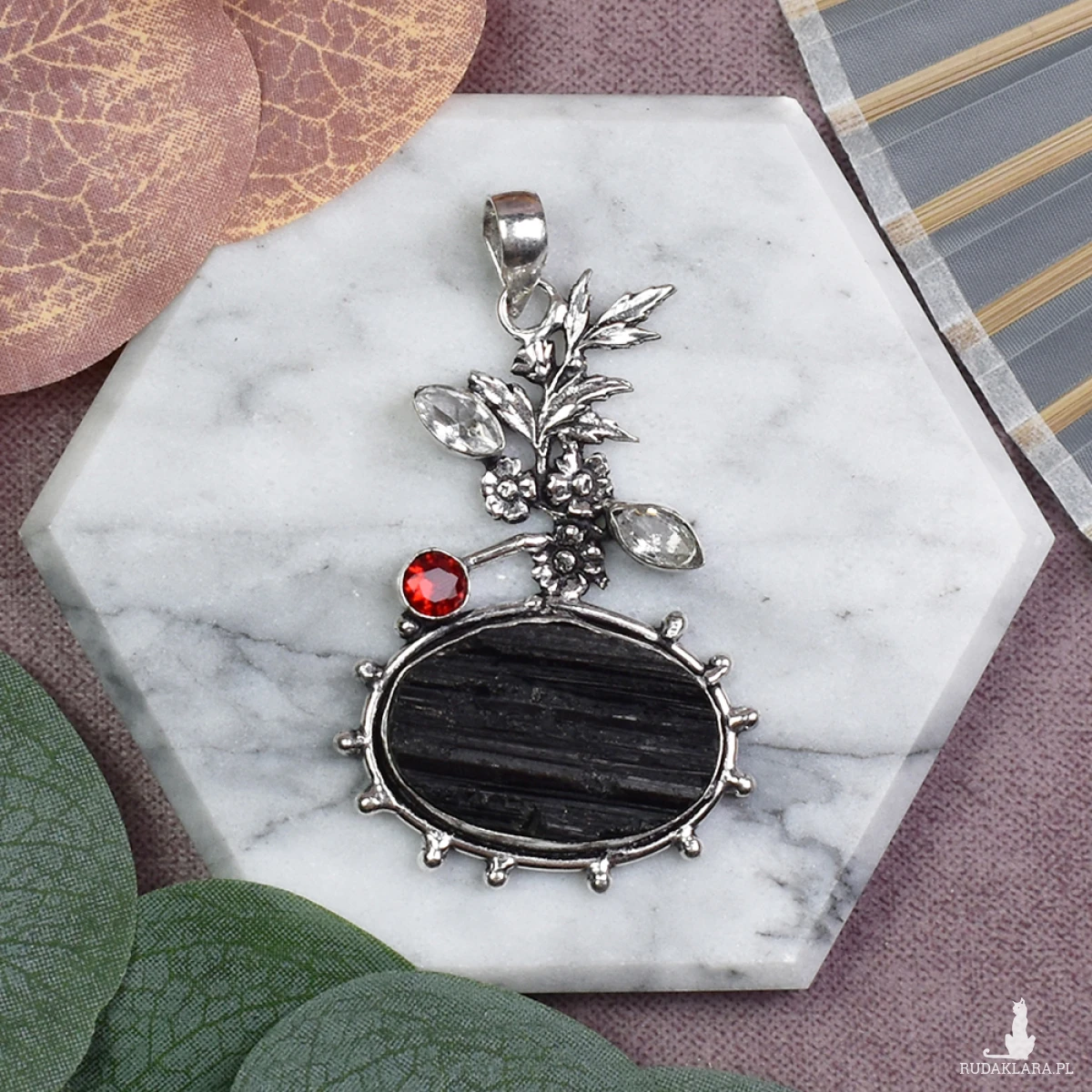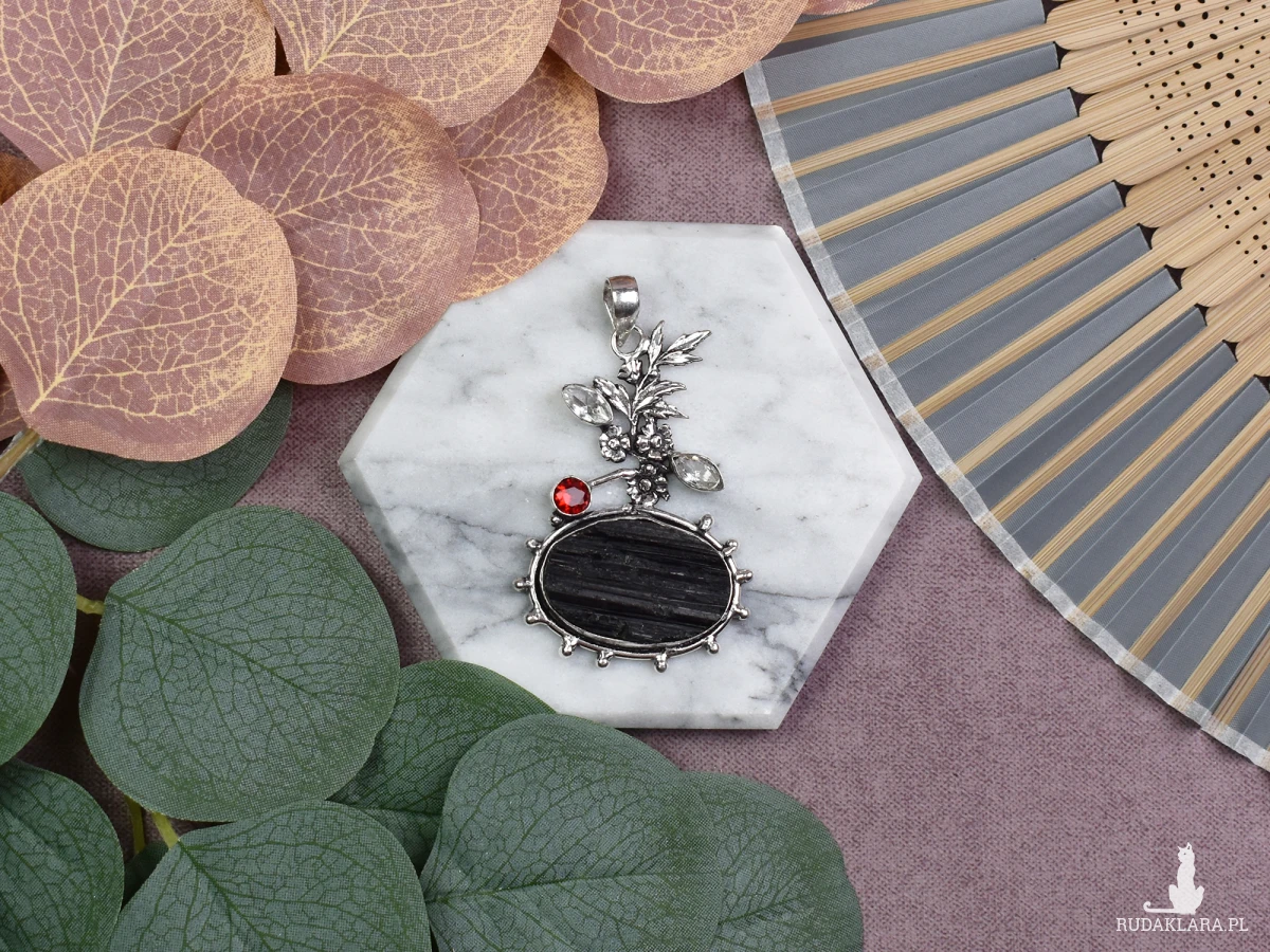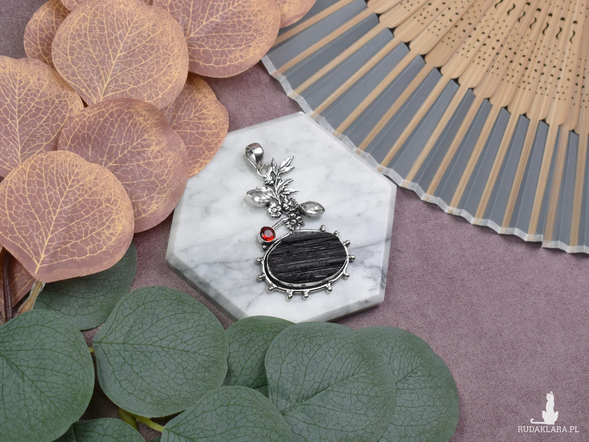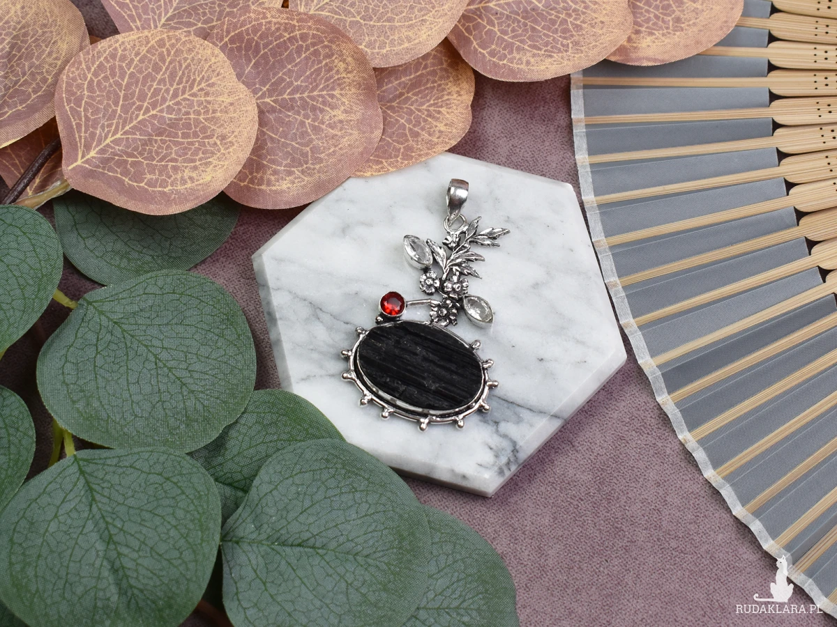 Ręcznie wykonany wisiorek z miedzi, pokryty srebrem próby 925, z surowym turmalinem, małymi topazami oraz ozdobnym motywem kwiatowym. Surowy turmalin jest ceniony za swoje właściwości ochronne i oczyszczające. Uważa się, że pomaga w uziemieniu, uwalnianiu negatywnych energii i wspieraniu równowagi emocjonalnej. Małe topazy dodają wisiorkowi delikatności i blasku, jednocześnie przynosząc optymizm i pozytywną energię. Ozdobny motyw kwiatowy symbolizuje odrodzenie i naturalne piękno, podkreślając subtelny charakter wisiorka. To połączenie ochrony, radości i harmonii tworzy unikalny talizman idealny na co dzień.