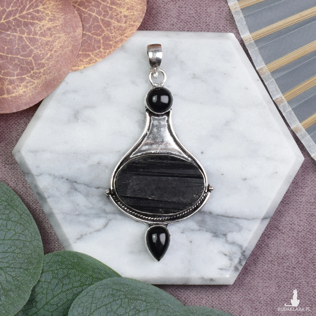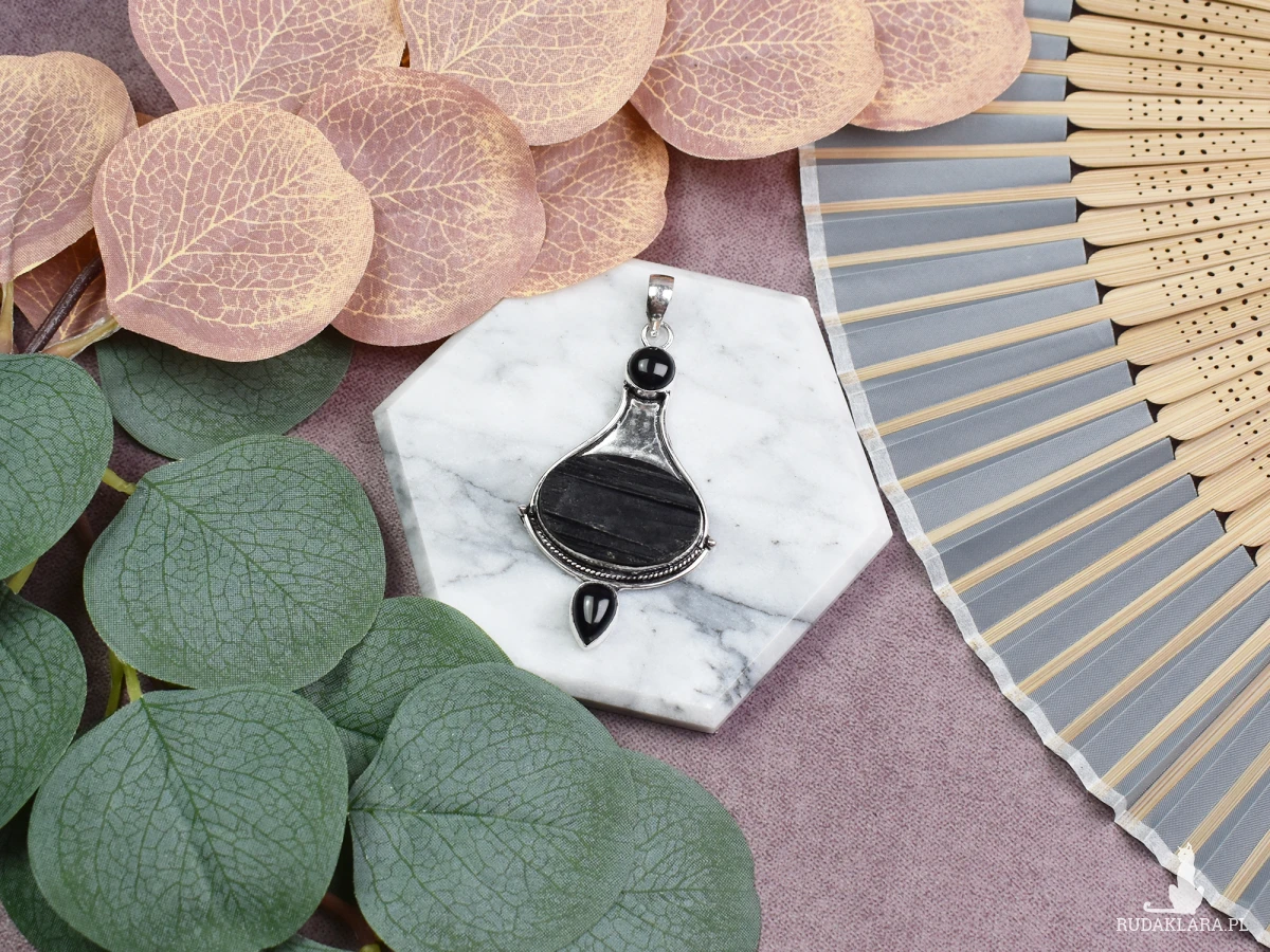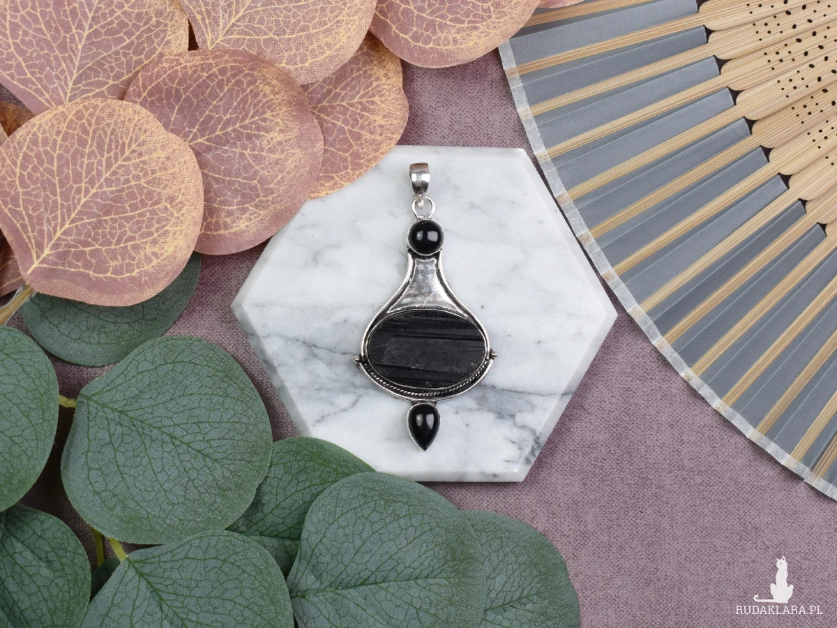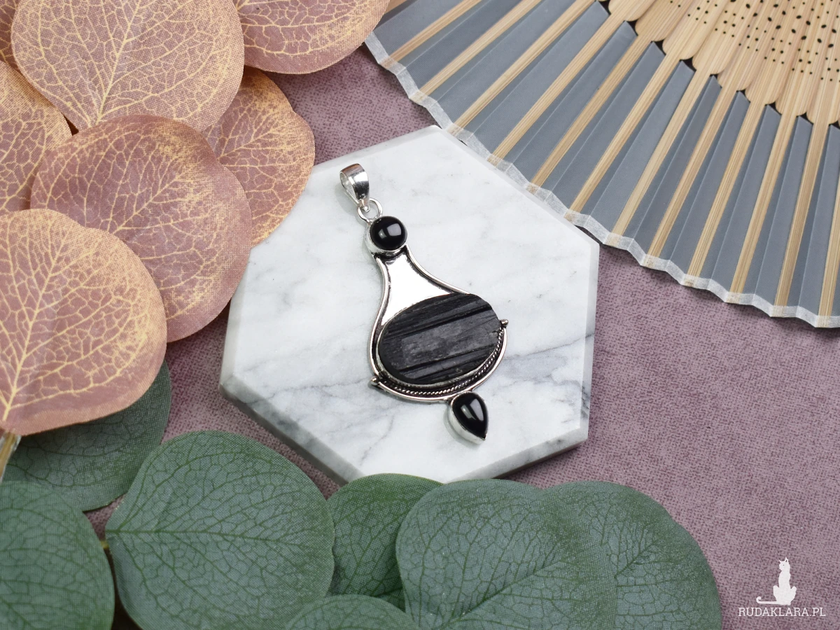 Ręcznie wykonany wisiorek z miedzi, pokryty srebrem próby 925, z dużym surowym turmalinem oraz dwoma małymi onyksami. Surowy turmalin jest znany ze swoich silnych właściwości ochronnych, pomagając w oczyszczaniu negatywnych energii i uziemieniu. Wspiera równowagę emocjonalną oraz siłę wewnętrzną. Onyks, często kojarzony z mocą i determinacją, wzmacnia poczucie stabilności i wytrwałości. W połączeniu te kamienie tworzą wisiorek, który oferuje silną ochronę oraz wsparcie duchowe, idealny dla osób poszukujących wewnętrznej równowagi i spokoju.