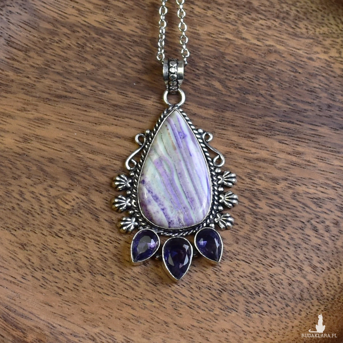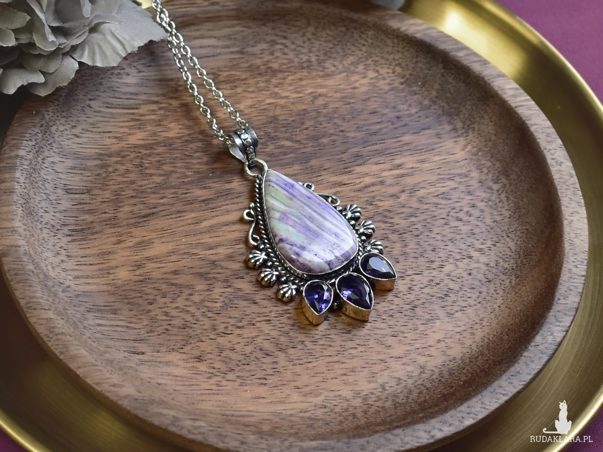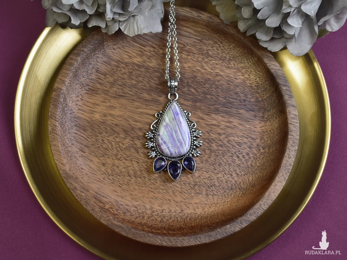 Ręcznie wykonany wisiorek z miedzi, pokryty srebrem. Zawiera jaspis w fioletowym odcieniu oraz ametysty. Jaspis jest ceniony za swoje właściwości ochronne i uspokajające. Ametyst, znany jako kamień harmonii, wspiera wewnętrzny spokój i równowagę. Idealny dodatek dla miłośników unikalnej biżuterii.