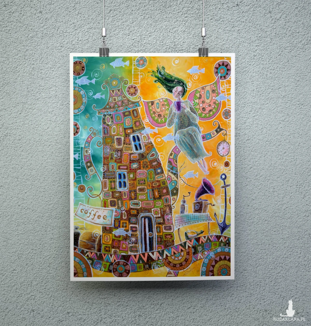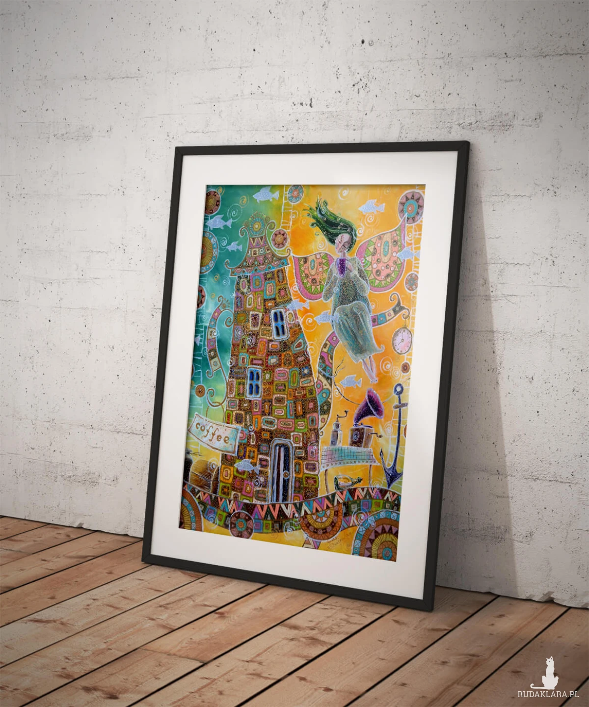 Reprodukcja pracy własnej z serii "Anioły i morze" wykonana na wysokiej jakości papierze satynowanym o gramaturze 200-220 g/m². Sprzedawana bez ramy.