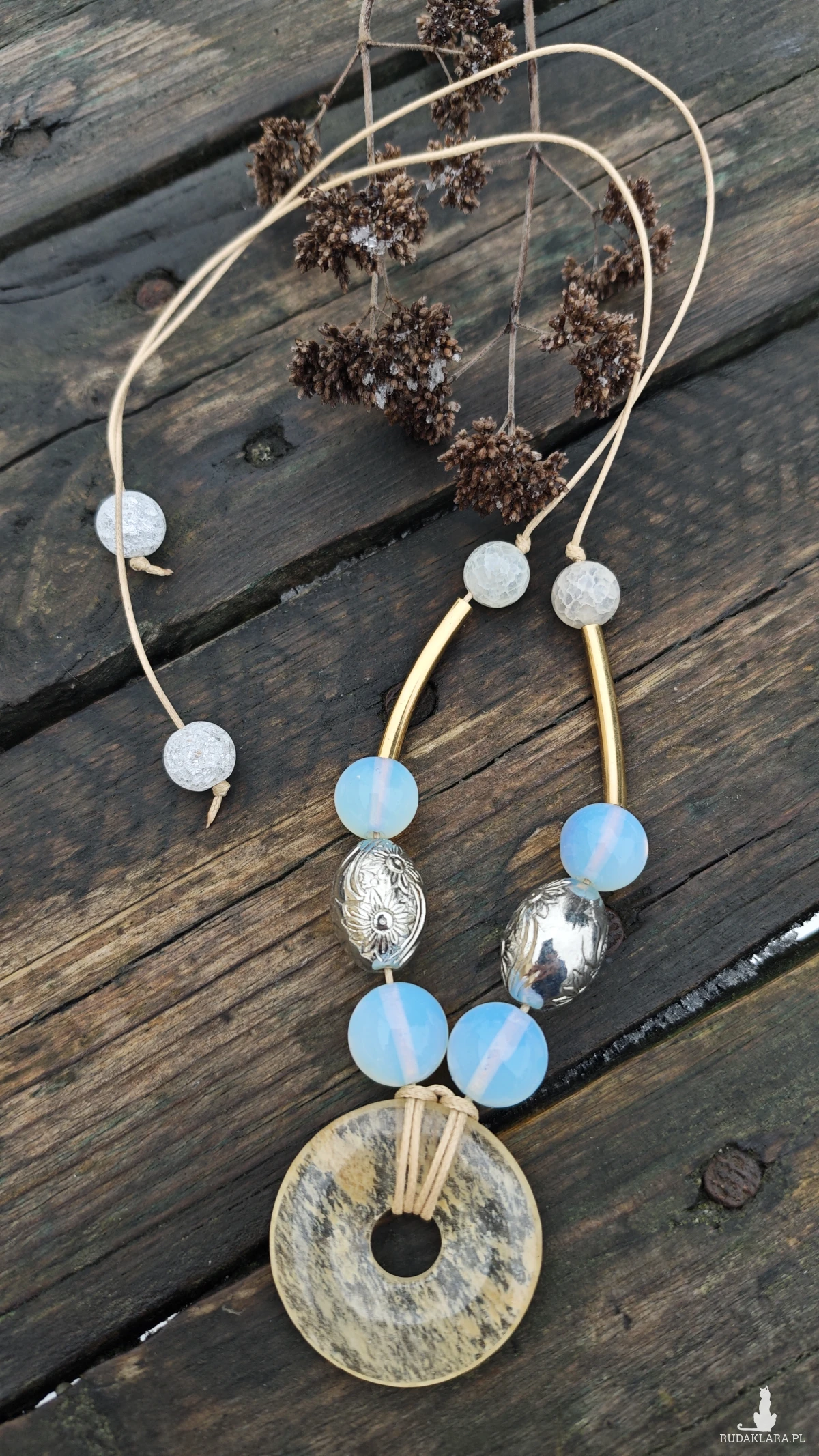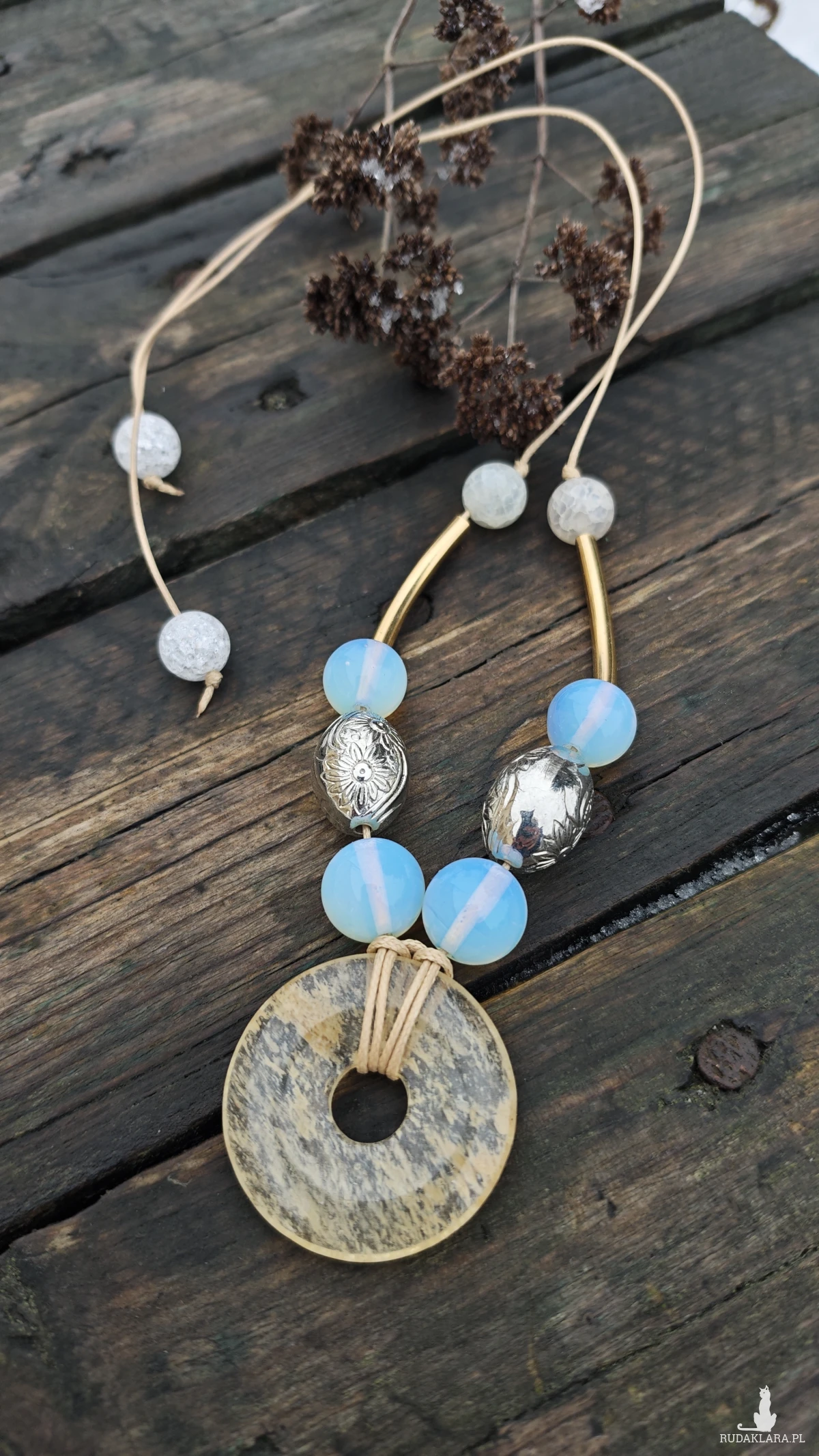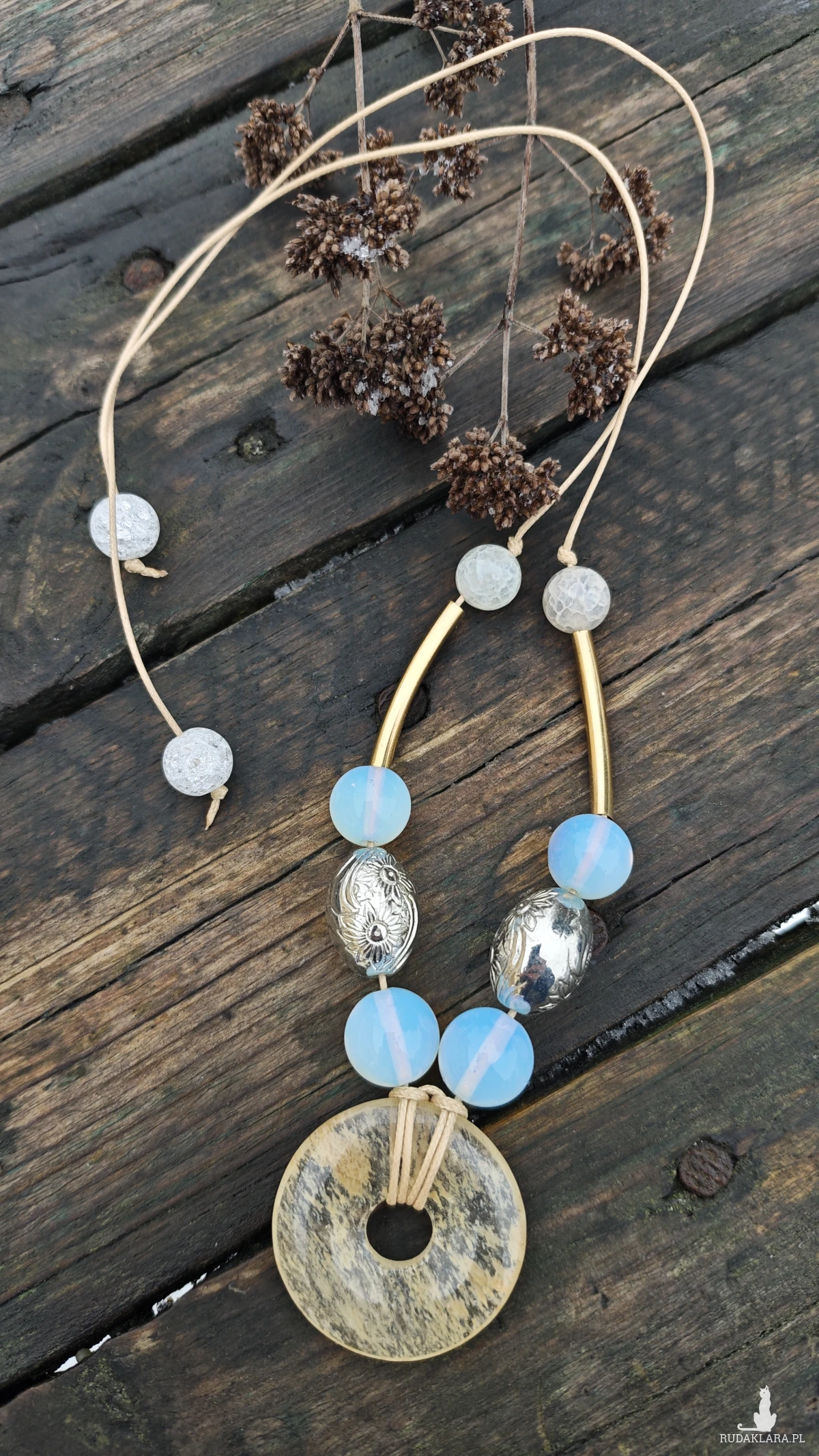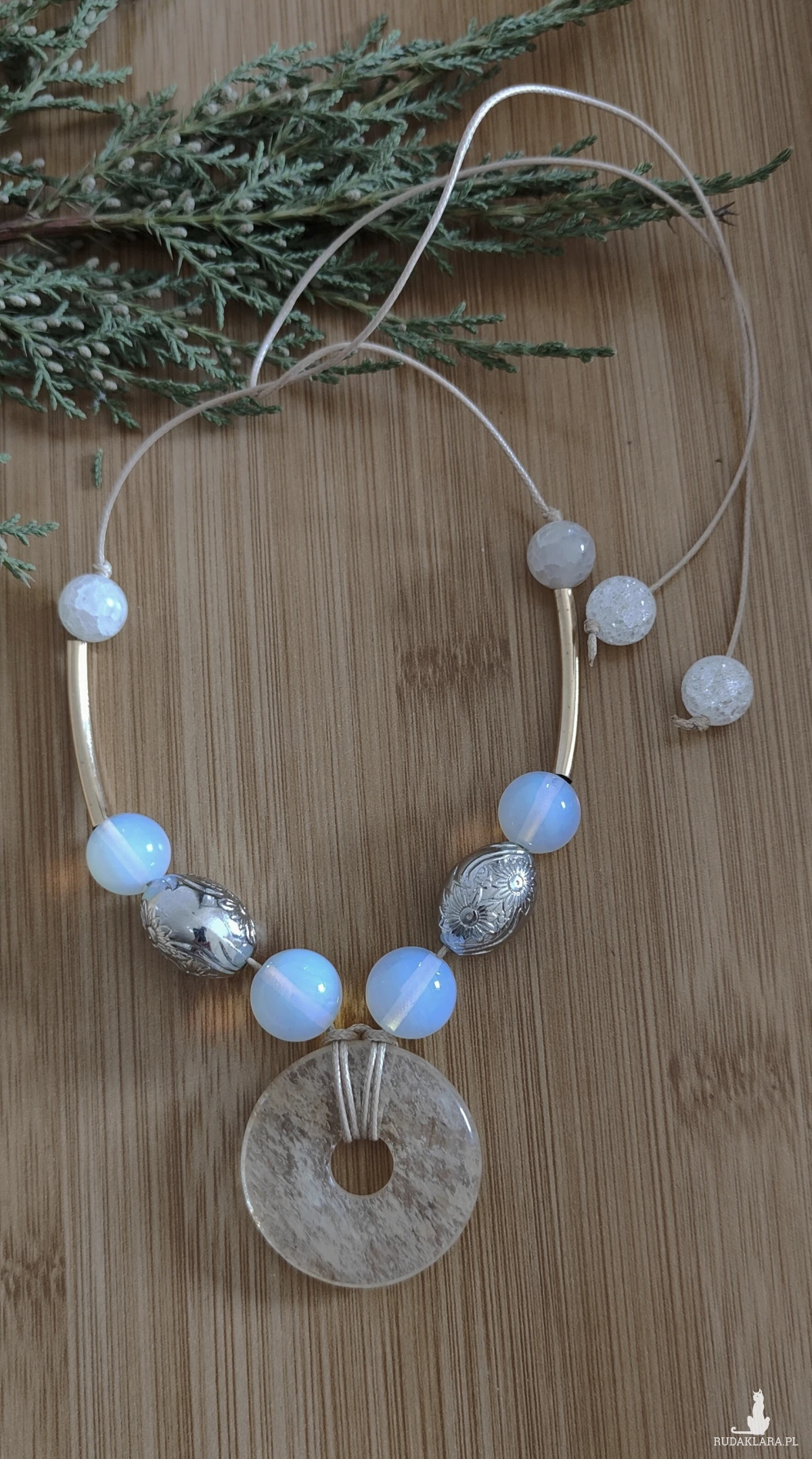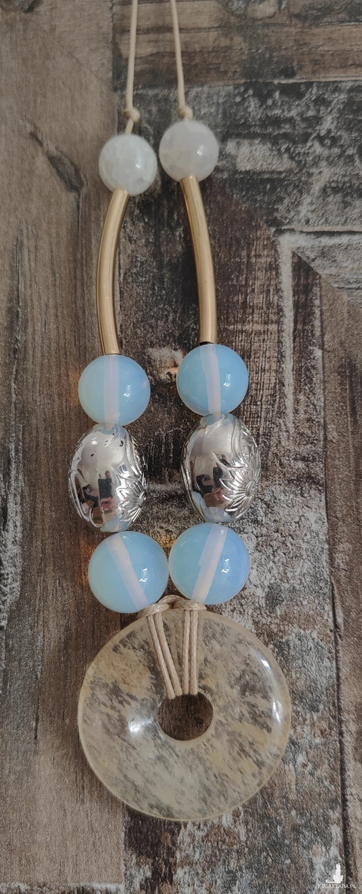 ,, wisior z dyskiem,, to wisior utrzymany w kolorystyce bieli, srebra i złota, wykonany z kwarcu, agatu, opali i zawieszony na woskowanym sznurku w kolorze beżu. Wisior ma regulowaną długość.