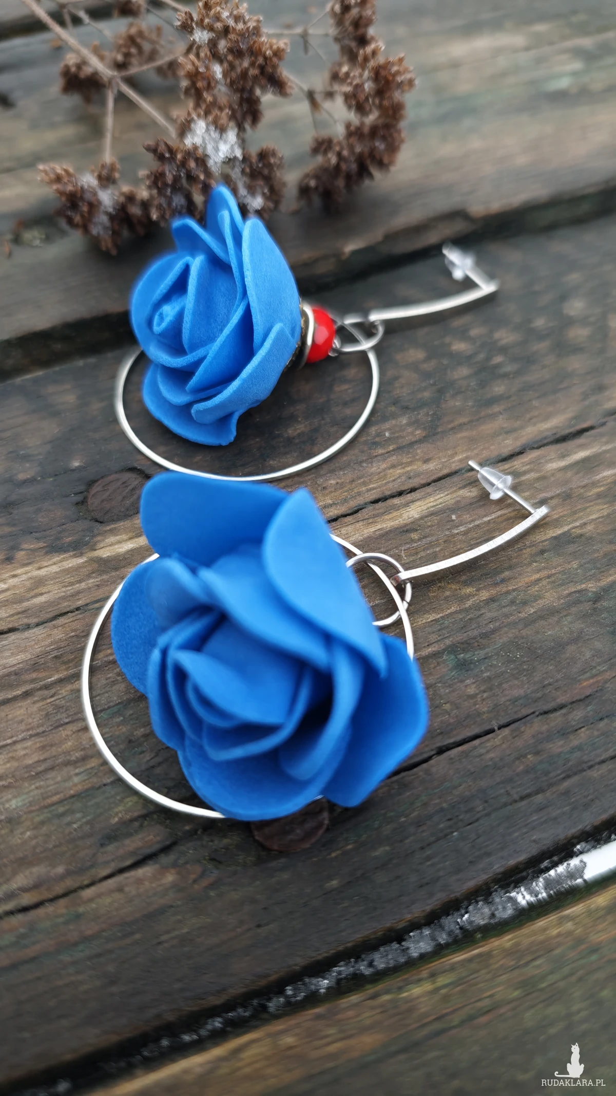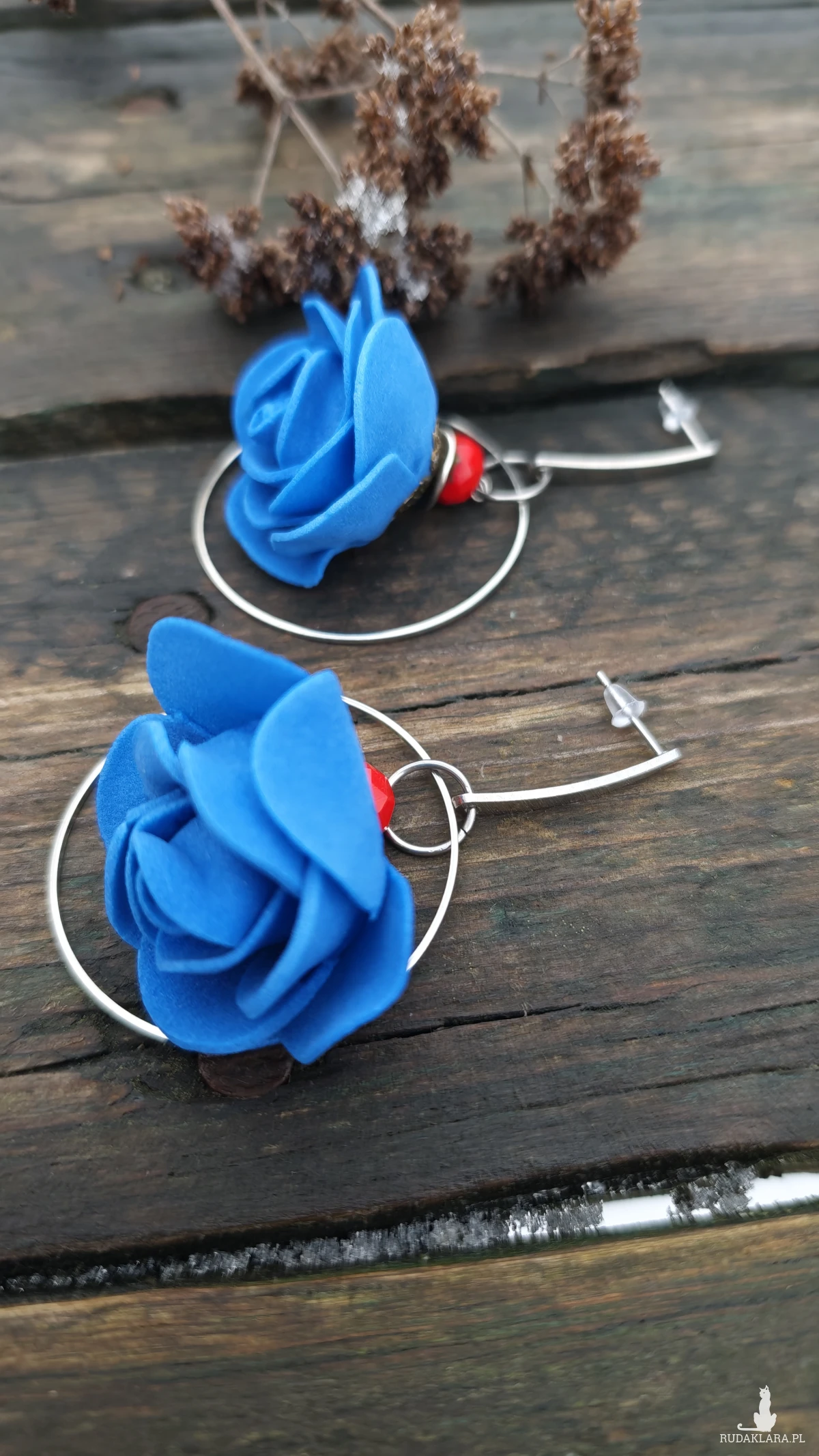 ,,z niebieskim kwiatkiem,, to kolczyki wykonane na obręczach w kolorze srebrnym i niebieskiego kwiatka z pianki. Kolczyki zawieszone są na ozdobnych biglach typu sztyft wykonanych ze stali szlachetnej.