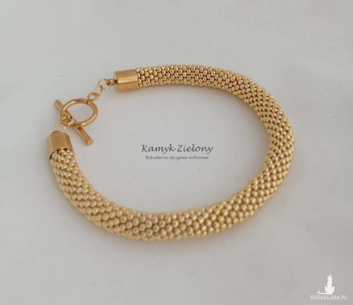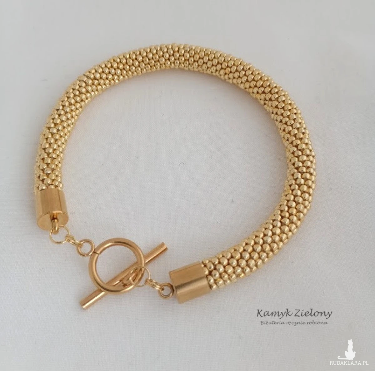 Bransoletka o nieco grubszym przekroju z wysokiej jakości szklanych koralików Toho w kolorze złotym. Do jej wykonania wykorzystane zostały najwyższej jakości koraliki z warstwą złotego koloru naniesioną w procesie produkcji metodą galwanizowania. Dzięki zastosowaniu specjalnej powłoki Permanent Finish, kolor koralików jest wyjątkowo trwały - nie ściera się ani nie ulega ciemnieniu czy wyblaknięciu w trakcie użytkowania bransoletki.