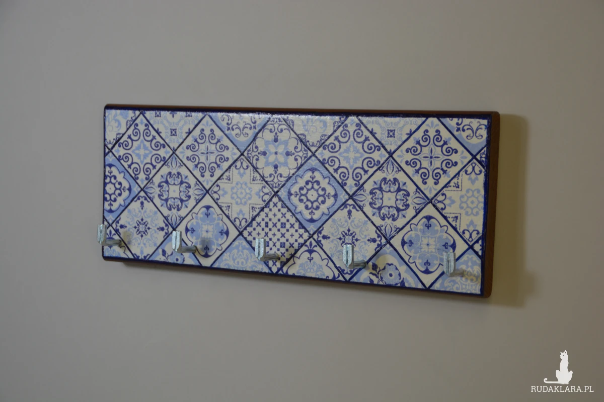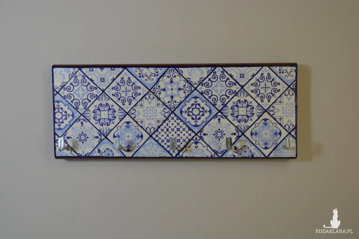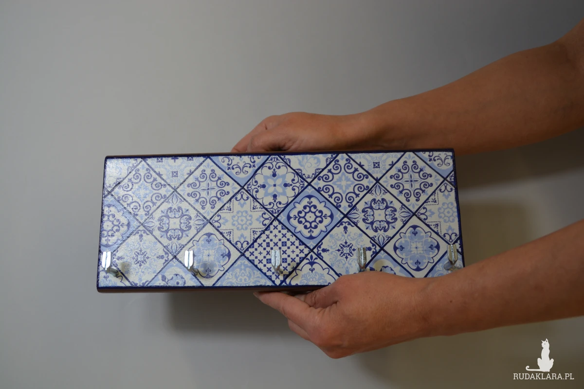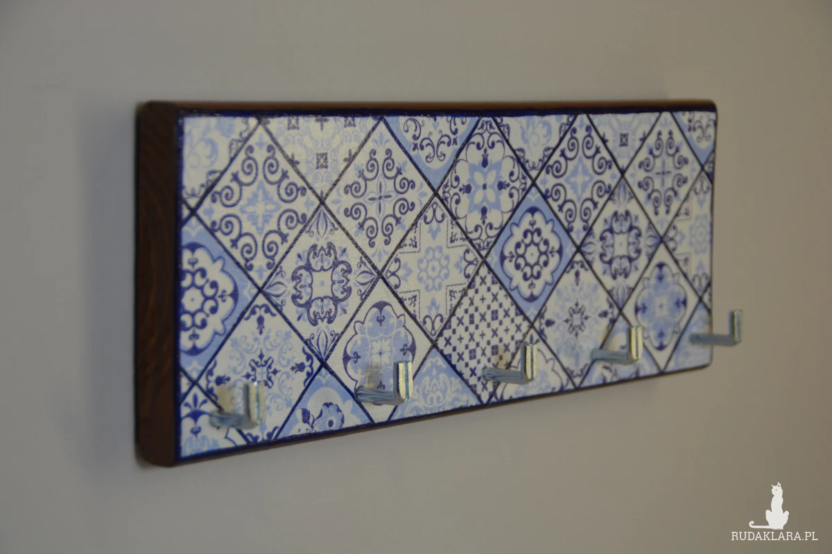 Dodaj swojemu wnętrzu stylu i funkcjonalności dzięki temu ręcznie wykonanemu drewnianemu wieszakowi na klucze, ozdobionemu techniką decoupage w klasycznym niebiesko-białym stylu azulejo.