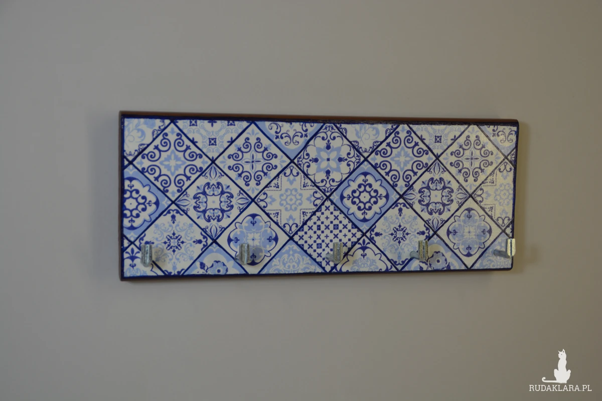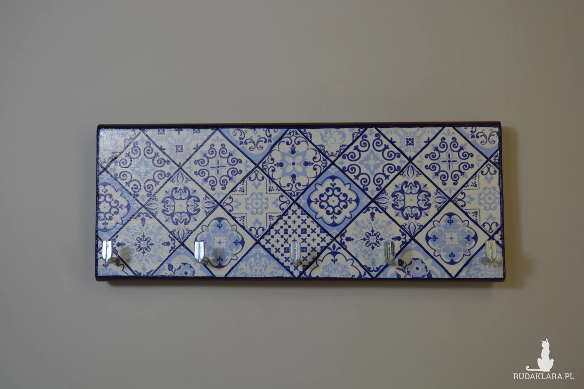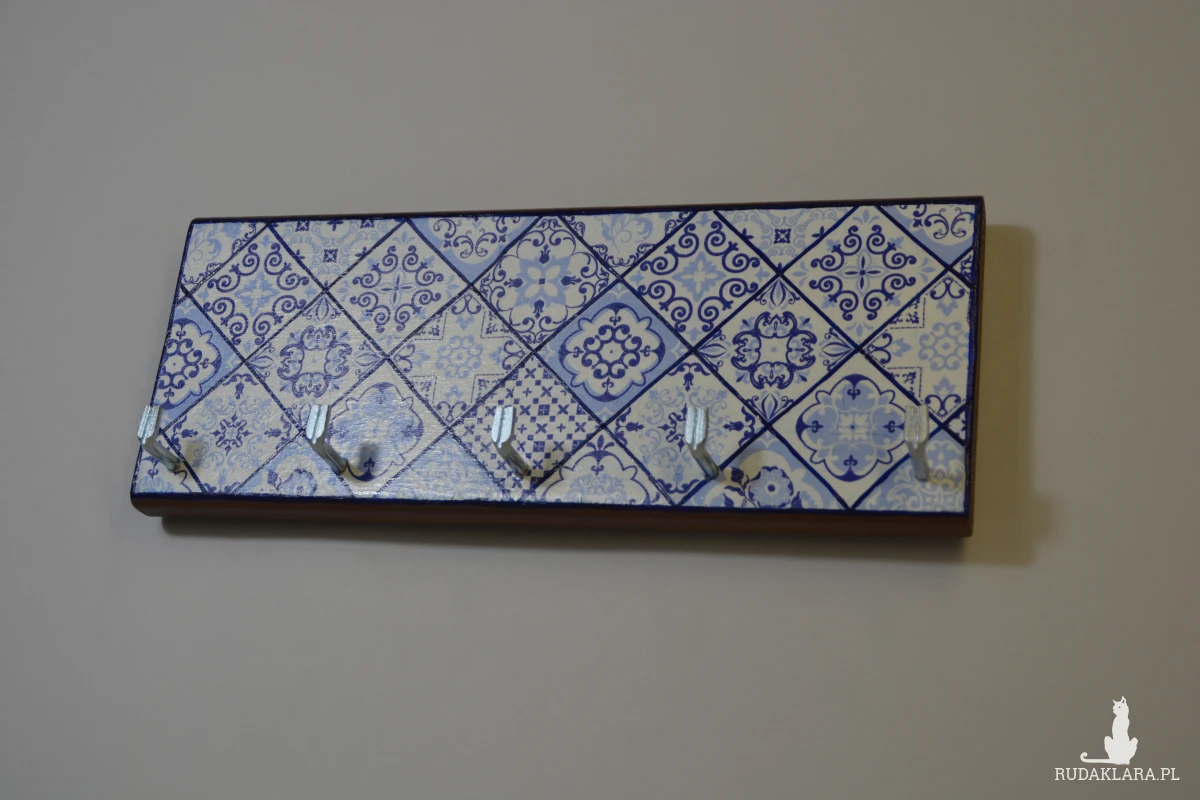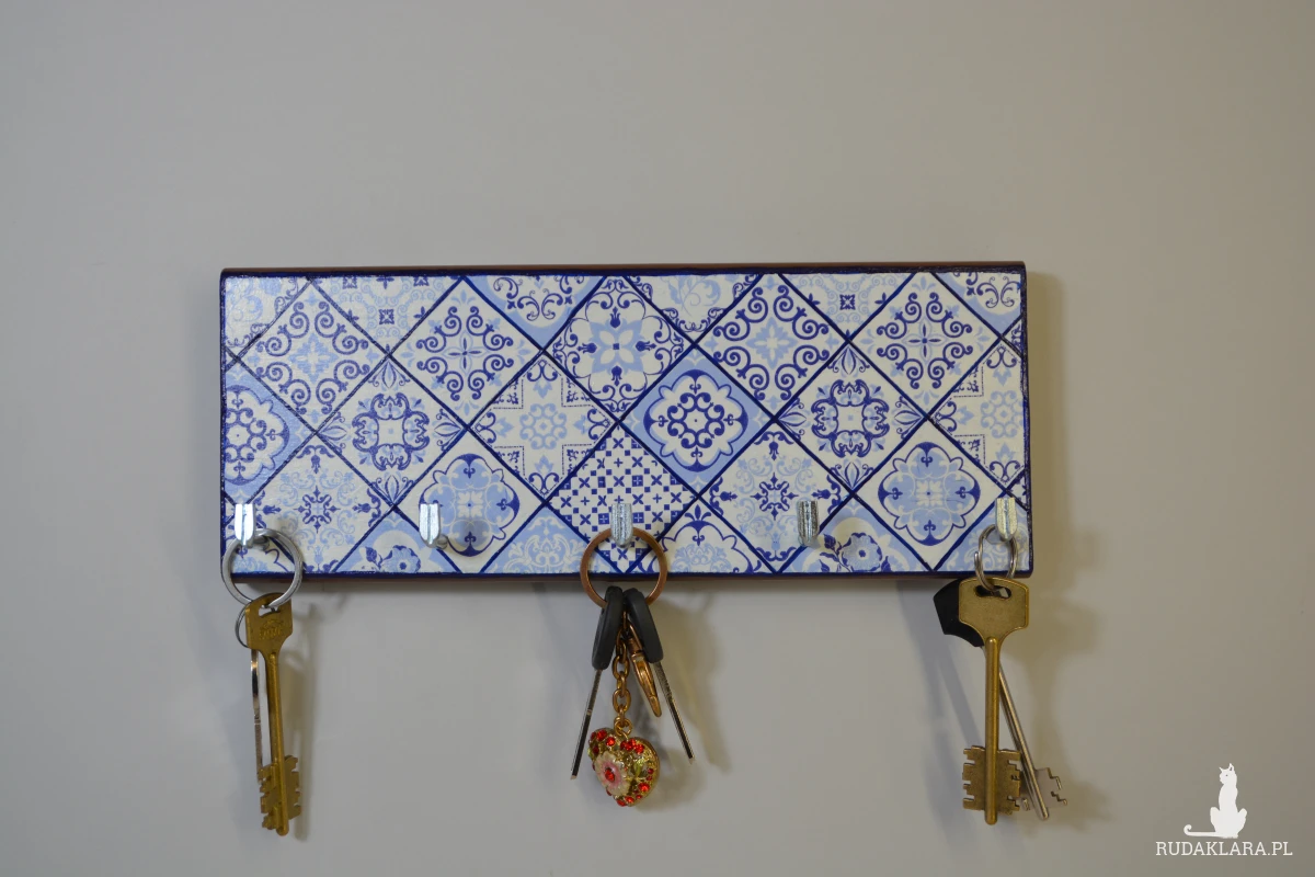 Dodaj swojemu wnętrzu stylu i funkcjonalności dzięki temu ręcznie wykonanemu drewnianemu wieszakowi na klucze, ozdobionemu techniką decoupage w klasycznym niebiesko-białym stylu azulejo.